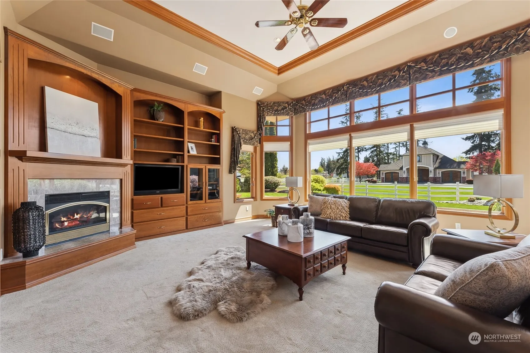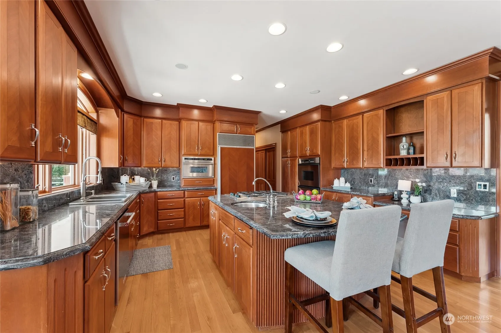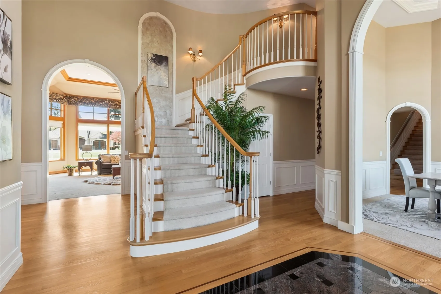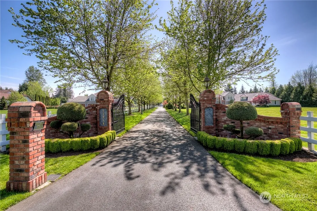 Unparalleled retreat nestled within a gorgeous 3-acre gated estate. The estate has been thoughtfully laid out with its formal tree-lined drive, timeless architectural styling, elegantly landscaped grounds, detached shop/garage with car lift & 1/2 bth, & beautiful cedar-lined barn. Crafted by a master builder, no expense has been spared in selecting the finest materials, promising enduring elegance. The main floor primary suite boasts a walk-in tile shower, indulgent jetted soaking tub, coffered ceilings, expansive wardrobe room, & private deck. High ceilings throughout the home impart a grand ambiance, balanced by the warm of rich woodwork. Beautifully appointed chefs kitchen w/premium appliances, buffet, wine storage, & bespoke cabinetry.