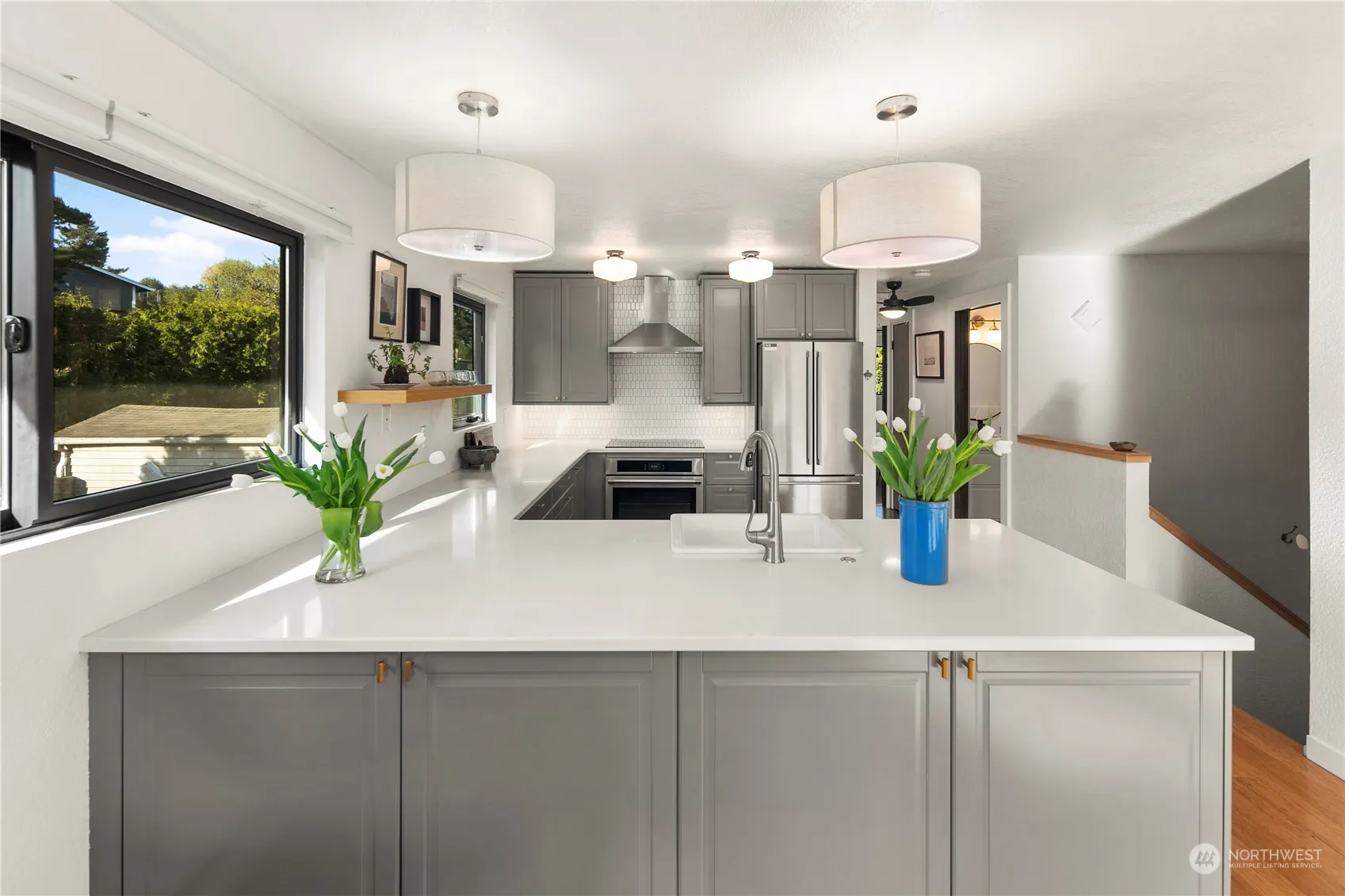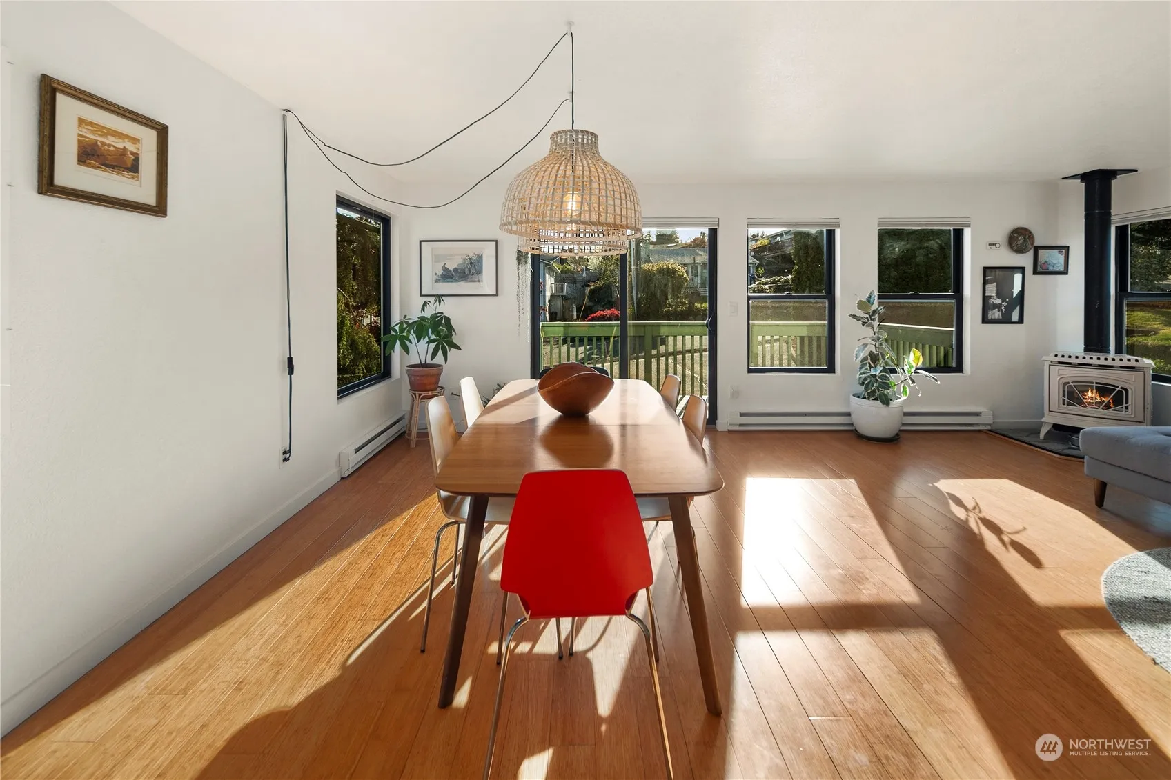 Stunning 8,500 Sq.ft. corner lot w/Mt. Rainier view. Updated split-level home with new kitchen with quartz countertop, stainless appliances, open concept floor plan with bamboo floor, deck off the living room, cozy stand-alone stove. Ample natural light west facing, new double pane windows throughout. Beautiful modern bathrooms and comfortable bedrooms. Installed Solar Panels, low electrical bills under $10/mo. Third bedroom downstairs, setup as a rec room. Attached two car garage, great for storage, fitness/workshop space. Fully fenced backyard, patio, garden beds and shed. Huge side yard, perfect for your entertainment or future ADU. Minutes to downtown Des Moines beach, Marina, restaurants, Angle Lake light rail, SeaTac airport, I-5.