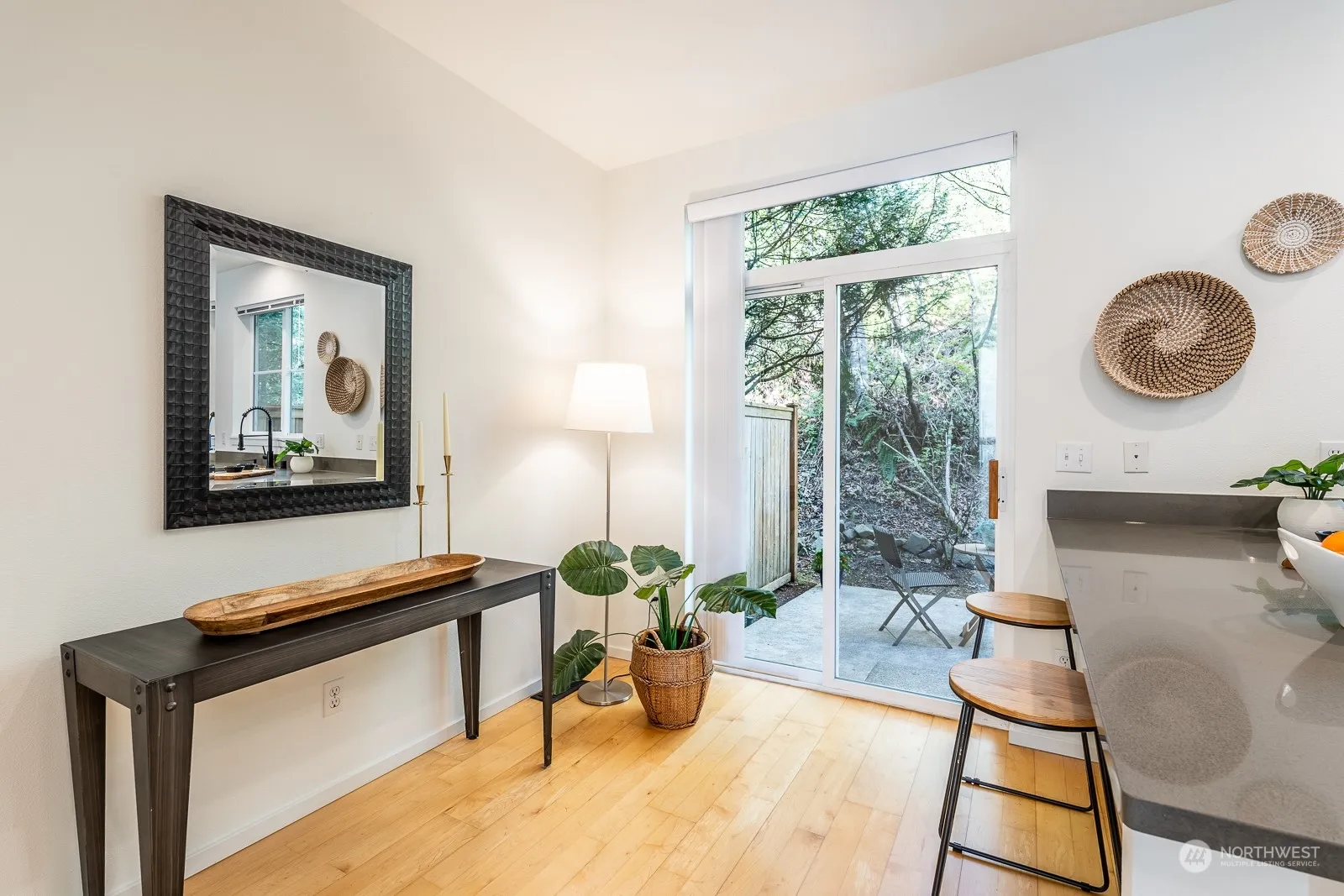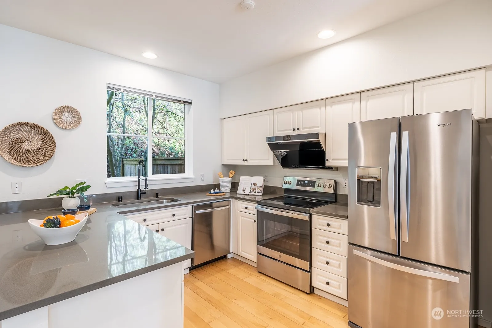 Spacious and updated stunner at Meadowview Village steps away from Bella Bottega, Sammamish River Trail and close to future light rail and all-things Redmond. Natural light lovers rejoice—large west-facing windows from living room and primary suite. Private patio off kitchen backing to greenbelt for total privacy. Remarkable 9’ ceilings and modern fixtures throughout. Updated kitchen w/quartz counters, bar seating and breakfast nook. Serene primary suite w/ample space for office nook, vaulted ceilings and double closets. 2-car tandem garage w/additional storage, plus 2 driveway spaces and plenty of guest pkg. Tankless H2O, gas fireplace and central AC provide comfort and joy. New carpet and more (see complete list). Pets OK. No rental cap!
