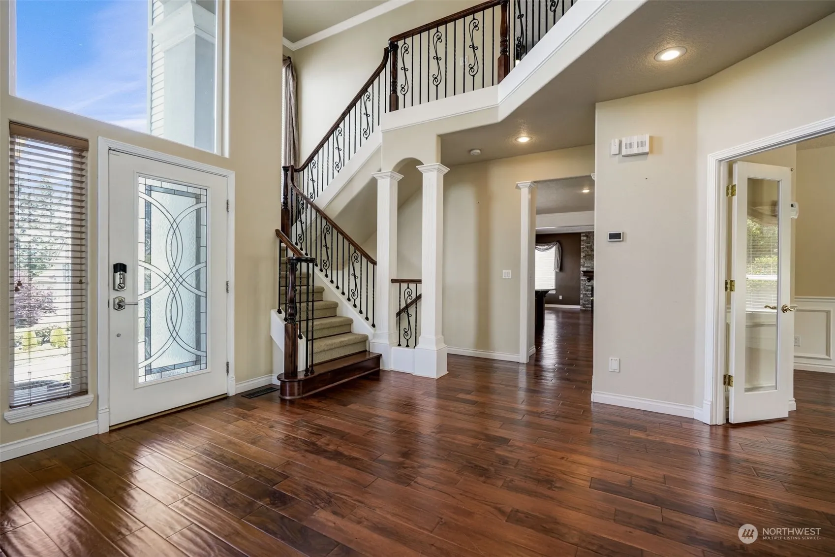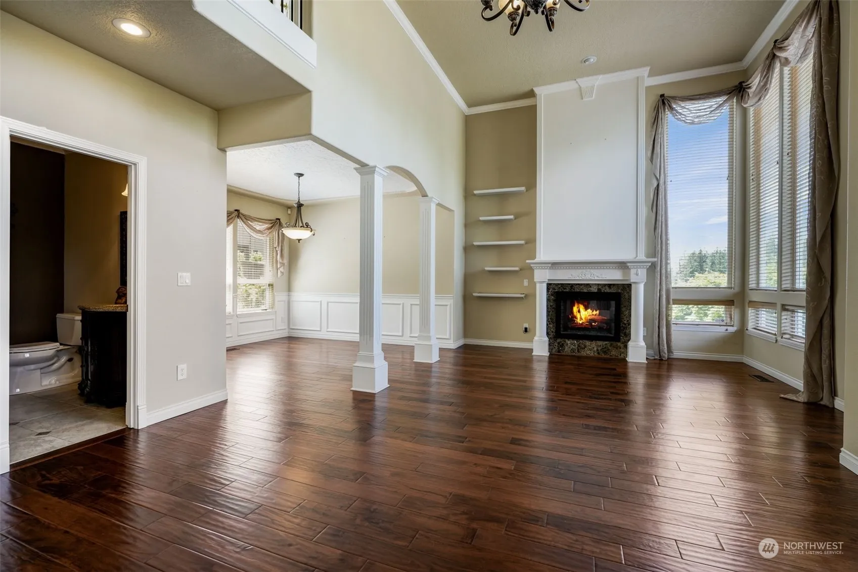 A full-lite leaded glass keyless entry door welcomes you. Formal living room features an electric fireplace with granite tile surround and transitions seamlessly into the formal dining room with wainscoting. Great room includes a family room with a gas fireplace and a high tray ceiling. Island/breakfast bar kitchen with stainless appliances, granite counters and walnut finish cabinetry. Primary en-suite offers French doors, walk-in closet, dual sink tiled vanity, jet tub, shower, private water closet, mountain views. 3 additional bedrooms, 1 possible den/office. Outside, enjoy a covered patio with an electric fireplace and outdoor kitchen. 3-car garage with EV charger, 500 plus sf crawl space with potential for conversion.