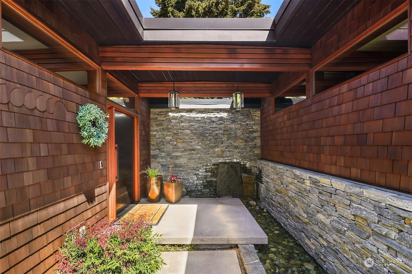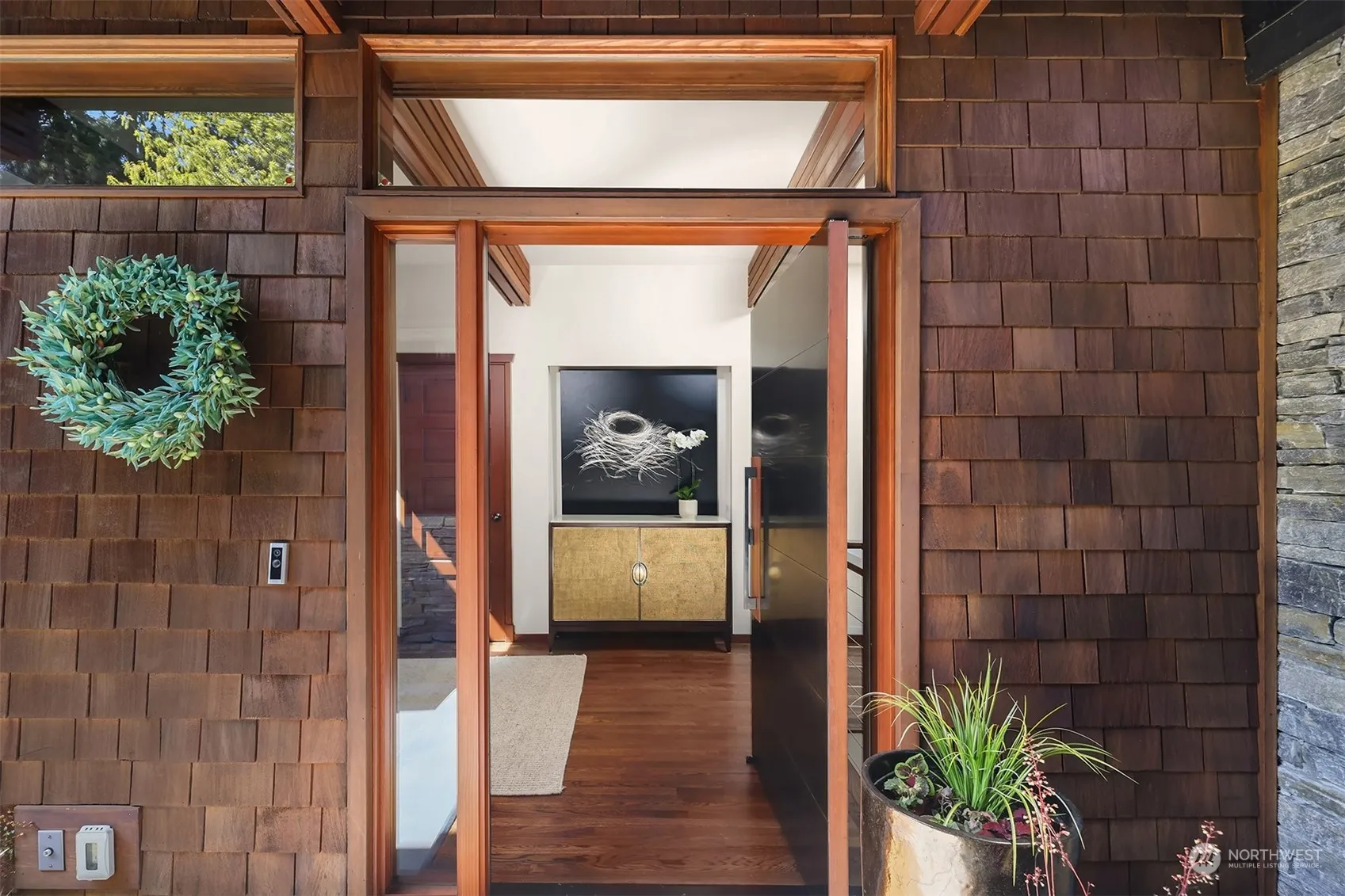 A sanctuary on Clyde Hill, this classic shingled home offers lake views, unparalleled privacy, and stunning sunsets. Remodeled in 2018, stylish interiors blend with timeless NW architecture, featuring hardwood floors, designer lighting, handsome cedar beams and a luxurious ambiance. The kitchen showcases waterfall counters and state-of-the-art appliances. The main level primary suite is a masterfully designed retreat. Detached 4th bd/flex with attached bath and kitchenette is ideal guest studio/office/gym and exceptionally versatile for multi-generational living and hosting guests. Private entertaining decks and yard are perfect for al fresco dining and outdoor gatherings. A remarkable home offering luxury, privacy and beauty.