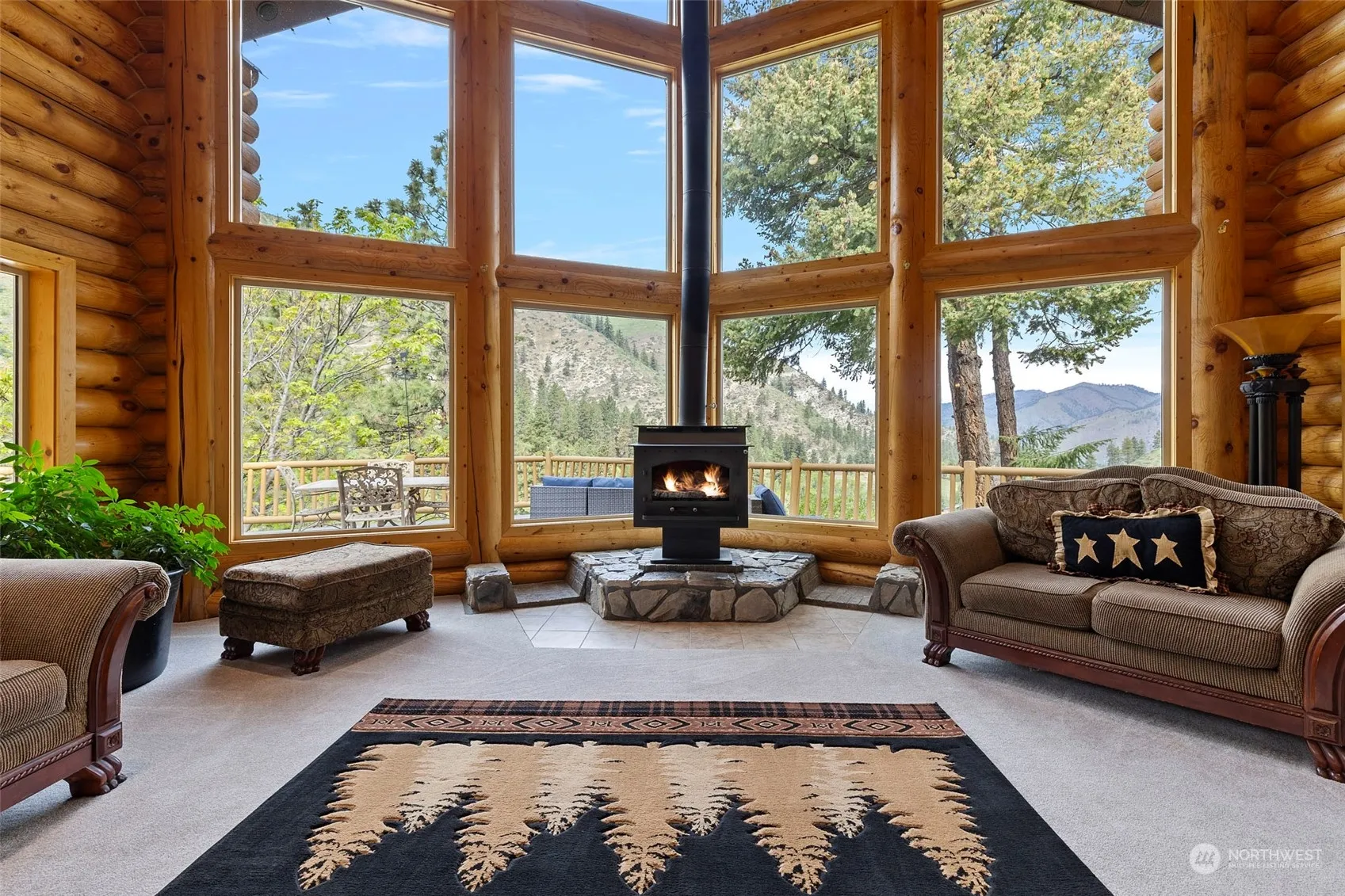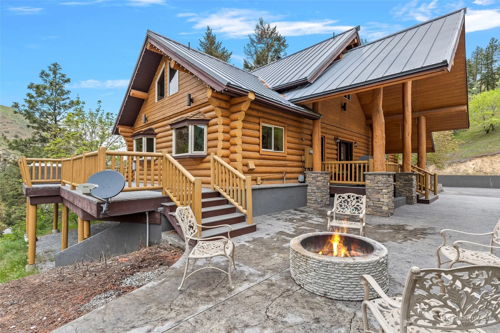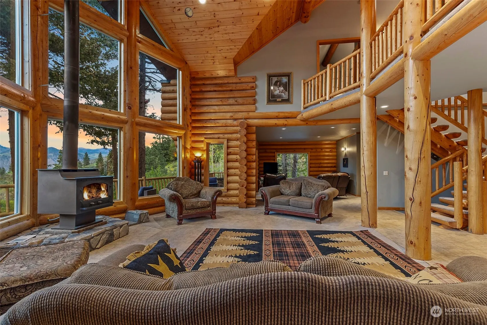 Exquisite Custom Log Home offering 4,185 square feet of living on 6.14 acres with stunning mountain and territorial views! Large great room, gourmet kitchen with open concept, fireplace, vaulted ceilings, bedroom & bath on main floor. Enjoy the views with expansive deck setup for entertaining, hot tub & large fire pit. Upstairs you will find the Primary suite w/ jetted tub, walk in closet & a large loft for hobby or living space. Daylight basement offers second living area/game room, family room & 2 bedrooms. Massive 4,000 square ft. shop with 6 bays, heated floors, office/storage/paint booth, automobile lift, welding area & large RV Bay. New 6 bedroom septic. House permitted for 12 person STR!