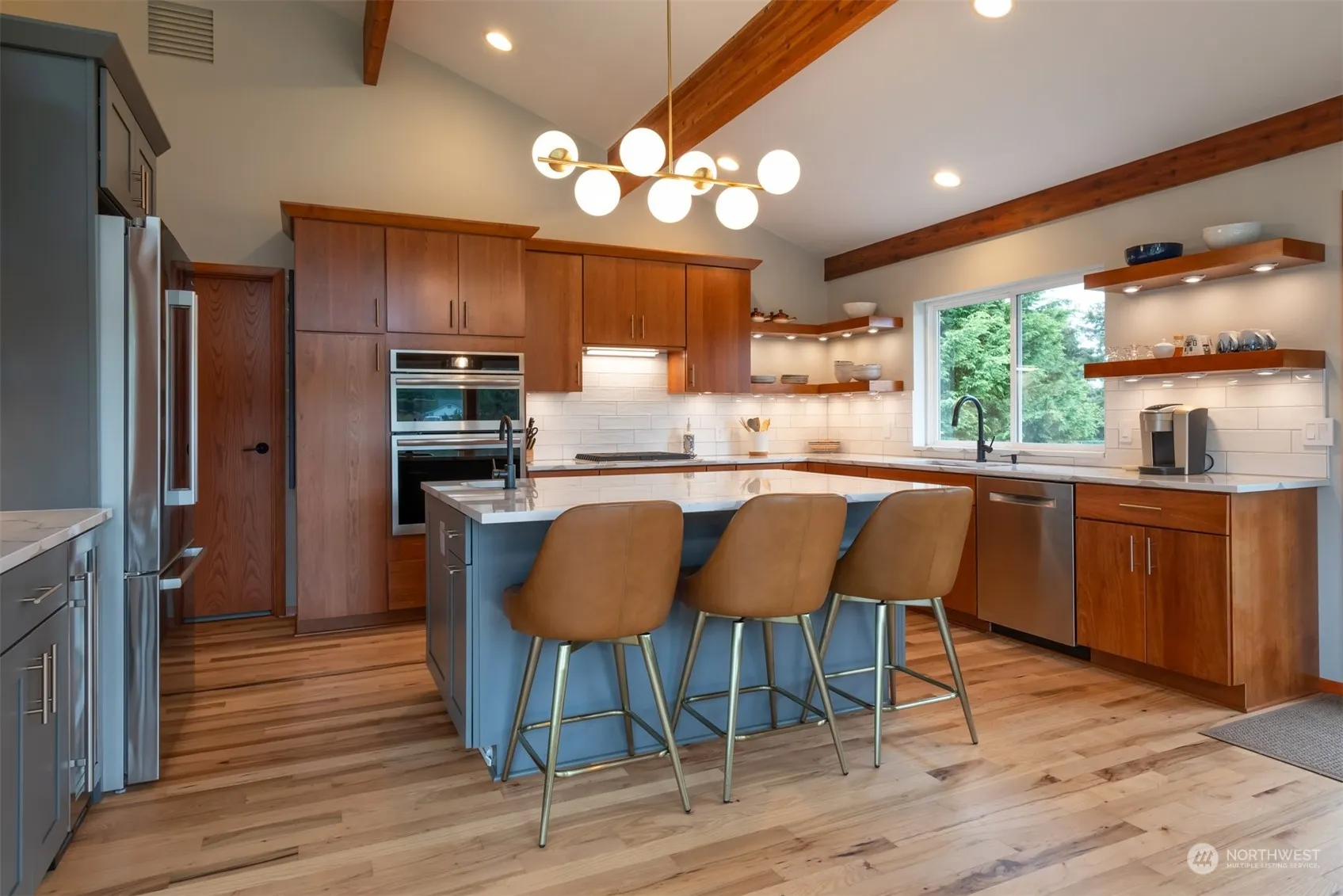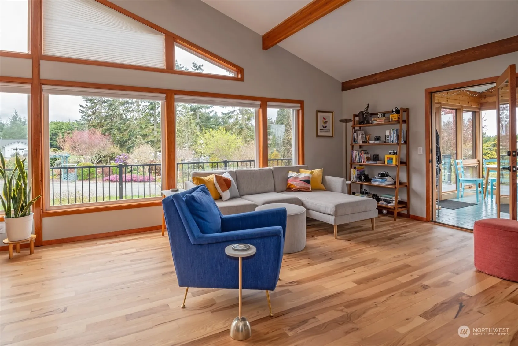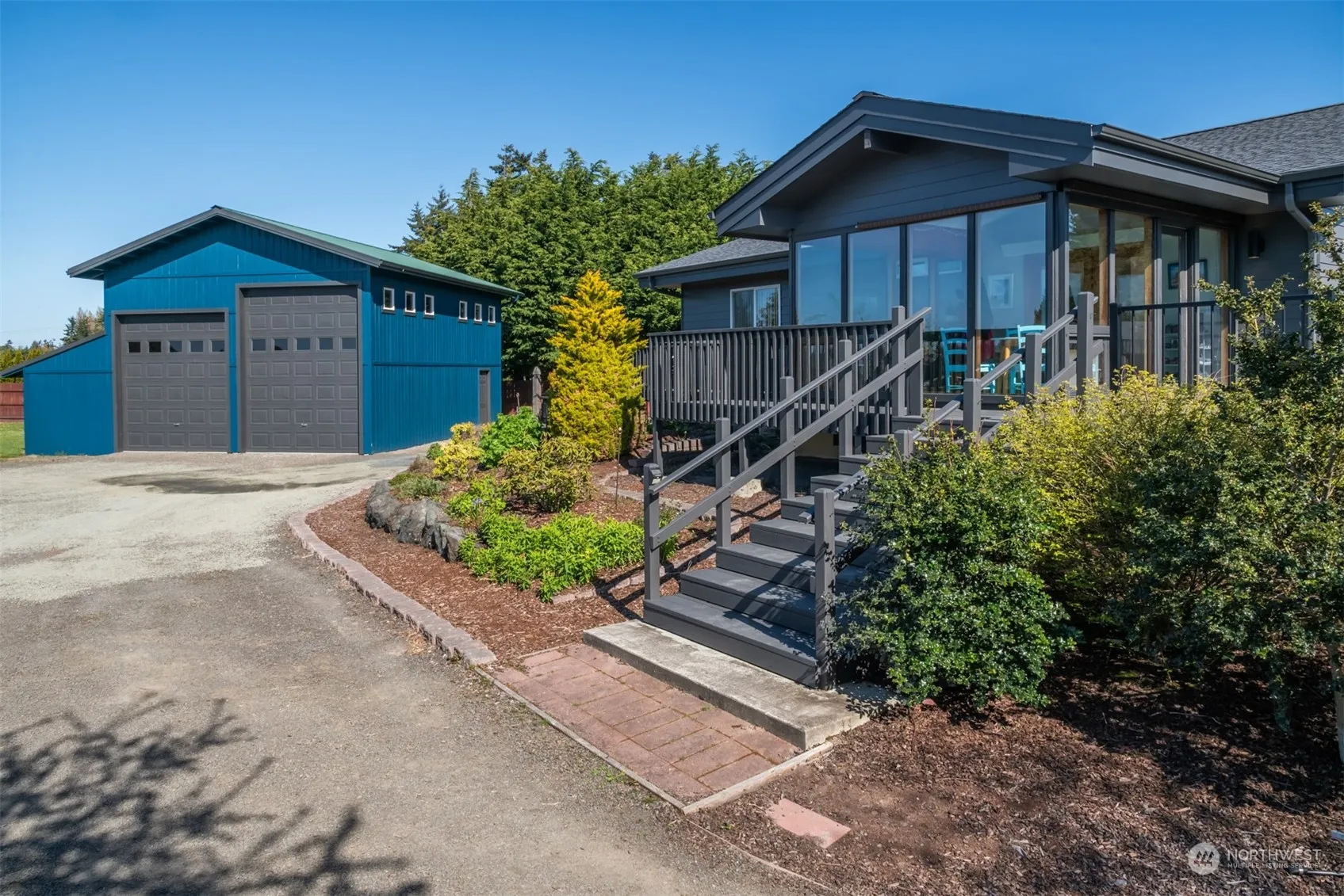 Pristine Lindal Cedar Home with outbuildings and updated kitchen & bathrooms. Perfectly situated, south facing for bright views, plus west-facing sunroom for year-round nature, pizza, and sunsets. Vaulted ceilings, custom kitchen with prep sink and under counter vacuum, plus designer bathroom with Bluetooth audio system. Mature, irrigated garden, two detached garage/shops, 50 amp RV hookup, and garden shed. Lower level is your office suite, playroom, home gym and more. House has a 4BR septic system for potential additions. Near Agnew Grocery & Discovery Trail; in Sequim School District. AHS Home Warranty for Buyer.