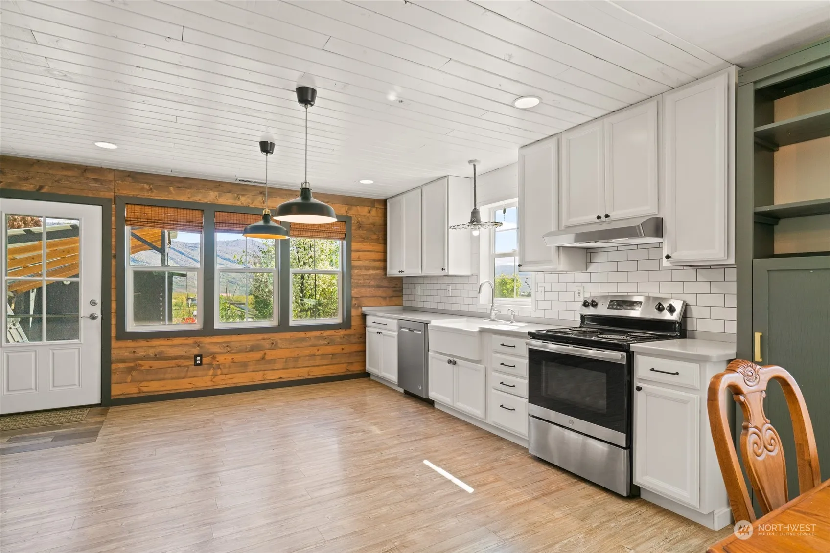 Stunning 360-degree views of the Okanogan Valley and Cascade Mountains. This beautiful turnkey rambler features down-to-the-studs remodel in 2016 with modern farmhouse design. Large entryway and mud room leads to the open-concept great room w/ wood-burning stove. Updated vinyl windows boast mountain views & fill the space w/ natural light. Expansive kitchen offers stainless appliances, farmhouse sink, subway tile backsplash & shiplap accent wall. Primary bedroom includes 3/4 en suite bath. Property features fenced pasture, large shop with power, outbuildings, chicken coup & garden area. Enjoy relaxing outdoors with views from your sun deck, patio & covered porch. Only 10 minutes to downtown Omak. Perfect homestead & hobby farm opportunity!