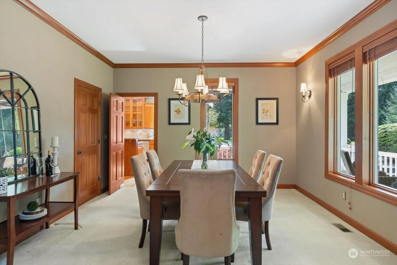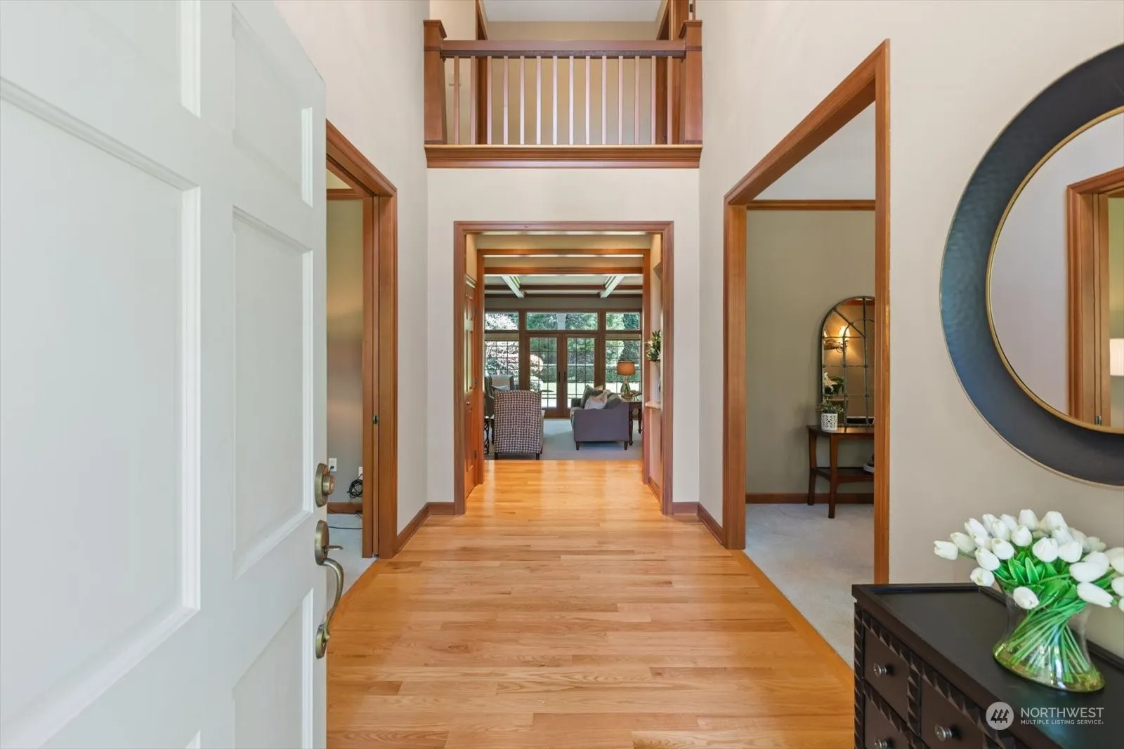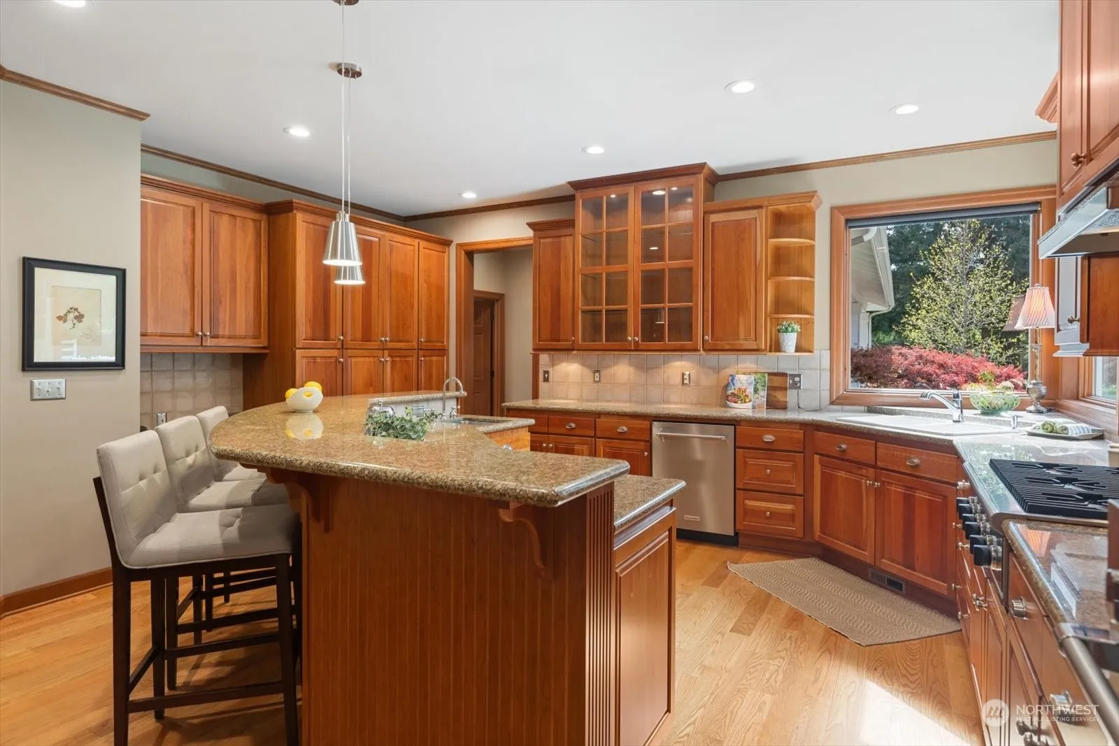 Dreamy, private, parklike setting w/custom home; lives like a rambler, main floor primary with double walk in closets; huge primary bath with double vanities; soaking tub, walk in shower; 1/2 bath off kitchen; 1/2 bath off living room; 2 bedrooms & 3/4 bath up; main flr bonus room, office, living room, casual dining w/french doors to patio and covered bbq; formal dining thru butler door off gourmet kitchen; cherry cabinetry, hardwood floors, granite counters & high end appliances; over 2 acres of manicured landscape surround the home; covered patio for year round grilling and outdoor living. Oversized detached 3 car garage with covered breezeway to home. Additional tax parcel/building lot allows privacy, build or sell (buyer to verify)