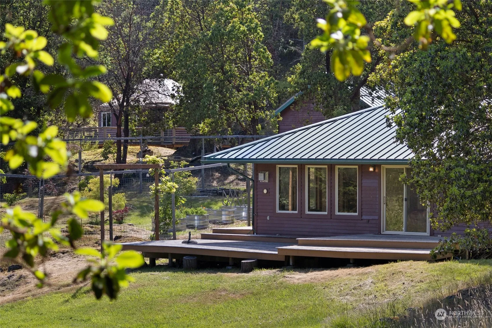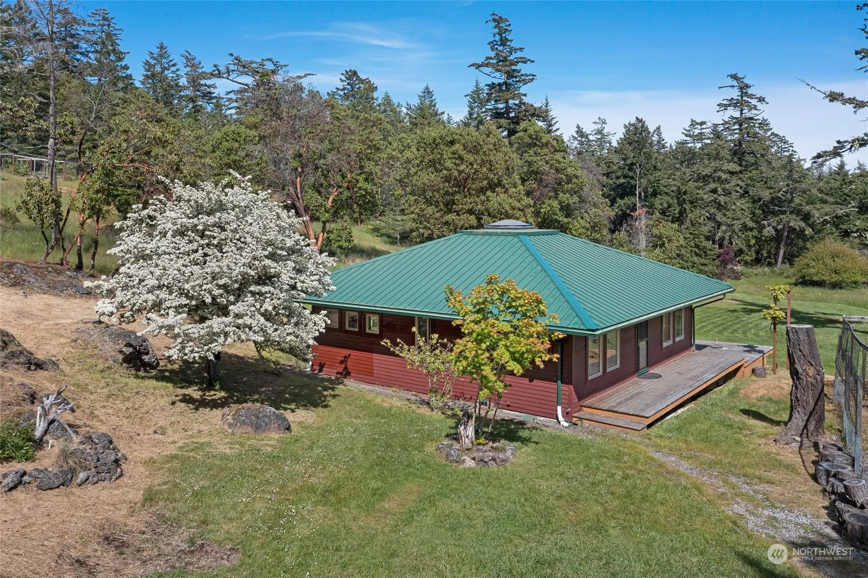 Private and quiet. This beautiful property on the enchanting Westside has over 10 acres of secluded bliss. No visible neighbors except foxes playing in the meadow, deer and eagles. This natural haven boasts beautiful, flourishing gardens, and a delightful, terraced orchard. Nestled within this idyllic setting is a charming 2-bedroom, 1-bathroom home with terracotta tiled floors, skylights, and windows that invite the outdoors in. Step onto the deck and behold sweeping views of the meadow leading to the serene pond. This property also features an oversized 2-car detached garage and a 600 sq. ft diameter yurt with generous deck and bathroom facilities for art, exercise, and guests.