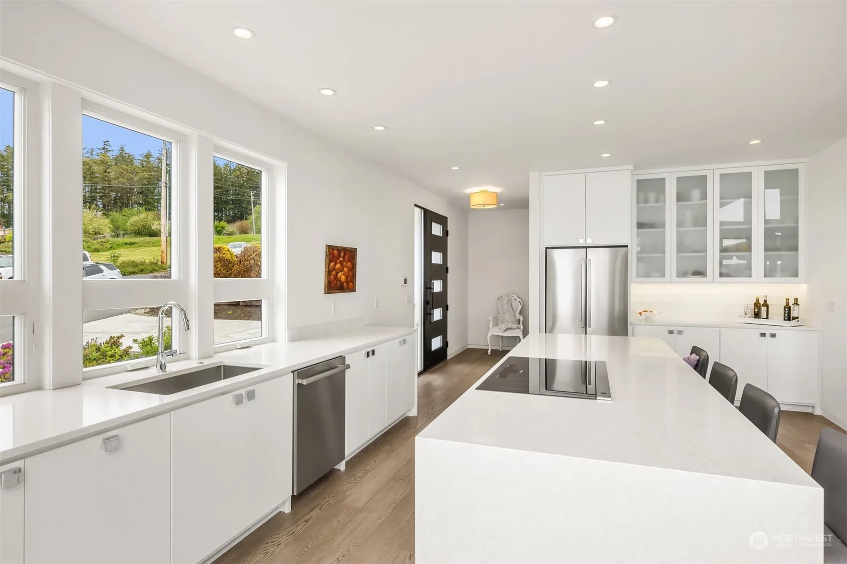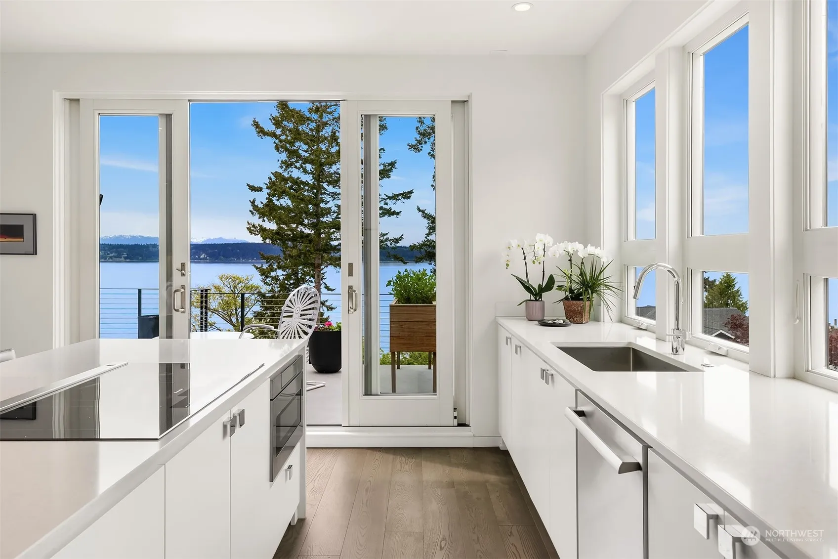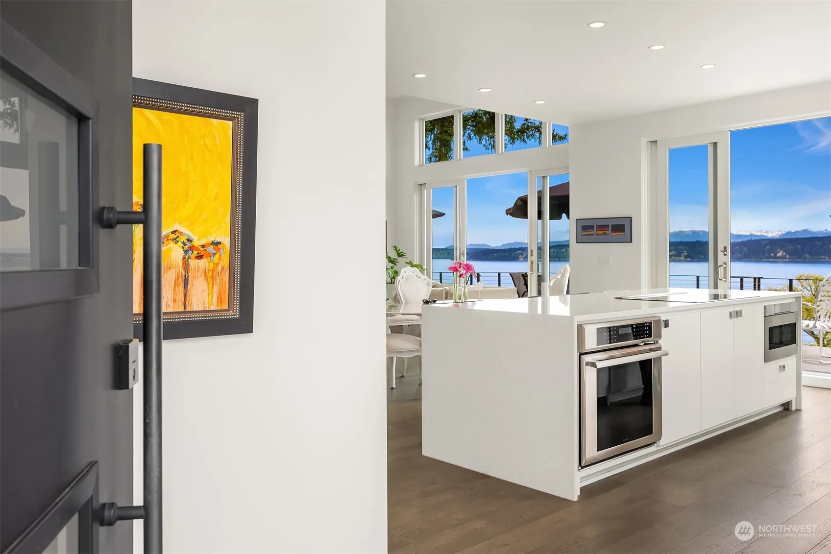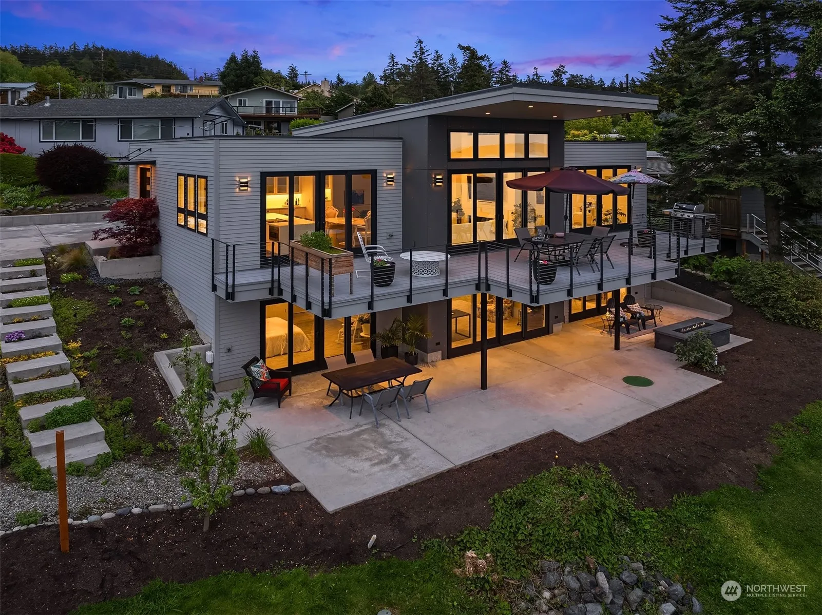 Experience the epitome of LUX living and breathtaking sunsets at Manaco Beach! Revel in the expansive 180-degree WATERFRONT views spanning across Saratoga Passage, from Whidbey Island and the Olympics. This exceptional custom build coupled with luxury through its exquisite finishes and architectural elements offers radiant heated floors throughout and a main-level primary bedroom. The lower level presents a versatile bonus room complete with kitchenette, currently utilized as guest space with additional living space. Unwind on the expansive steel framed cantilevered deck stretching the length of the home. Steps away lies your private beach, granting effortless access to the beach and you’re own mooring buoy + ample space for storing kayaks.