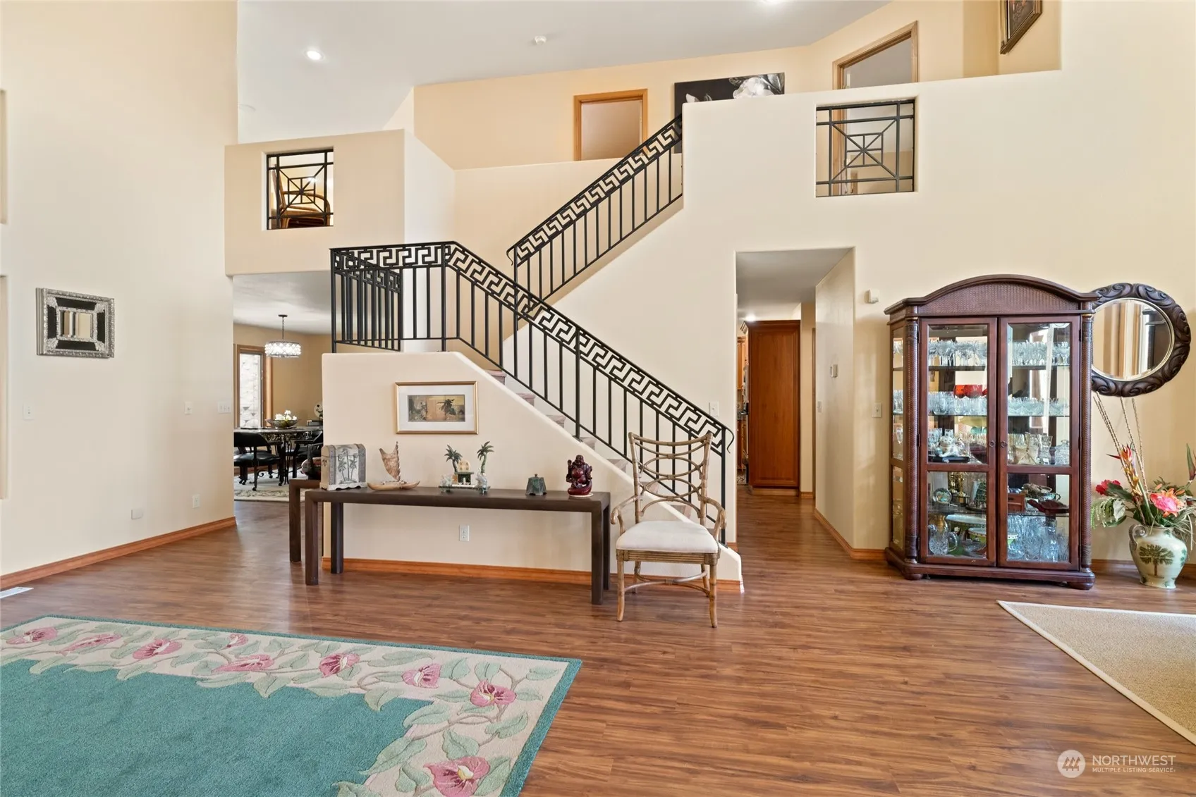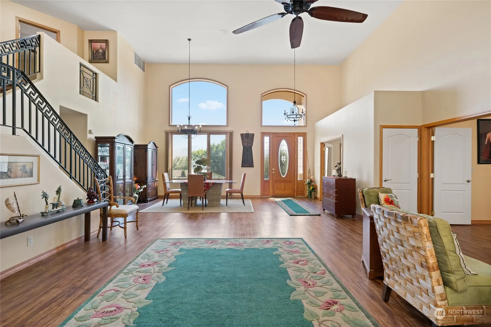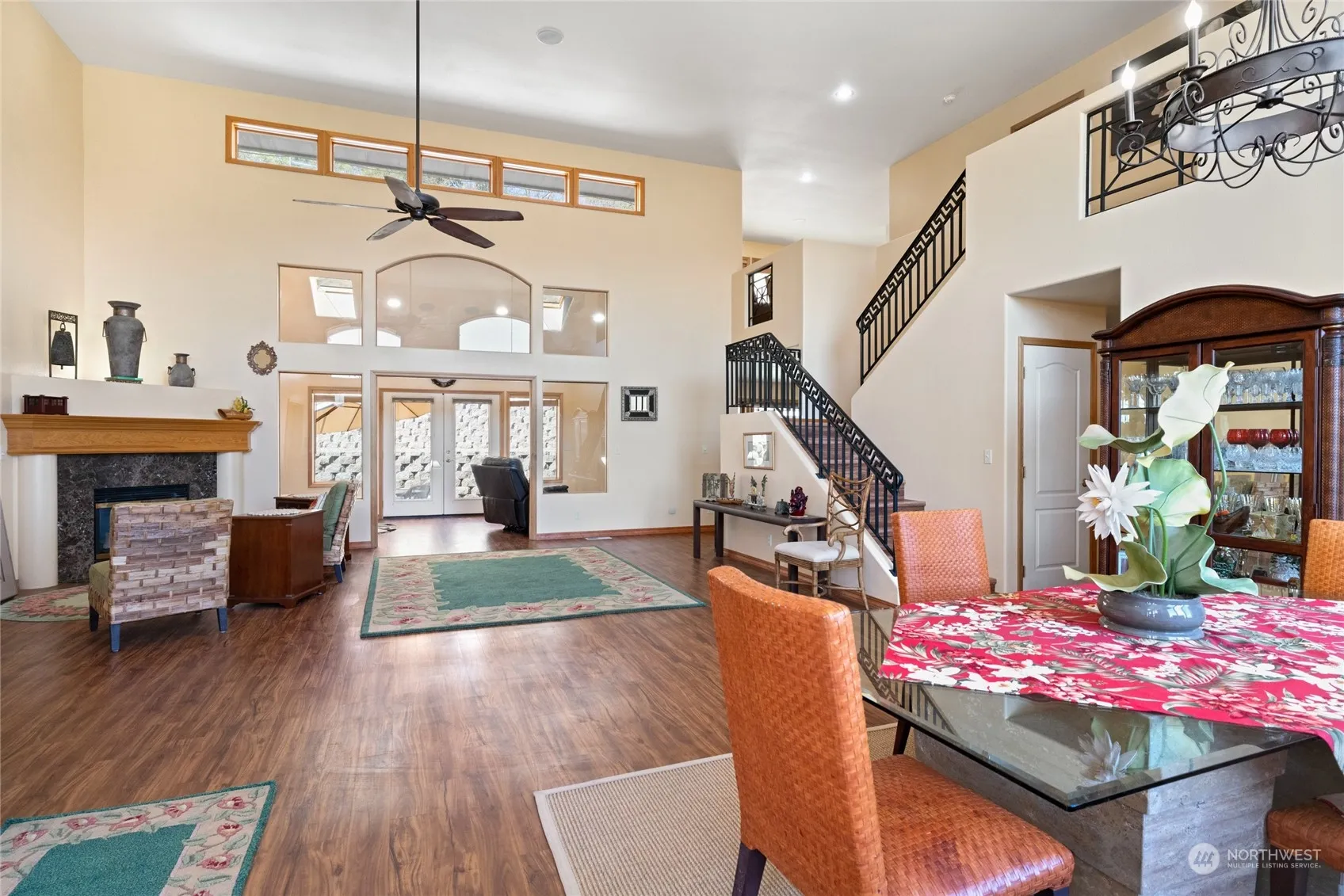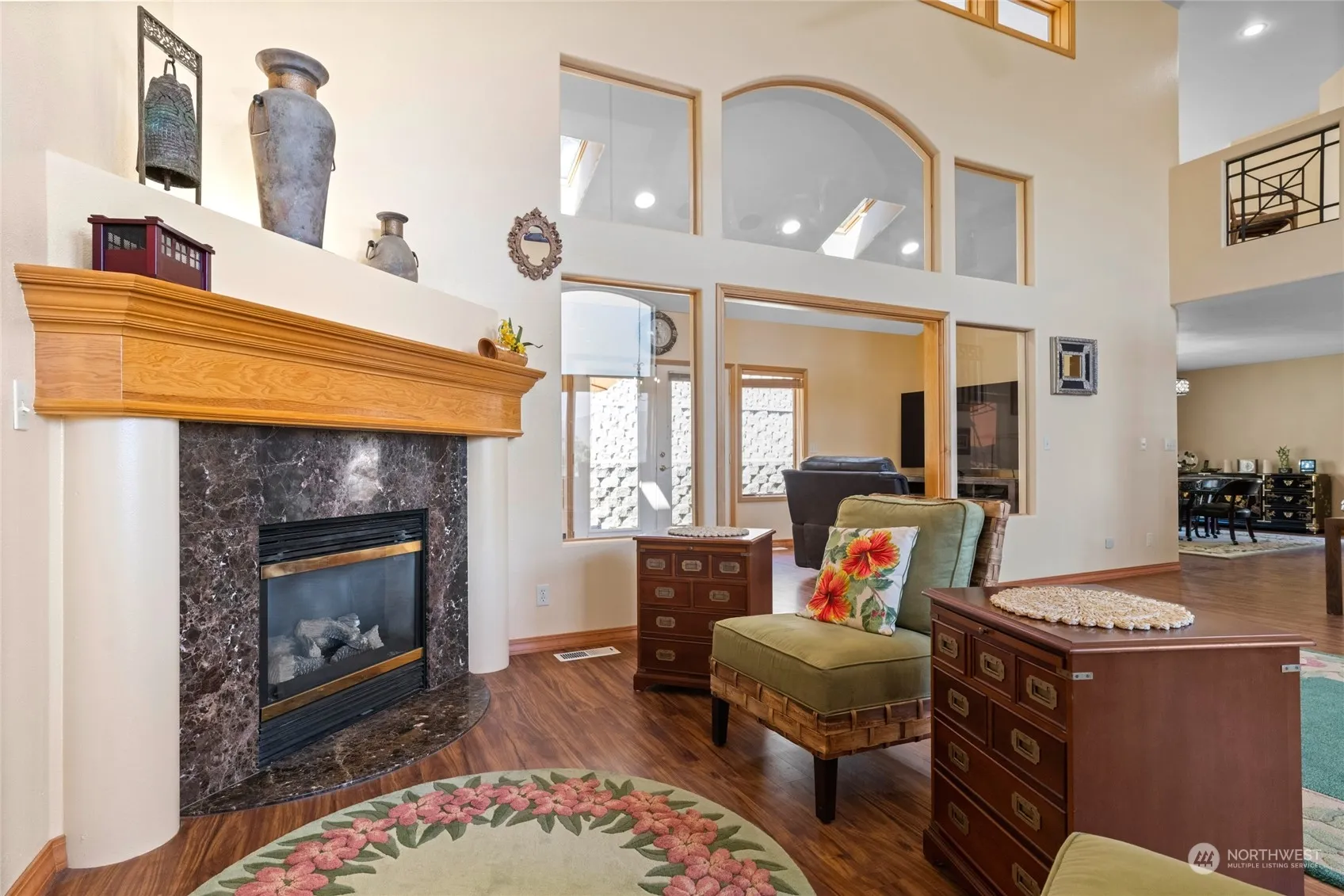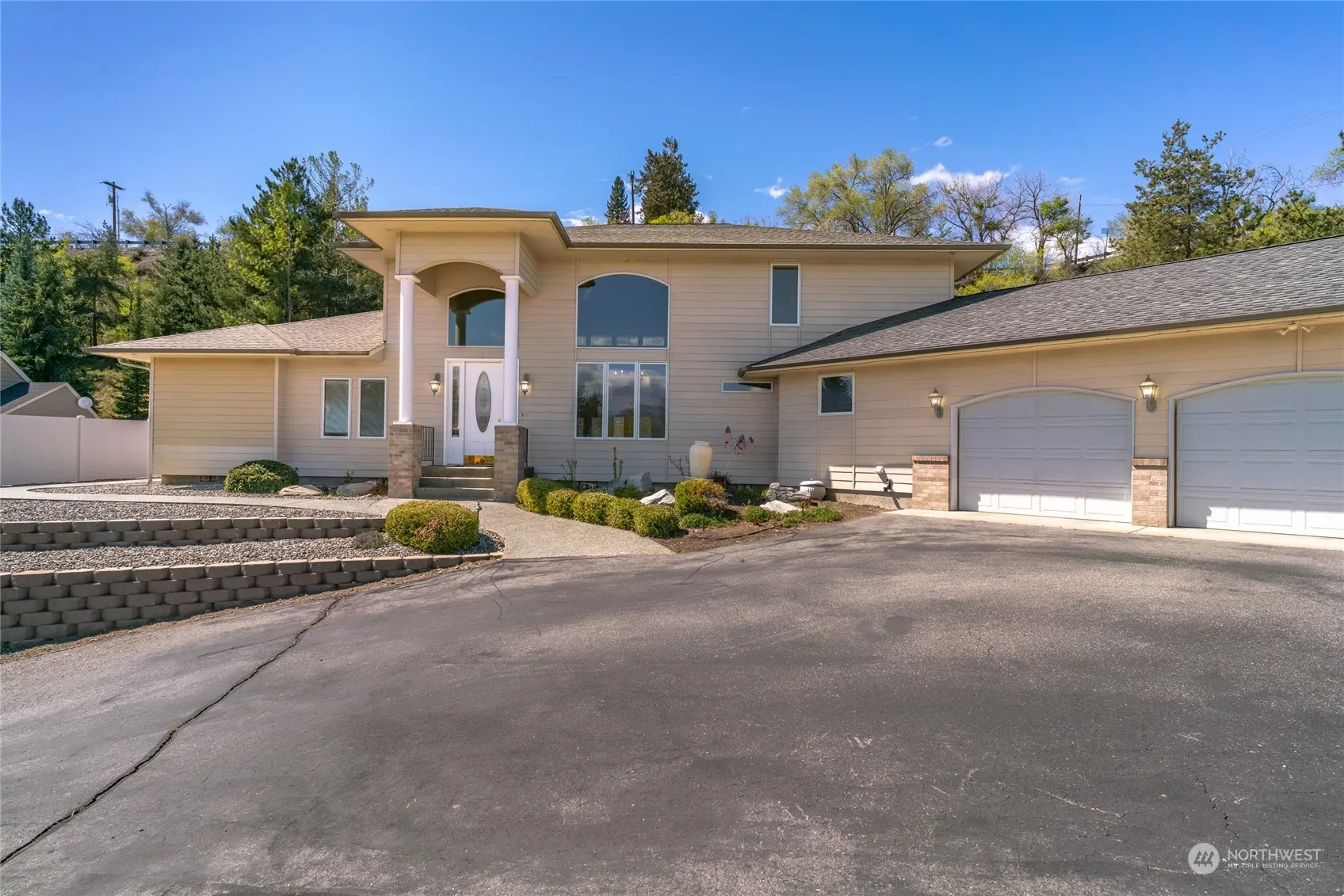 Grand luxury Omak home with impressive list of upgrades and special features. This meticulously maintained custom build offers 18 ft ceilings & stunning new hardwood floors. Gourmet kitchen features stainless/granite, sub-zero refrigerator, gas cooktop, wet bar with wine cooler, solid wood cabinetry & walk-in pantry. Expansive main floor primary offers California closet, double granite vanity, tiled walk-in shower & private toilet. Water softener, central vac, security system & wiring for sound system throughout. Space for multiple home offices, den, family or media rooms. Incredibly private yard with wrap-around terraced retaining walls, large patio, irrigation, BBQ hook up, auto sprinklers & quiet cul-de-sac location.