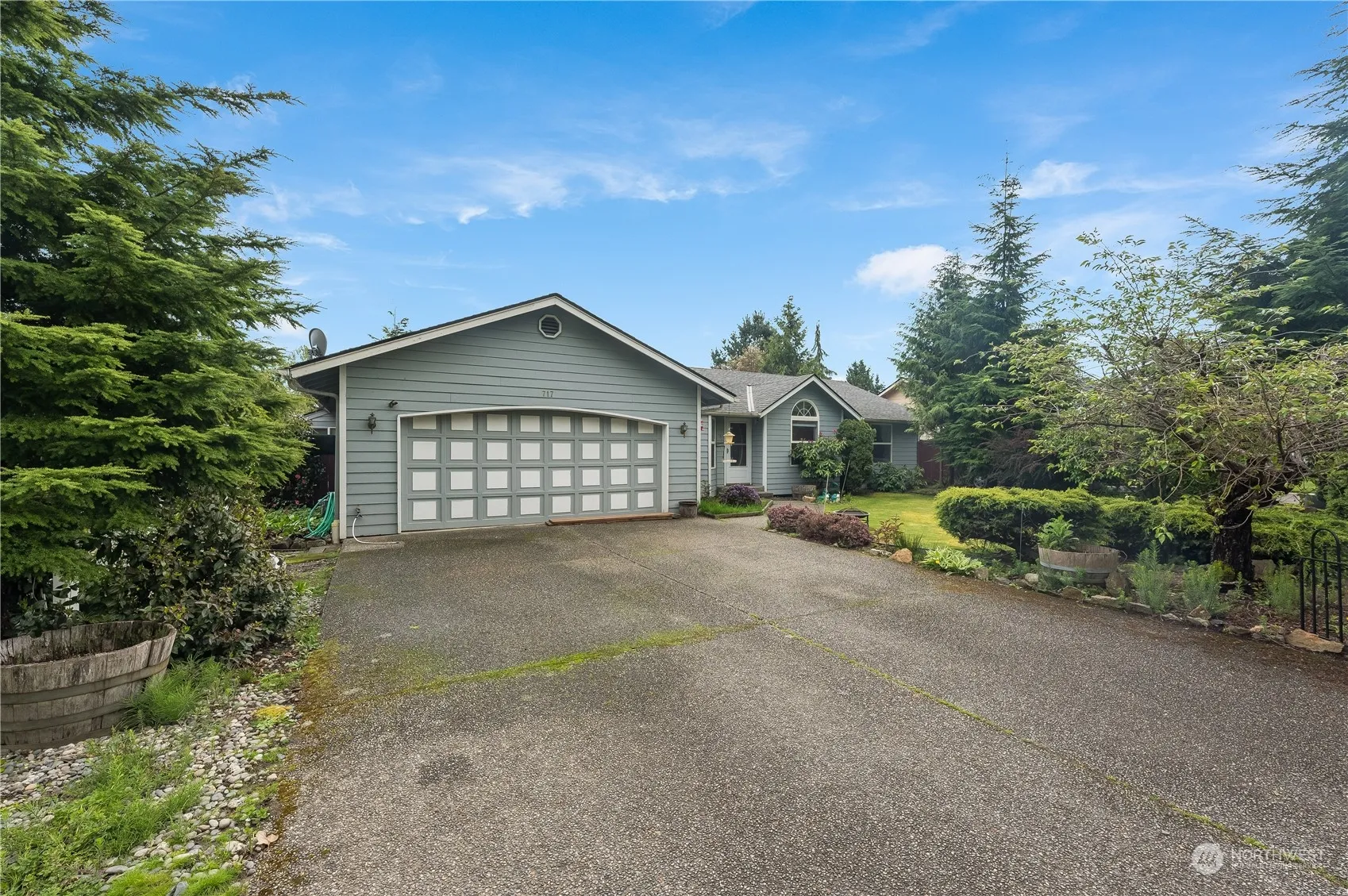 Rambler, with fully fenced large level lot and plenty of garden space. Two driveways (1) is covered and fenced for your RV/boat parking and (1) for the double car garage with shop space. Formal living room with gas fireplace and large windows for bird watching. Kitchen w/garden window opens to the great room with sliding glass doors to a huge covered deck with skylights. Bonus room thru french doors in great room can be used as an office with an exterior door. Primary bdrm with en-suite bath,primary walk in closet was converted to shelving for storage and 2 closets were added in the bedroom. Home was once 3 bdrms and can be again by adding a wall in the formal dining room. Public transit at the corner Route#300. Stores and eateries near by.
