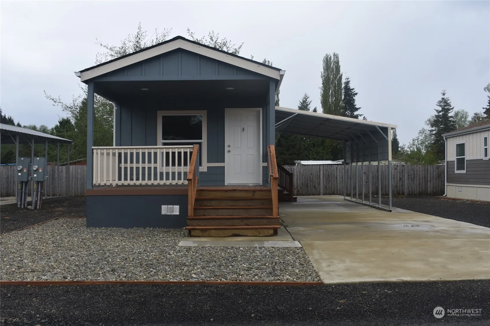 Move-in ready, 2023 model home offers 1 bedroom and 3/4 bathroom. Inviting covered deck on front for viewing amazing sunsets. Natural light throughout open-concept living space. W/D hookups. Kitchen has a breakfast bar for additional seating. All stainless steel appliances included. Concrete pad for parking with carport. Ease of access to public transportation as park is right on bus line. Buyer is responsible for sales tax on purchase price.