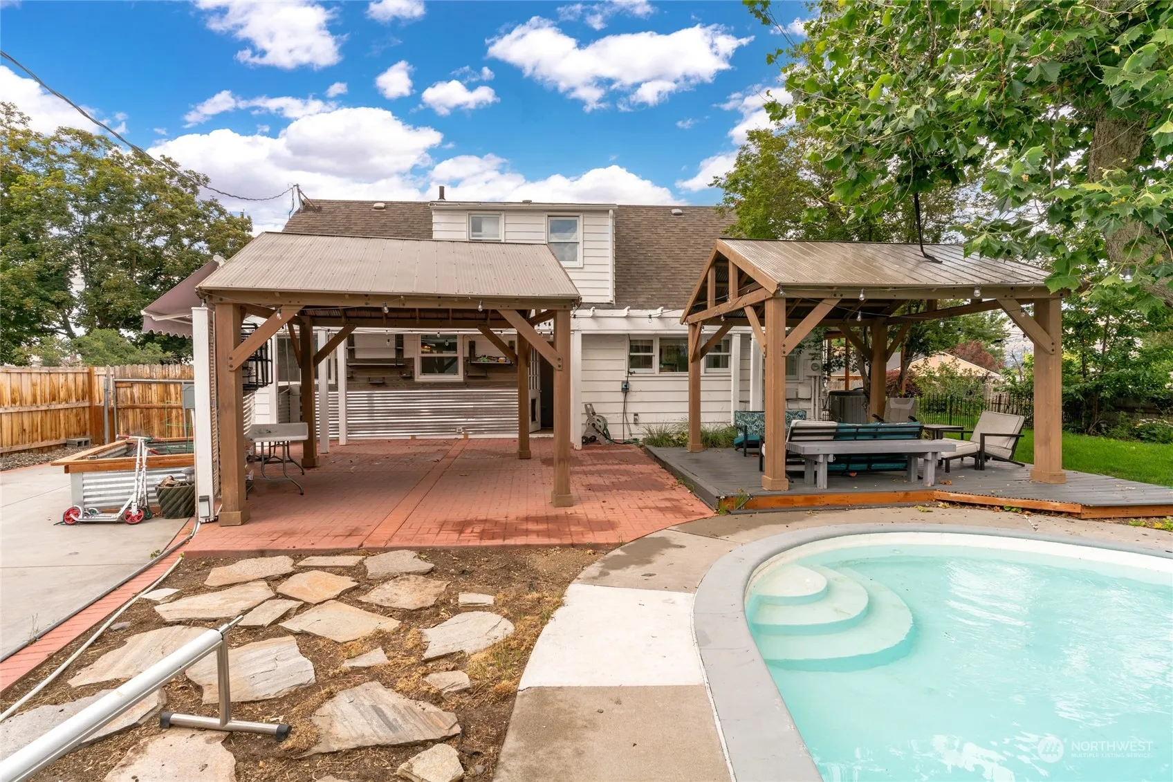 You will love this surprisingly spacious brick home with charming features and updates throughout hardwood floors, a wood burning fireplace in living room, with great separation of space on three levels. Main level features bedroom and full bathroom with 2 bedrooms upstairs with charming dormers and one with a large view deck to enjoy watching the fireworks in summer. Full basement has huge family room and laundry room and tons of storage. Enjoy summer with your in ground pool with covered porch and deck. Room to park RV and play basketball in concrete driveway. Very clean detached garage with work bench also perfect for working on projects. Lovely landscaped gardens and flowers make this backyard an oasis right at home.
