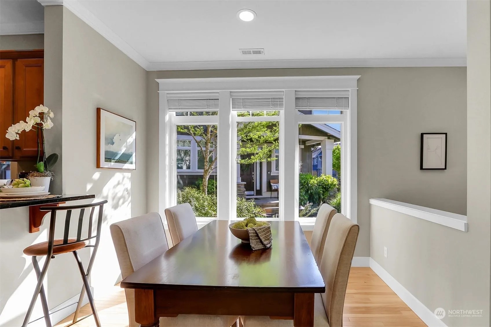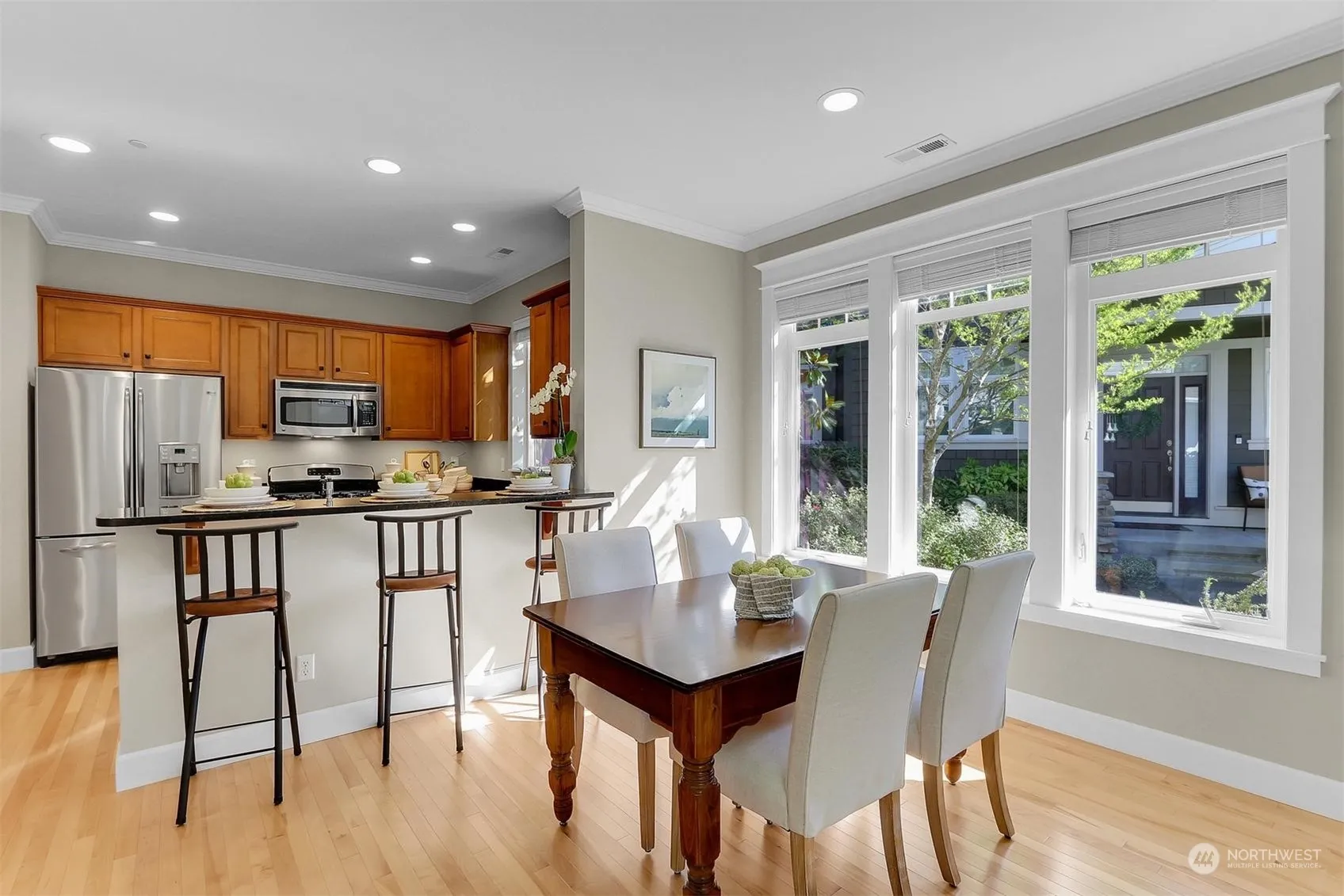 Charming Arboretum at Vista Park townhome blends sophistication with timeless elegance. You will be captivated by the attention to detail and the gracious open floor plan. The prime SW-facing end unit enjoys an abundance of natural light even on the cloudiest of days. Lovely maple floors on the main along with custom crown/window moldings. Granite countertops & stainless appliances grace the kitchen. Upstairs is newly carpeted with a spacious prim. bedroom and 5 piece spa bath, a guest bedroom w/full bath as well as a separate walk-in closet that could double as an office/nursery. Spacious 2-car garage and central A/C! The perfect location just steps away from shops, restaurants, transit, cinema and parks. Enjoy the perfect NW lifestyle!