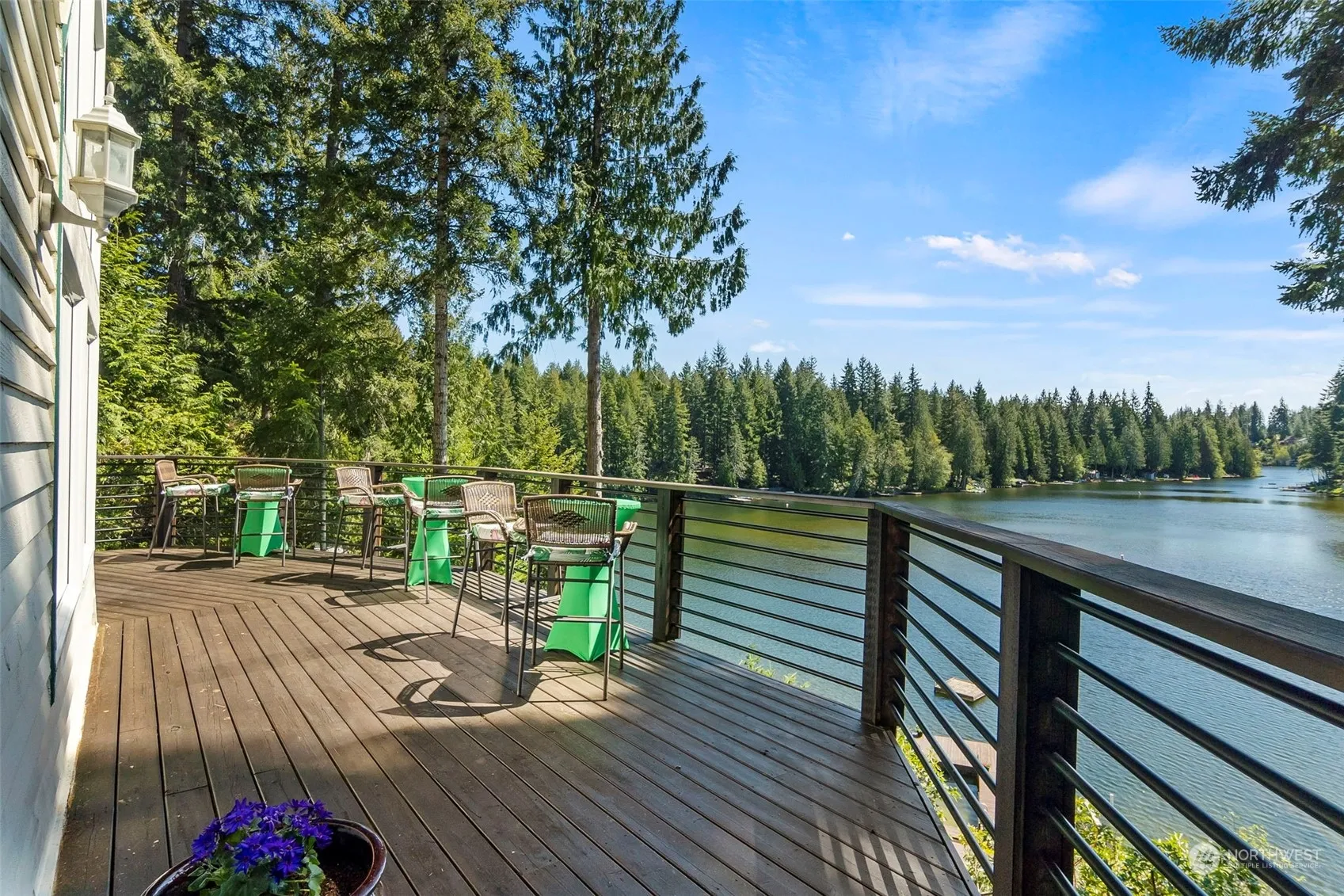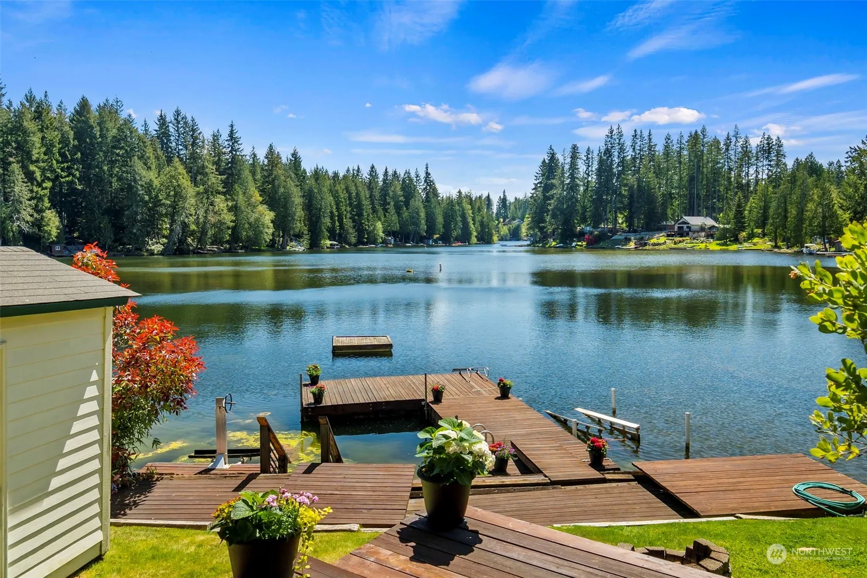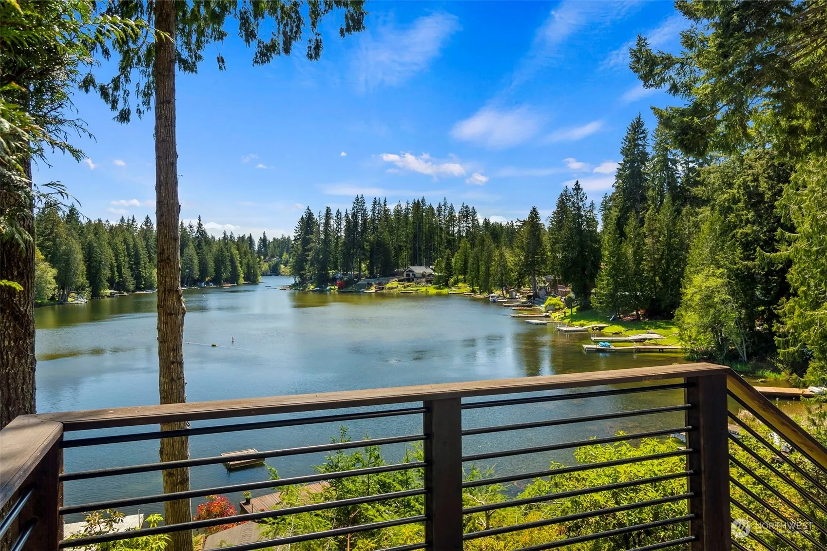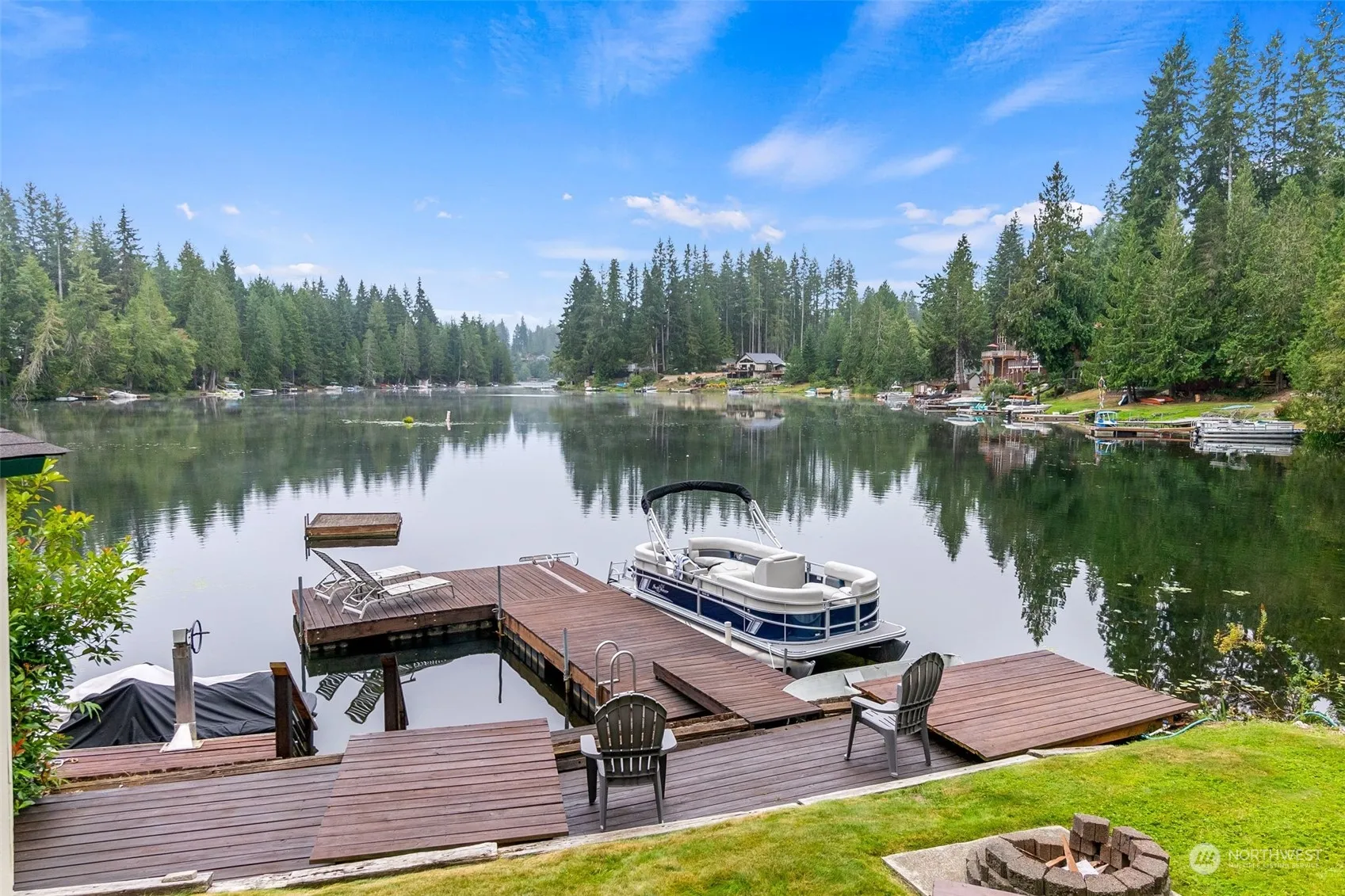 Majestic views from this impressive 3,224 sqft home. Vaulted cedar ceilings, Brazilian pear wood flooring, high end granite countertops & Thermador appliances. This medium bank home features excellent access to the water with your very own dock equipped with boat & jet ski lift and toy storage all the while reaping the benefits of the unrivaled view only medium to high bank can offer. Setting provides peace and tranquility. An innovative layout of dock offers protected swimming area. Plenty of docks & decking at lake makes for the perfect entertainment space. Lake is stocked for fishing, skiing & gas motors are allowed! Primary suit on its own floor. 2 additional bdrms & 2 bonus rooms. Downstairs could make for a great short term rental!