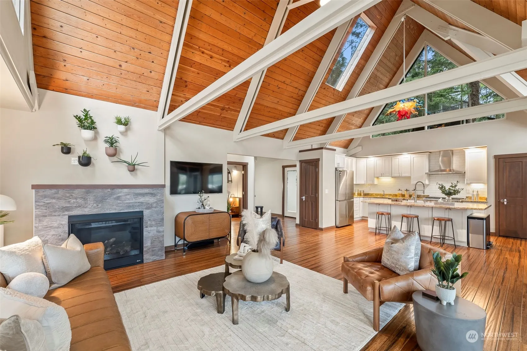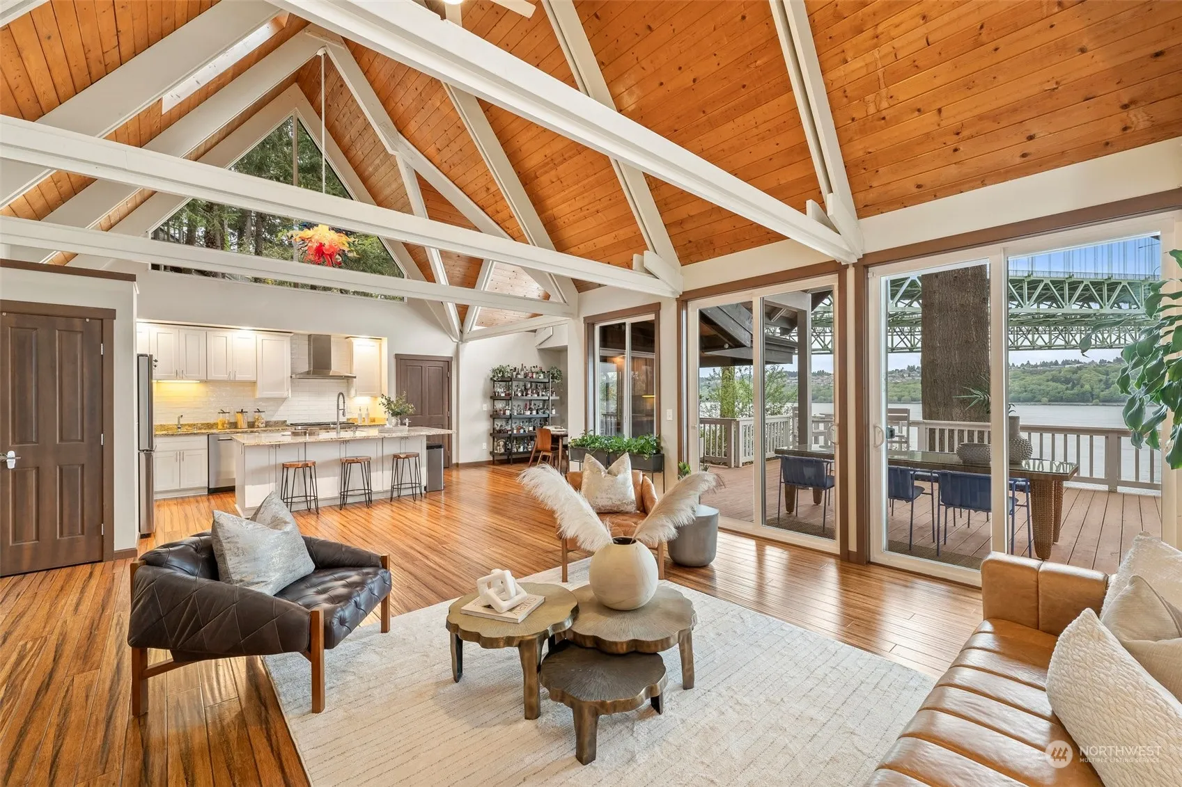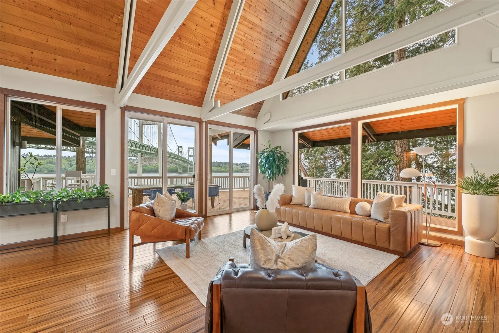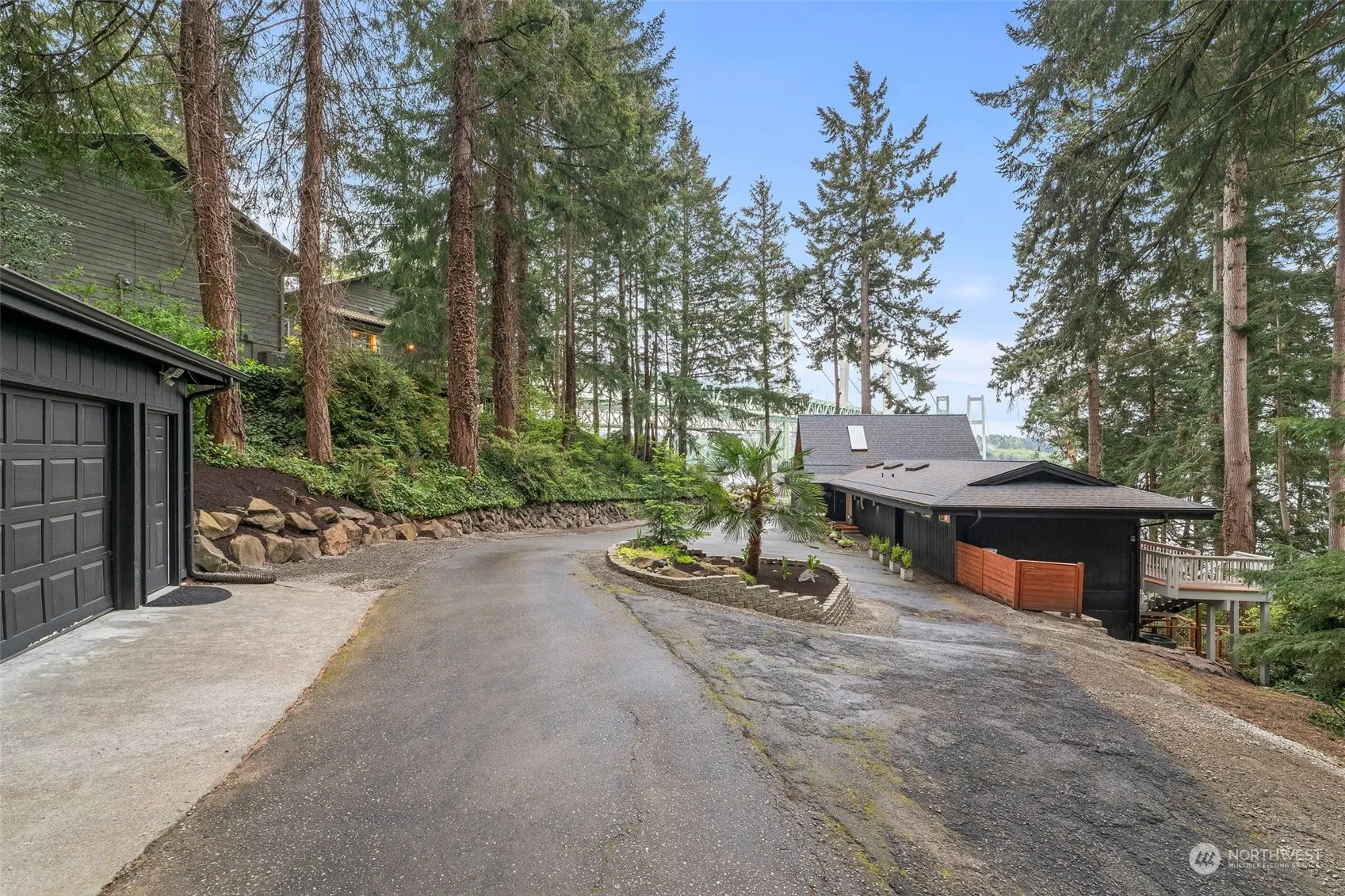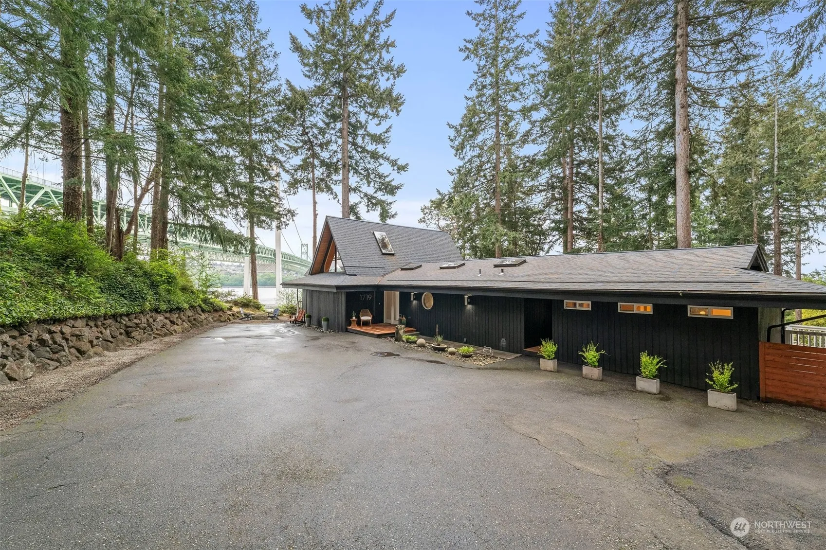 Exquisite Gig Harbor residence boasting 100 feet of private waterfront on a one-acre lot with stunning vistas of the water and Narrows Bridge. This 3-bed, 3.75-bath home showcases a modernized kitchen featuring maple cabinets, granite countertops, and top-of-the-line chef’s appliances. Throughout the home, you’ll find 2 Primary suites, solid four-panel doors, hardwood floors, vaulted exposed beam ceilings. The property includes a cozy 450+ sq ft MIL suite. Entertain on the wraparound deck, which has been recently refinished with cedar planks, or relax under the covered gable off the living room. Additional highlights include a new roof, new skylights, upgraded electrical panel with generator hookup, and a detached two-car garage.