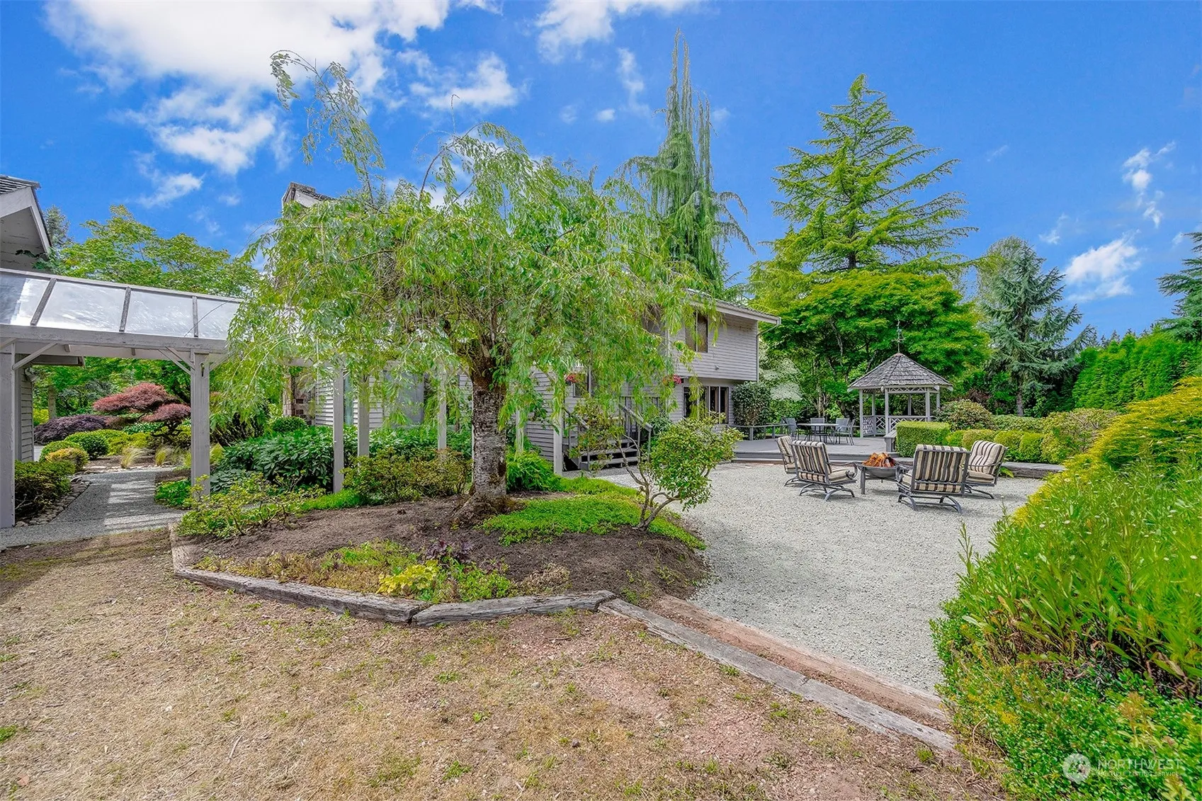 Situated on a serene shy-acre lot on a private road atop picturesque Hollywood Hill, this is your secluded retreat. Dual outdoor entertainment areas are perfect for a crowd. Living room w/wood-burning fireplace, soaring 25ft ceiling and attached flex space room. Kitchen at the heart of multiple gathering spaces featuring cozy family room, breakfast area, counter eating space and formal dining room. Loft home office w/tranquil back yard views. Updates include main floor and all bathrooms w/heated tile flooring, fully remodeled baths, redesigned master closet. 10-year roof cert. 220 volt in garage for easy EV installation. King Co. confirms 1000sf ADU potential. Just 1.5 mi. to vibrant Woodinville Wine/Tourist District!
