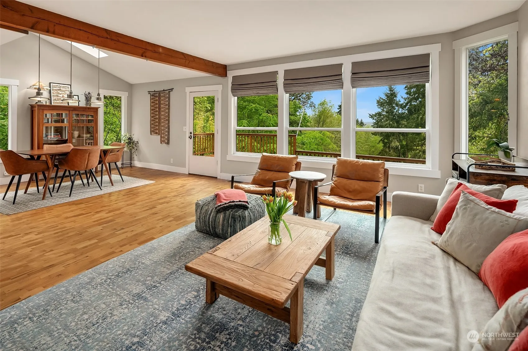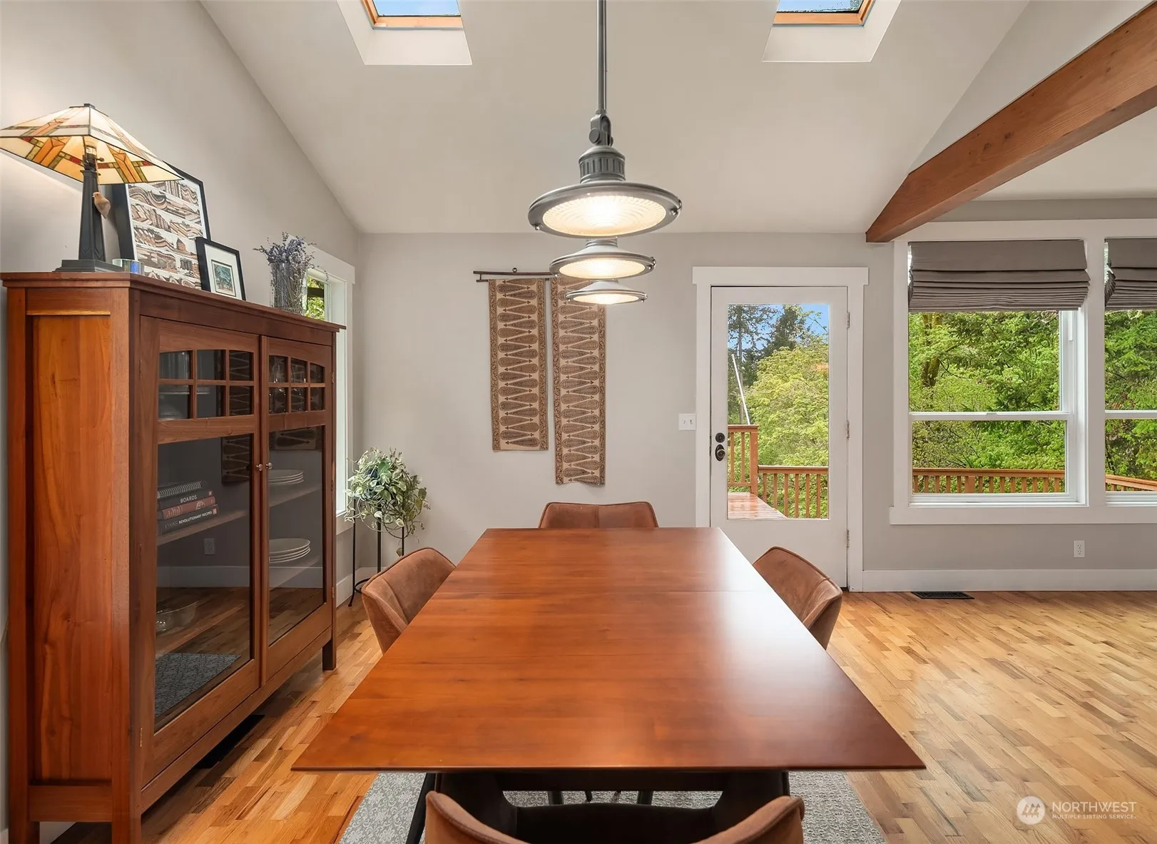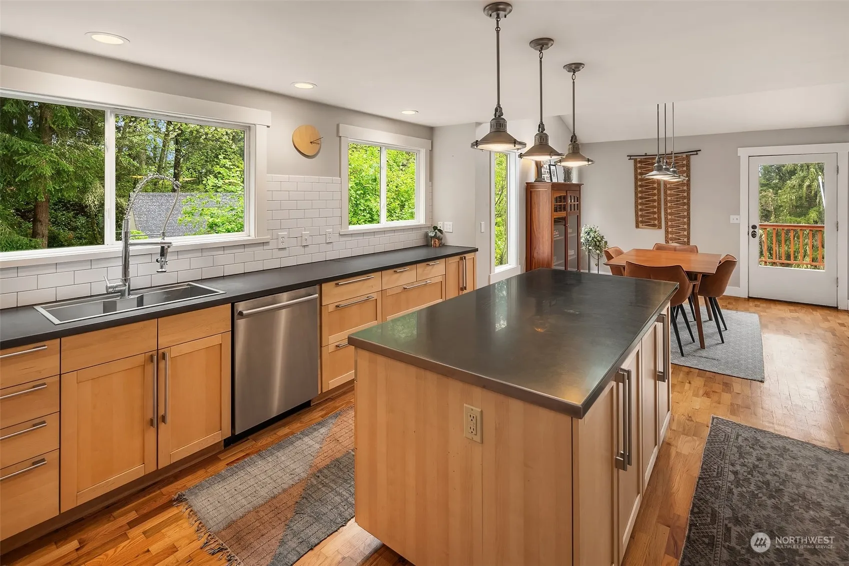 Unique NW contemporary home nestled on 4.98 open & wooded acres. Towering windows bathe the living/dining rooms in natural light, extending seamlessly to a charming deck with SW sunset sky views. The gourmet open kitchen is tailored for both grand feasts & cozy dinners. An Italian Piazzetta pellet stove provides cozy warmth. Imaginative, handcrafted koa stair treads with in-laid madrona rounds connect main to lower floor family room, bedroom w/large walk-in closet, built-ins, 3/4 bath, 2 in-wall electric fireplaces & access onto brick patio. Upstairs find den/office alongside 2 bedrooms, & full bath. Separate shower rooms upstairs & downstairs. Embrace your creativity in the detached artist studio/workshop. Open space ensures serene privacy