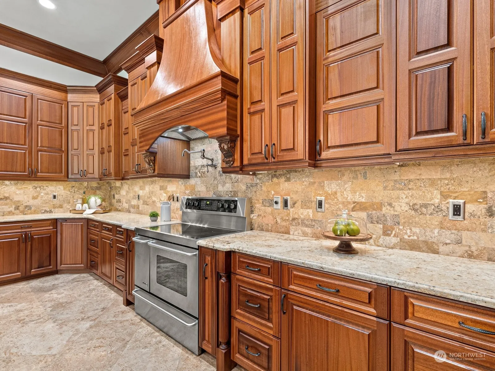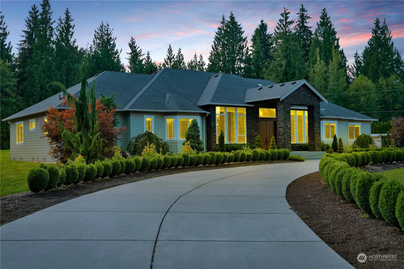 Experience timeless elegance on a sprawling six-acre estate. Crafted with exquisite Sapele African Mahogany wood and travertine floors, this custom Rambler features five+ bedrooms and 4.75 baths, adorned with soaring 12′ ceilings and fine woodwork. Enter through grand French doors framed by manicured landscaping and a U-shaped driveway. Impress guests with a gourmet Chef’s kitchen or unwind on the serene covered patio. Enjoy modern comforts like a built-in vacuum system and A/C. This home harmoniously blends divine architecture with a picturesque and fully usable level lot, open grounds, and a secluded wooded backdrop. Rural cluster short plat potential. Located in the growing Lake Stevens area, new shopping centers and top-rated schools.