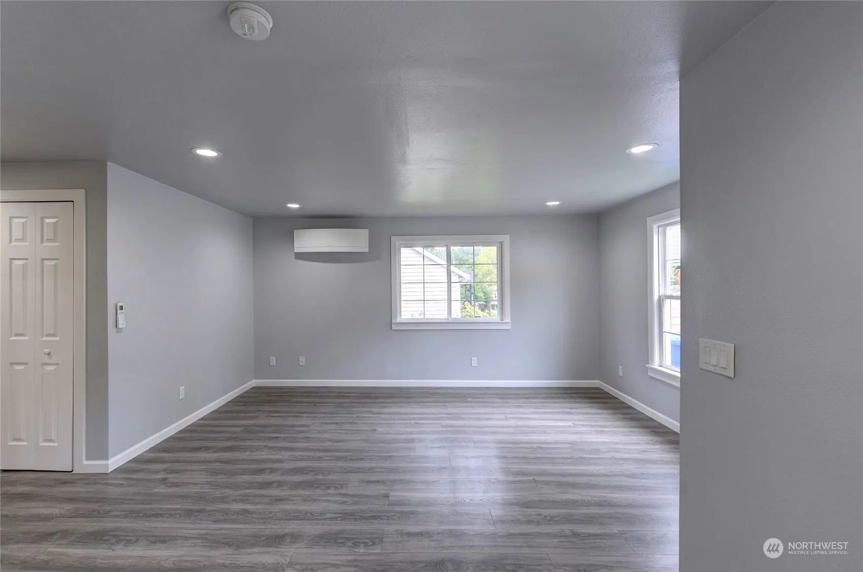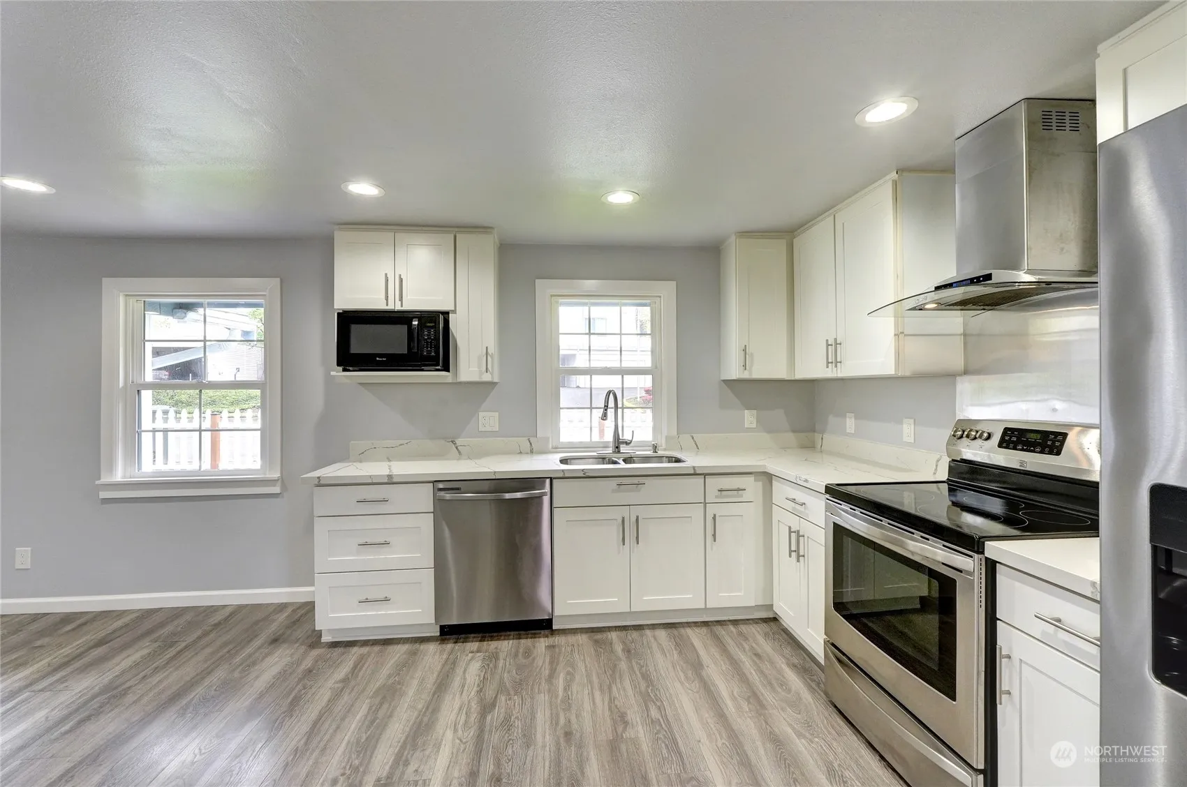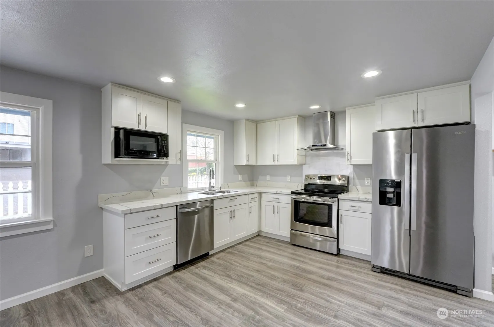 Commuters dream with price adjustment!!!! Walk to Kent Station, shopping, restaurants, parks and more from this beautifully, remodeled and updated open concept home!. Over the past couple years, this home has had a “studs-in” remodel with all new wiring, plumbing, roof, windows, kitchen, bathroom, insulation, mini-split heat and A/C, LVP flooring, doors, hardware, light fixtures, tankless water heater, painted interior and exterior and more! Beautiful kitchen with quartz countertops and stainless steel appliances. Bathroom features a double vanity and large linen closet. Spacious primary suite with double closets. Nicely sized second bedroom. Back deck for BBQ’s, fenced yard and an oversized 1 car garage with room for shop. No HOA!