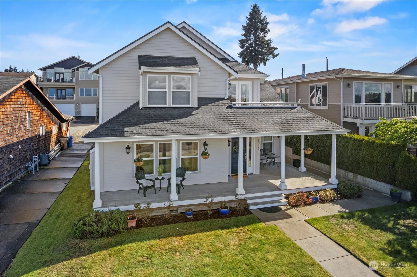MAJOR PRICE REDUCTION! Welcome to this custom built home with hand picked, quality materials, blending artsy & stately charm with modern comforts. Capture views of Point Ruston, the Sound & Cascade Mtns while sipping tea on the wraparound porch. Elegant front door, tasteful columns & carved woodwork curated from the past, giving nod to modern-classical architecture. The arrangement of the space is enhanced by high ceilings. Cozy gas fireplace in spacious living room which leads into formal dining room. Updated kitchen, top of the line appliances & oversized island for gatherings. Primary bedroom + private deck with breathtaking views. Stylish, updated bathrooms. Bonus room over garage. Parks, trails, coffee & dining just outside doorstep.