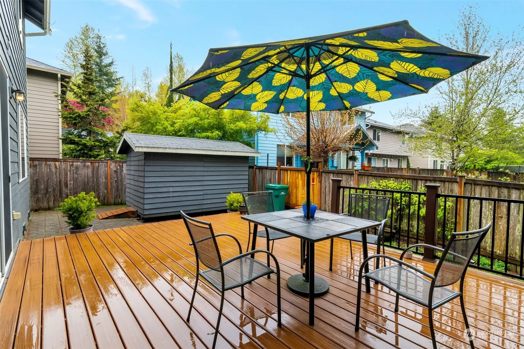 Light & bright well-maintained craftsman resale. Hardwood flooring, designer colors throughout. Main floor open plan. Living room with soaring ceilings, formal dining. Generous kitchen with quartz counters, island, pantry & plenty of prep area, open to the family room with cozy gas fireplace & access to the private, backyard with entertainment deck & storage barn. 1/2 bath, laundry & access to 2 car garage with built-in shelving. Upper floor Mezzanine office area, large Primary Suite with walkin closet & 5-piece bath, 3 additional bedrooms & full-bath. Plenty of off-street parking, newer roof, interior & exterior paint, hot water tank. Lake Stevens schools, close to freeways, parks & conveniences.