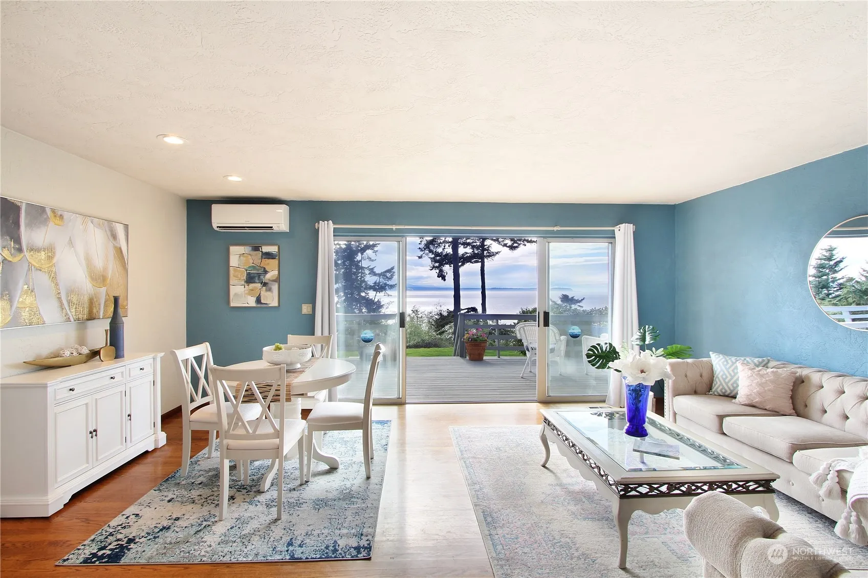 Sweeping western bluff views from this inviting home in desirable Teronda West community. Front row seats to well-traveled orca, shipping & ferry routes, views of Port Townsend & the everchanging landscape of sky w/the Olympics as your backdrop. Large view kitchen w eating bar & easy access to extensive outdoor entertainment deck. Primary BR offers privacy, walk in closet, views & bonus room/den/ofc. Partially finished basement has an interior entry & separate outdoor entry featuring finished rec room, 2 bonus rms, tall ceilings w/potential for your ideas/hobbies. Large 2 car garage w/man door, extra parking in driveway. Walk to private community beach w/firepit, strolls on the beach. Grounds include the Red Barn meeting circle and swings!