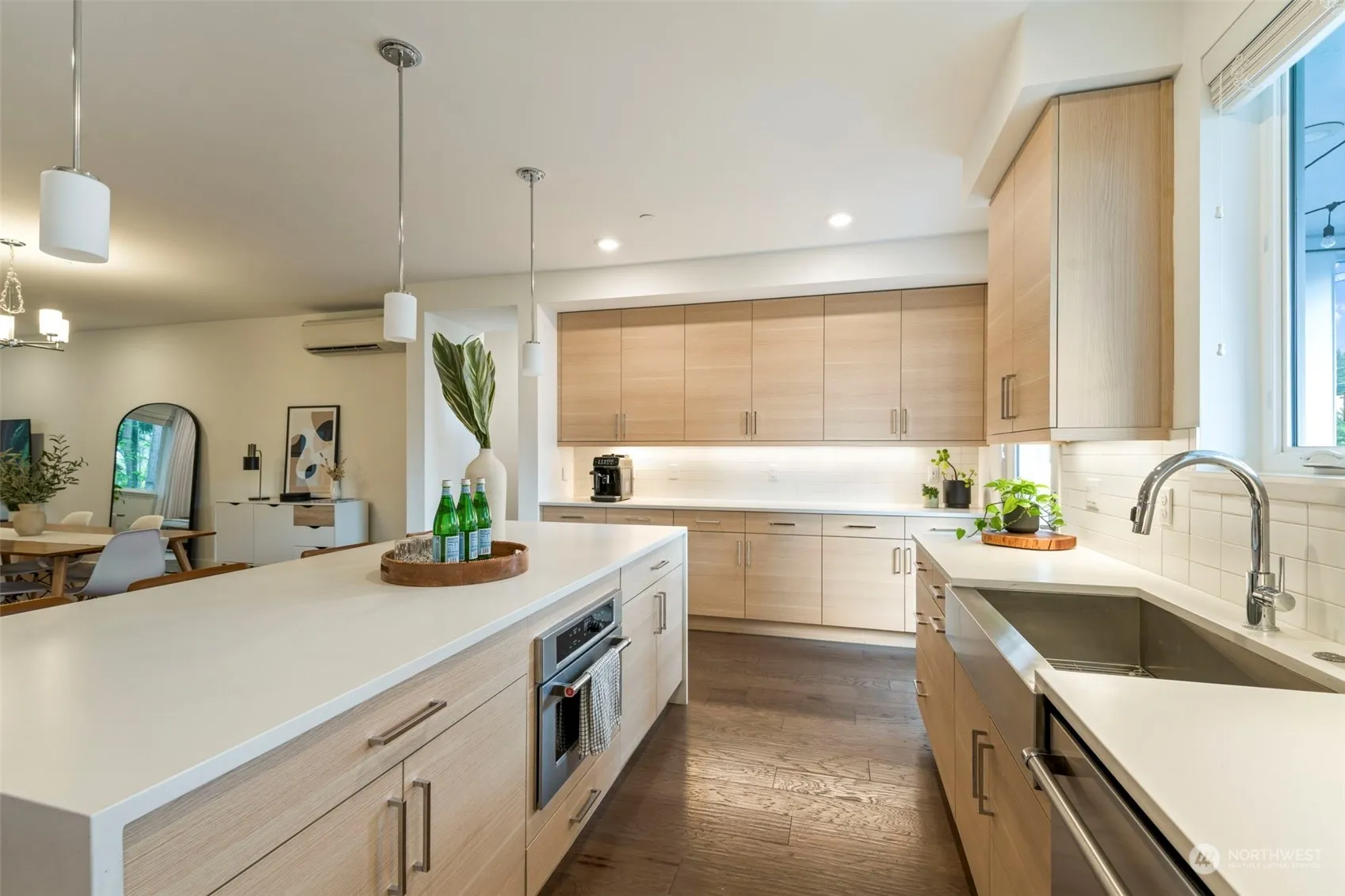 Stunning modern 4 bedrm townhome in Aurea! Exuding modern luxury and sophistication–this home is a perfect blend of contemporary design and serene private living w/sleek lines, open floorplan and tall ceilings. Modern gourmet kitchen has large island w/quartz waterfall, abundant cabinets, newer appliances, and spacious deck for outdoor entertaining. One bedroom on main w/private balcony and .75 bath. Upstairs, primary suite has large windows, spacious closet, and spa-like ensuite bathroom. 2 more bedrms upstairs offer options for guests/office. Situated on a peaceful greenbelt buffer w/serene views, privacy and abundant natural light throughout. 2- car garage with EV outlet. Walk to schools, parks, amenities, trails. Just like new!