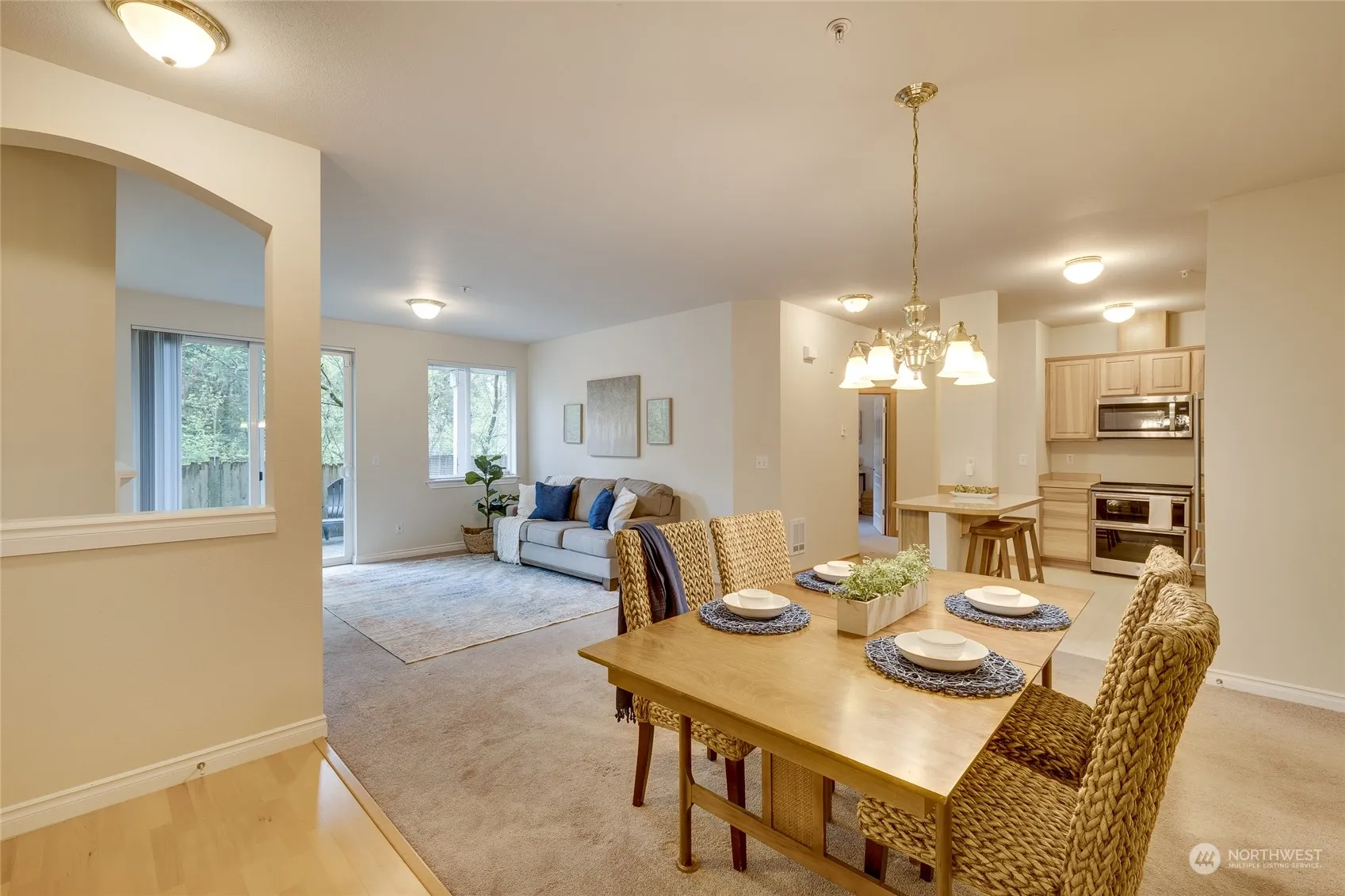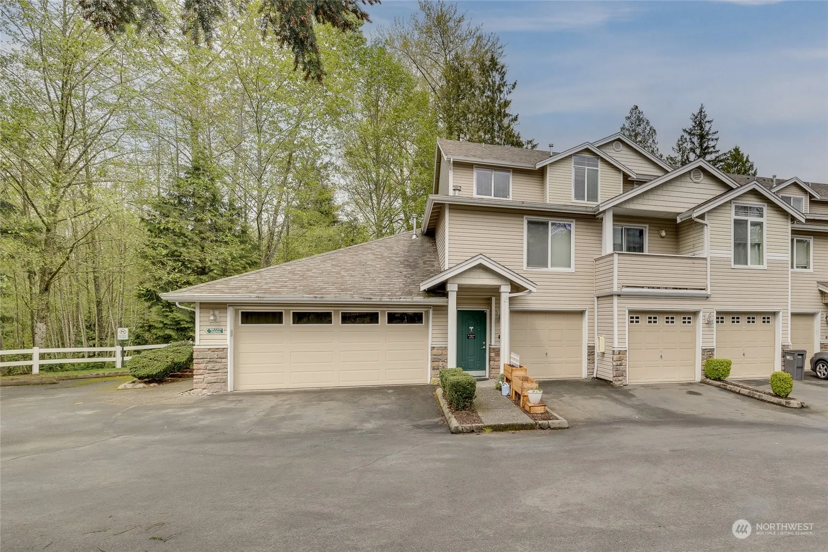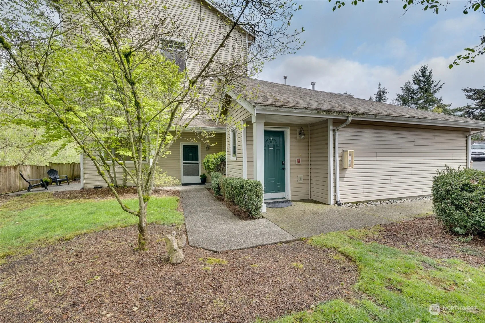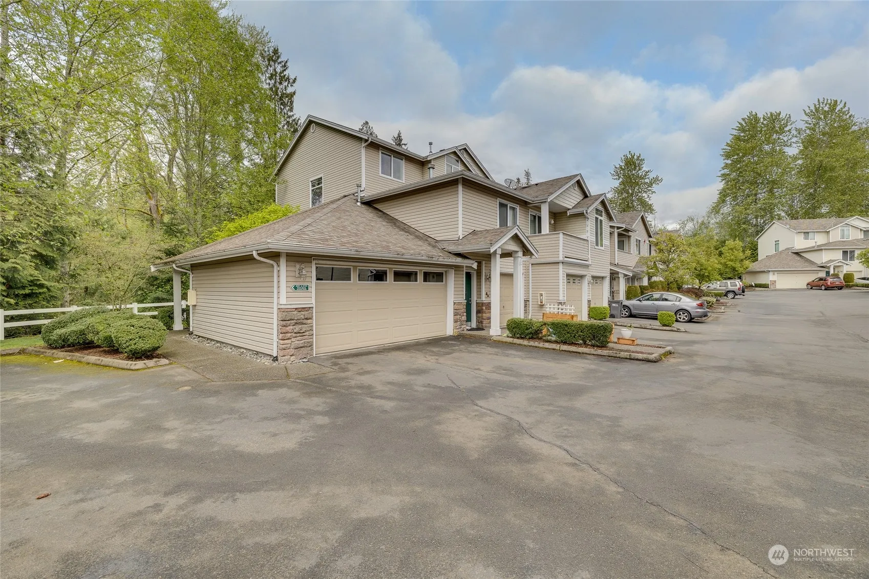 Rare all on 1 level condo with NO STEPS! Tucked behind with a private location in the smaller Trentwood Complex. Convenient location + walking distance to the 164th park & ride makes for easy commute access. Tall ceilings in this 3 bedroom + 1.75 bath open concept floorplan, New GE Cafe Stainless appliances in kitchen including fridge with hot water spigot! Attached 2 full size car garage opens directly into unit. Gas fireplace in living room that opens to private patio with greenbelt view. Full Size laundry off of main bath. Primary bedroom features walk in closet, step in shower & plenty of space. All doorways are wider than standard. Be close to it all- but feel like your own space with privacy and quiet. Plenty of Guest parking!