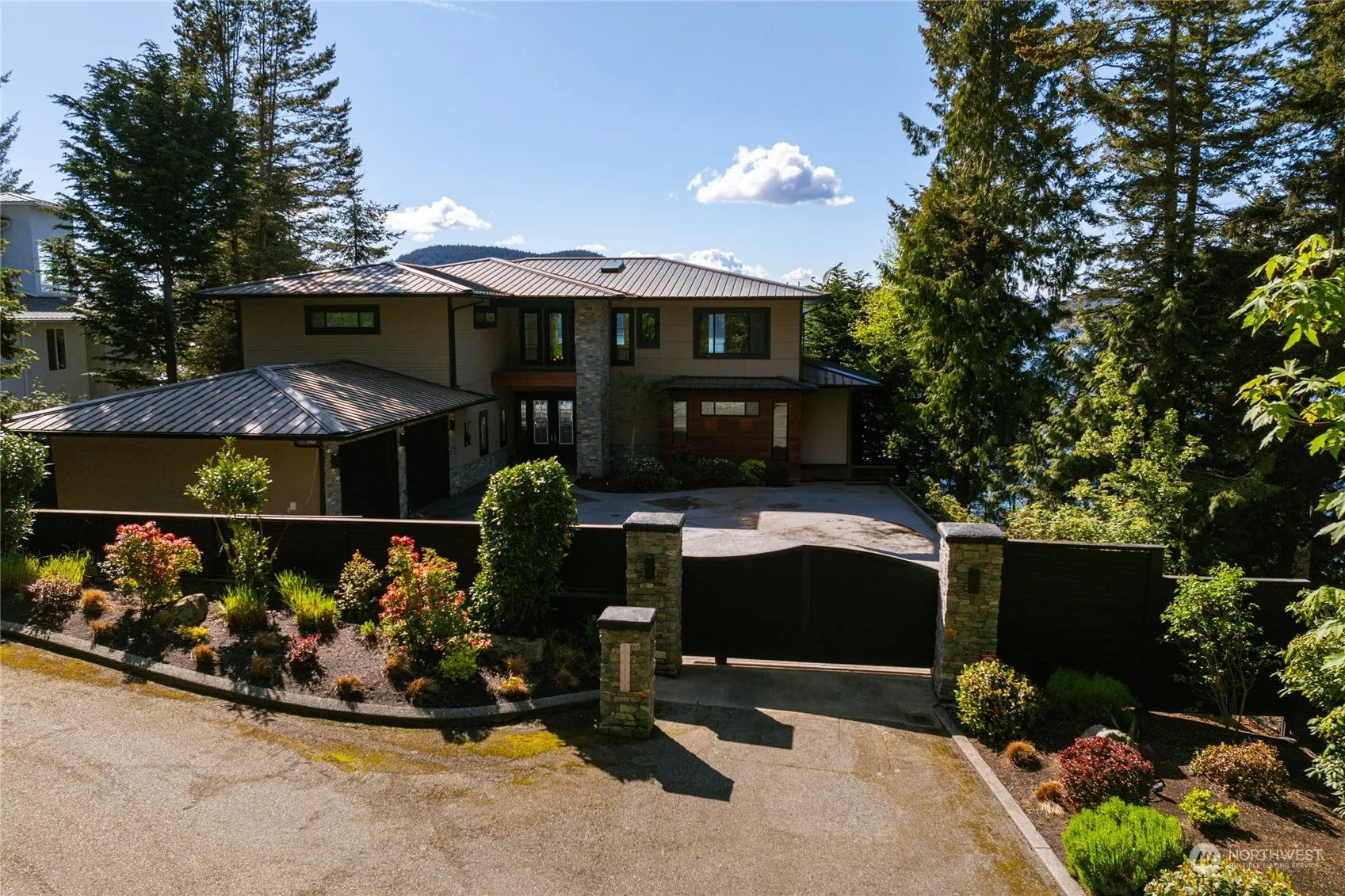 Indulge in the epitome of luxury living with this stunning waterfront haven, commanding breathtaking vistas of Burrows Bay and the San Juan Islands. The dramatic living room boasts a soaring two-story ceiling and an elegant catwalk. Delight your culinary senses in the gourmet kitchen featuring Thermador appliances, including an 8-burner gas stove, complemented by a quartzite island and butler’s pantry. Retreat to the primary suite, where a walkthrough multi-head shower and freestanding soaking tub promise blissful relaxation. Entertain in style in the rec room or escape to the theater room for cinematic adventures. Outside, multiple decks & lounge areas beckon, alongside two inviting firepits, creating an oasis of unparalleled splendor.