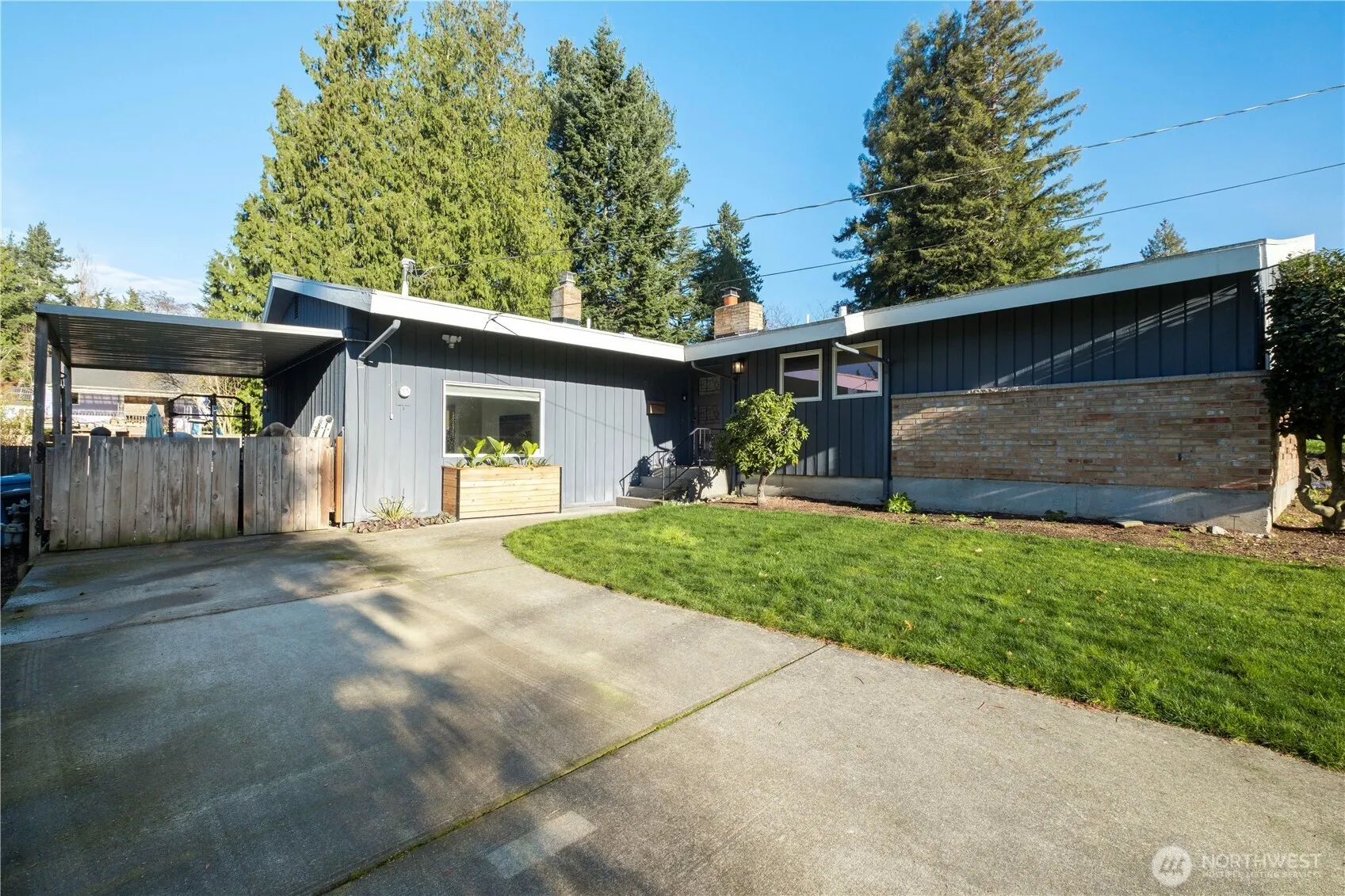 Must see this stylish 1,600 sq ft, open layout updated mid-century modern home w/ 3 bdrms & 1.75 bths. Expansive windows & skylights fill the central living area w/ natural light, enhancing the sense of space & comfort. Plus, you’ll love the central wood-burning fireplace & original hardwood floors to enhance the mid-century modern feel. The converted garage provides a versatile bonus living space, while the modern kitchen & organized closets add both style & functionality. Enjoy central A/C on warm summer days or spend time in your oversized backyard with patio, garden space, & rustic garden shed. Perfect location for commuter w/ home located w/ easy access to I-5 & blocks from Shoreline South Light Rail Station.