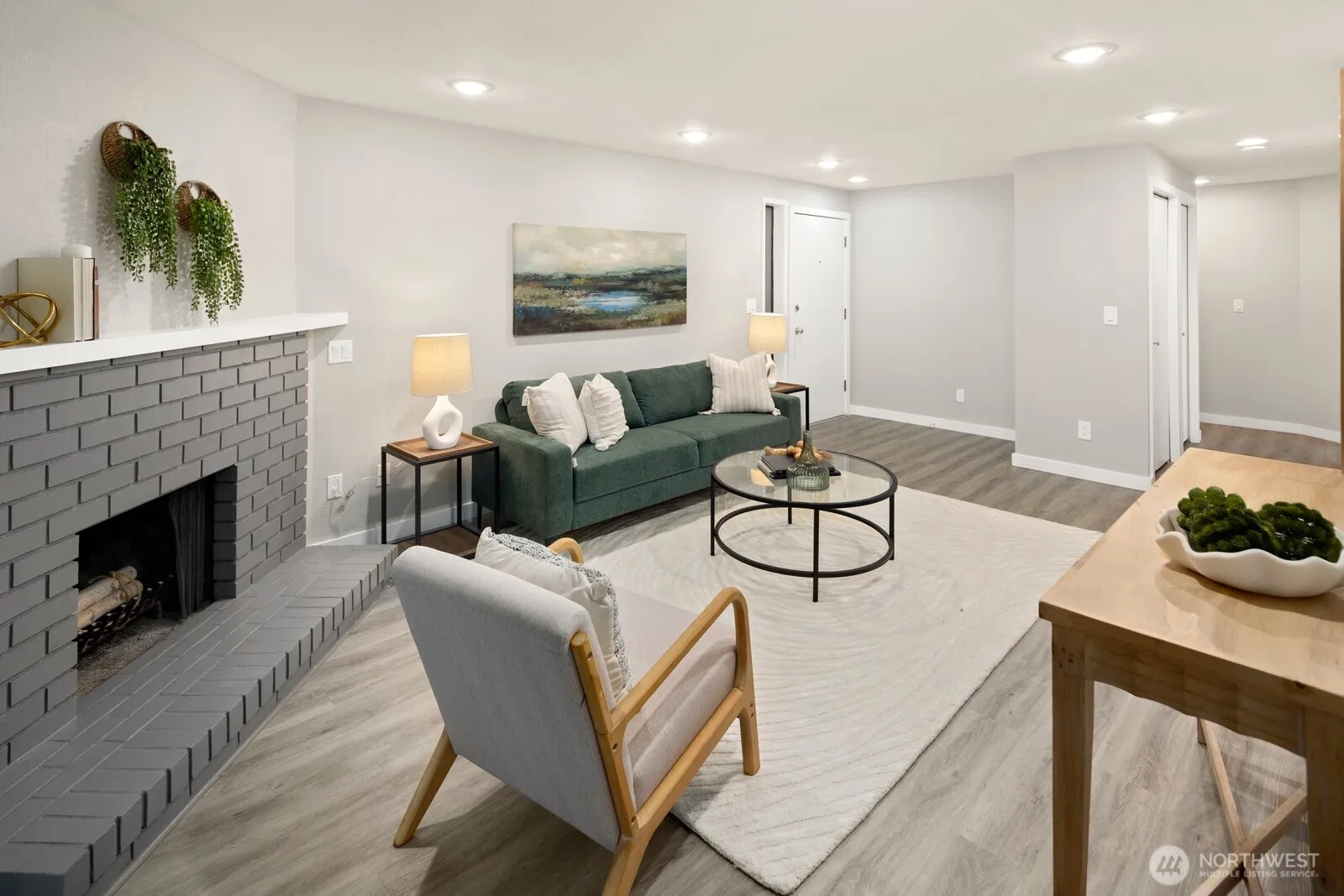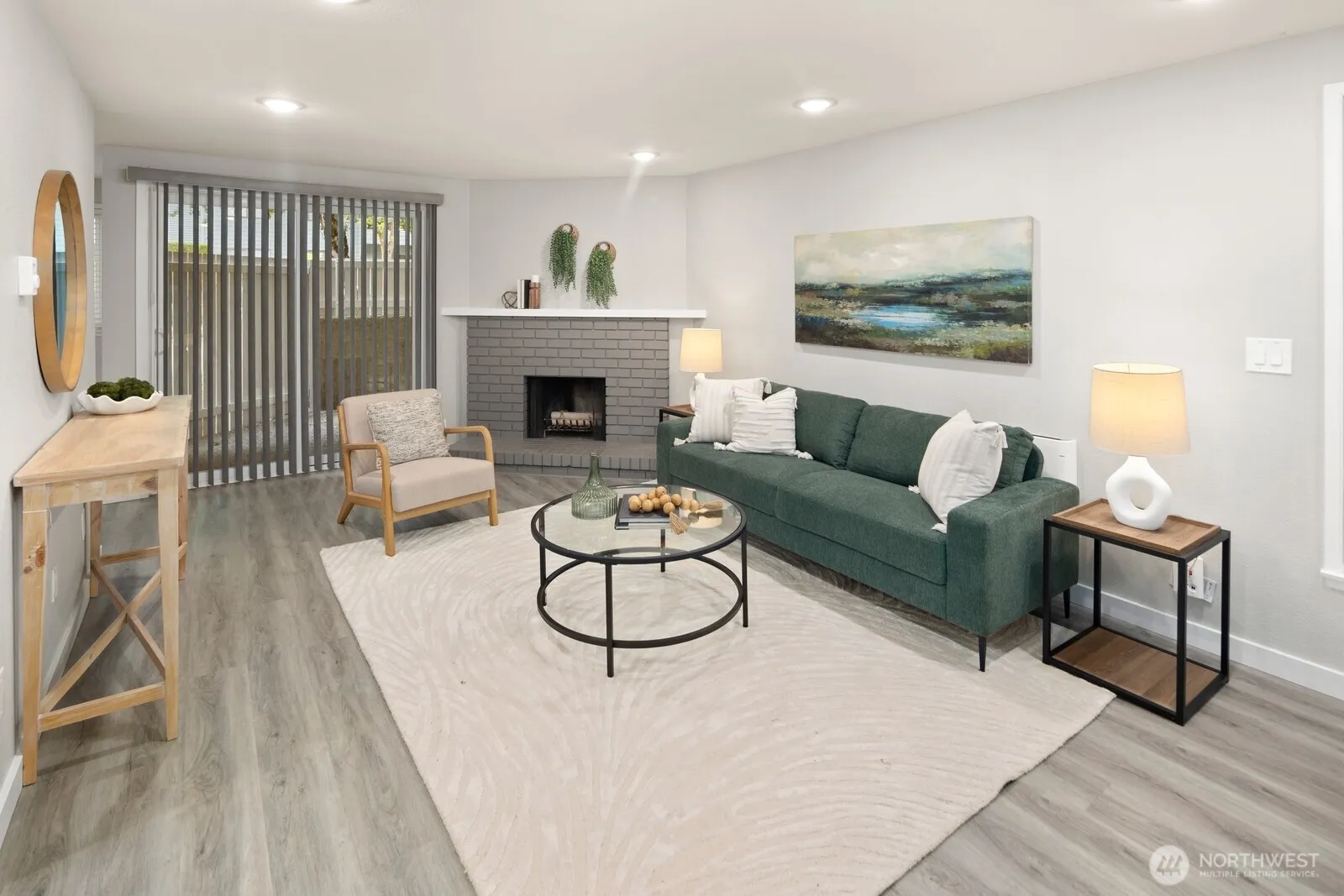 Step into this beautifully updated, move-in ready ground-floor end unit condo—light, bright, and full of charm! The stylish kitchen shines with sleek quartz counters and stainless-steel appliances, opening to a welcoming family room with a cozy wood-burning fireplace. Slide open the doors to your private patio and soak in the peaceful outdoor space! Newly installed LVP floors flow throughout, leading you to two inviting bedrooms with custom closet systems and oversized windows that bring the outdoors in. An updated bath, full-size washer and dryer, two storage rooms, and a covered garage space add comfort and convenience. Plus, the building includes an elevator and boasts undeniable curb appeal.