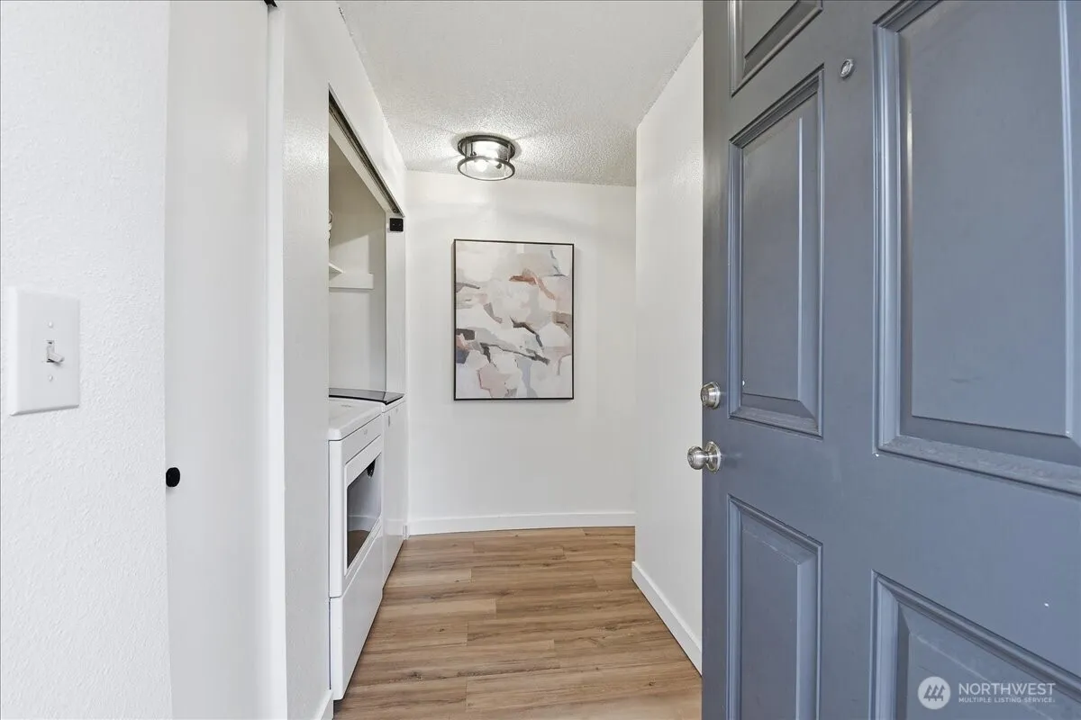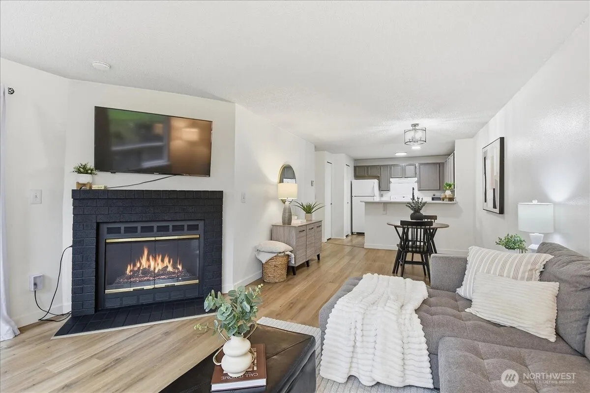Enjoy peaceful, private living in this ground-floor end unit tucked against a serene natural backdrop.Open-concept living & dining area features a breakfast bar, pantry, and a cozy wood-burning fireplace. Single-car garage PLUS assigned uncovered spot, and in-unit laundry adds everyday convenience. Large windows fill the space with light, and a sliding door leads to a patio overlooking a lush lawn and stone-covered landscaping. Luxury vinyl plank floors. The community received major upgrades in 2020, including NEW roofs, gutters, windows, siding, patios, porches, garage doors, railings, exterior paint, & lighting. Low HOA dues. Pet-friendly. Close to shopping, parks, golf, & trails with easy access to I-5 &167. Great alternative to renting.