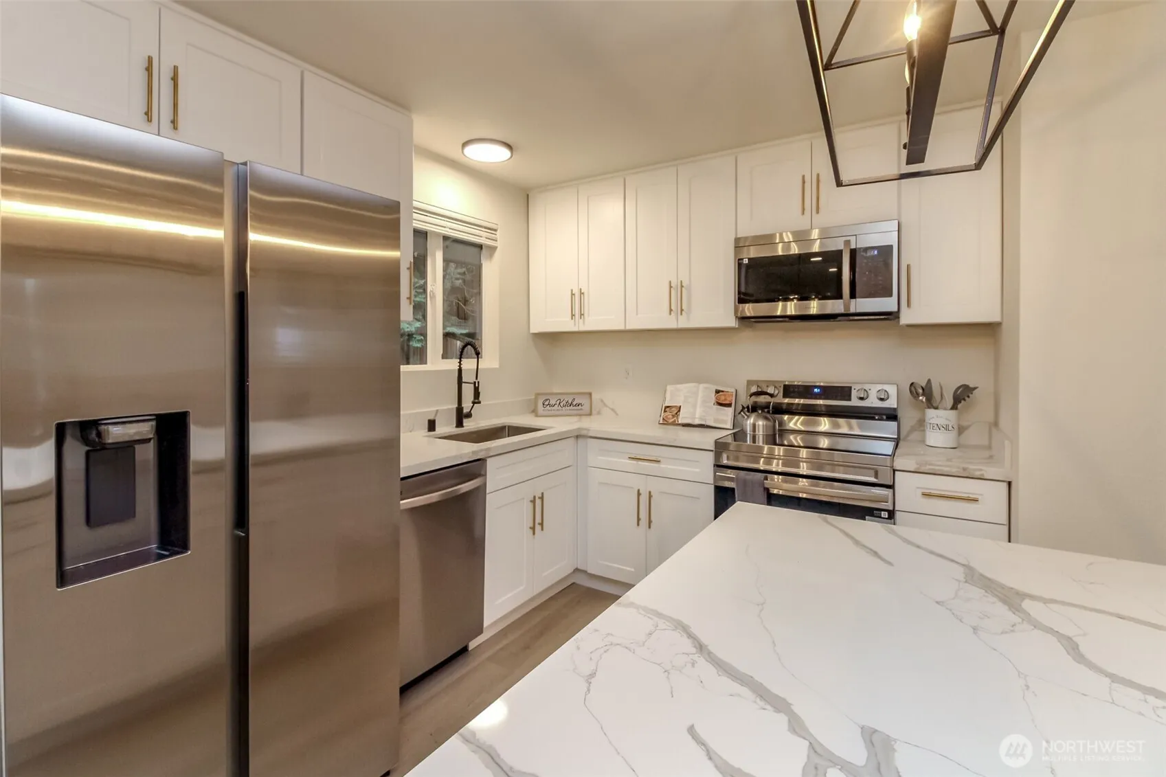 Discover this charming 3BR, 1.75BA rambler, featuring a thoughtfully upgraded interior. Enjoy the new kitchen w/ gleaming quartz counters, stainless steel appliances, elegant cabinets, and modern lighting. Experience freshly painted interiors paired with new flooring, exuding a clean and contemporary ambiance. The sunlit layout provides cozy living spaces, complemented by central air conditioning for year-round comfort. Outdoors, a fully fenced backyard awaits, ideal for relaxation or play. 2 car garage, lots of driveway parking & NO HOA. Situated in a serene neighborhood with convenient proximity to shopping, dining, schools, and major freeways, this home perfectly blends tranquility and accessibility.