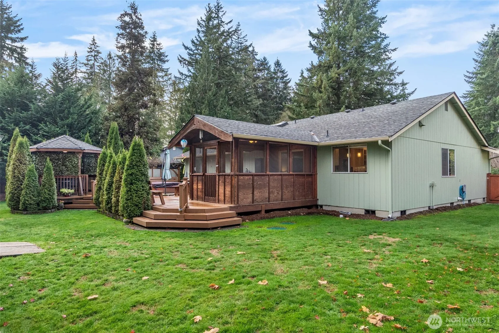 Capture the charm of single-story living in this thoughtfully UPDATED home set on a peaceful .3-acre lot in Tumwater’s Parkridge! Manicured grounds & stunning curb appeal set the tone, while inside, a fabulous chef’s kitchen steals the show with custom cabinetry, quartz counters, ss appliances & contemporary lighting—open to dining, living & family rooms for effortless flow. A screened sunroom off the kitchen, provides the perfect covered spot for summer buffets & easy indoor-outdoor entertaining. Step onto the expansive deck w/hot tub & gazebo or retreat to the serene primary suite w/ LUXE full-tile, walk-in shower, dual closets & direct hot tub access! All the features you love in a space designed to be beautifully manageable & inviting!