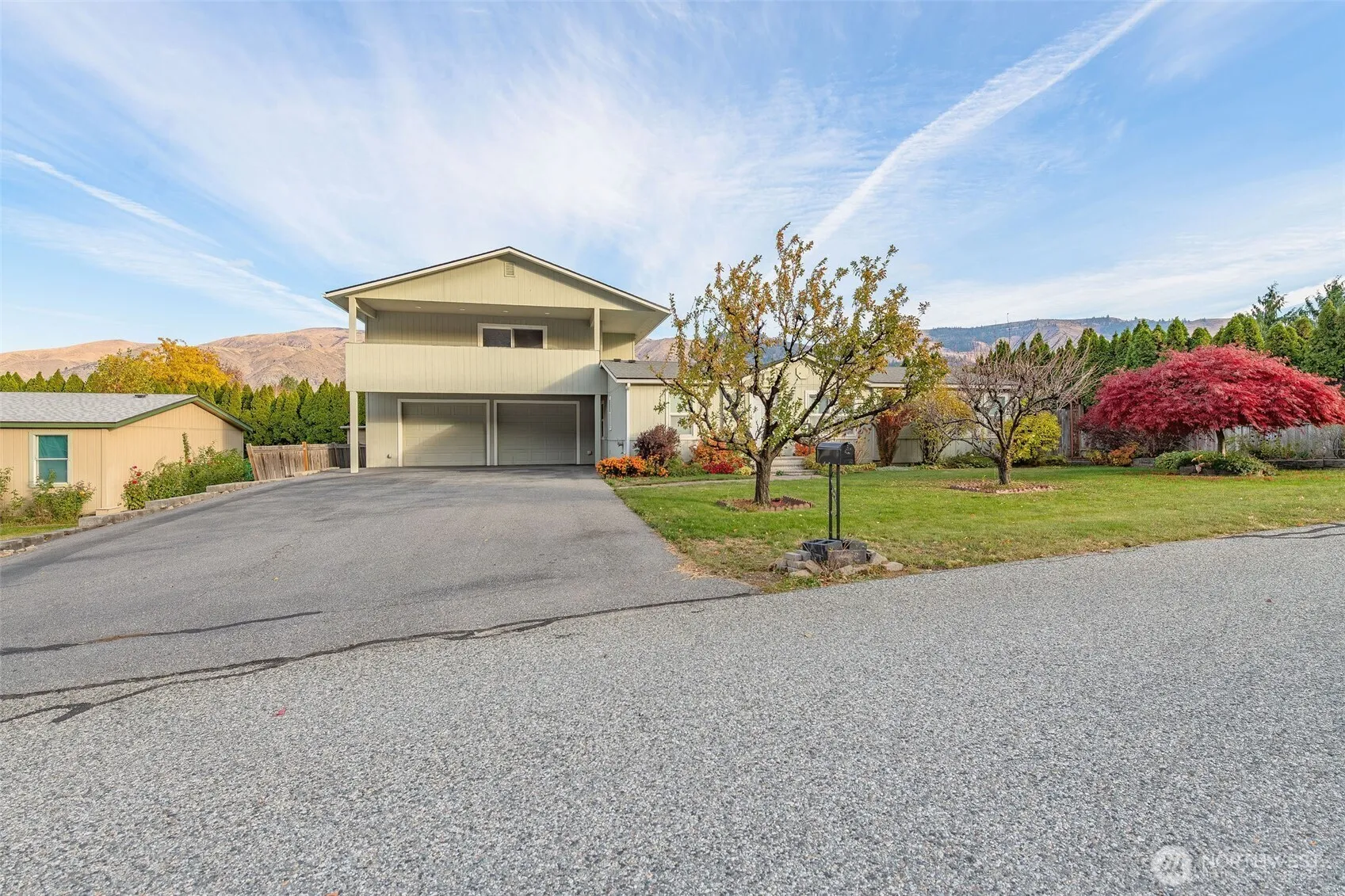 Totally refreshed 3 bed, 2.5 bath single level home with 1,188 sq ft. and a large attached shop. New interior paint, new carpet, spacious eating bar in kitchen with lots of storage and original laundry room was turned into a huge pantry area. This little gem has the primary bedroom, bathroom & walk-in closet on one end and the other 2 bedrooms & bath on the other end, giving everyone privacy. BONUS: Huge 966 sq ft shop with a 1/2 bath, 966 sq ft bonus room above with large covered view deck, & plumbed for another bath. Even an extra deep paved driveway with RV parking. Enjoy the large garden/storage shed, berry bushes, big garden spaces, and hot tub (needs new cover). Perfect for those seeking space, views, and versatile living options!