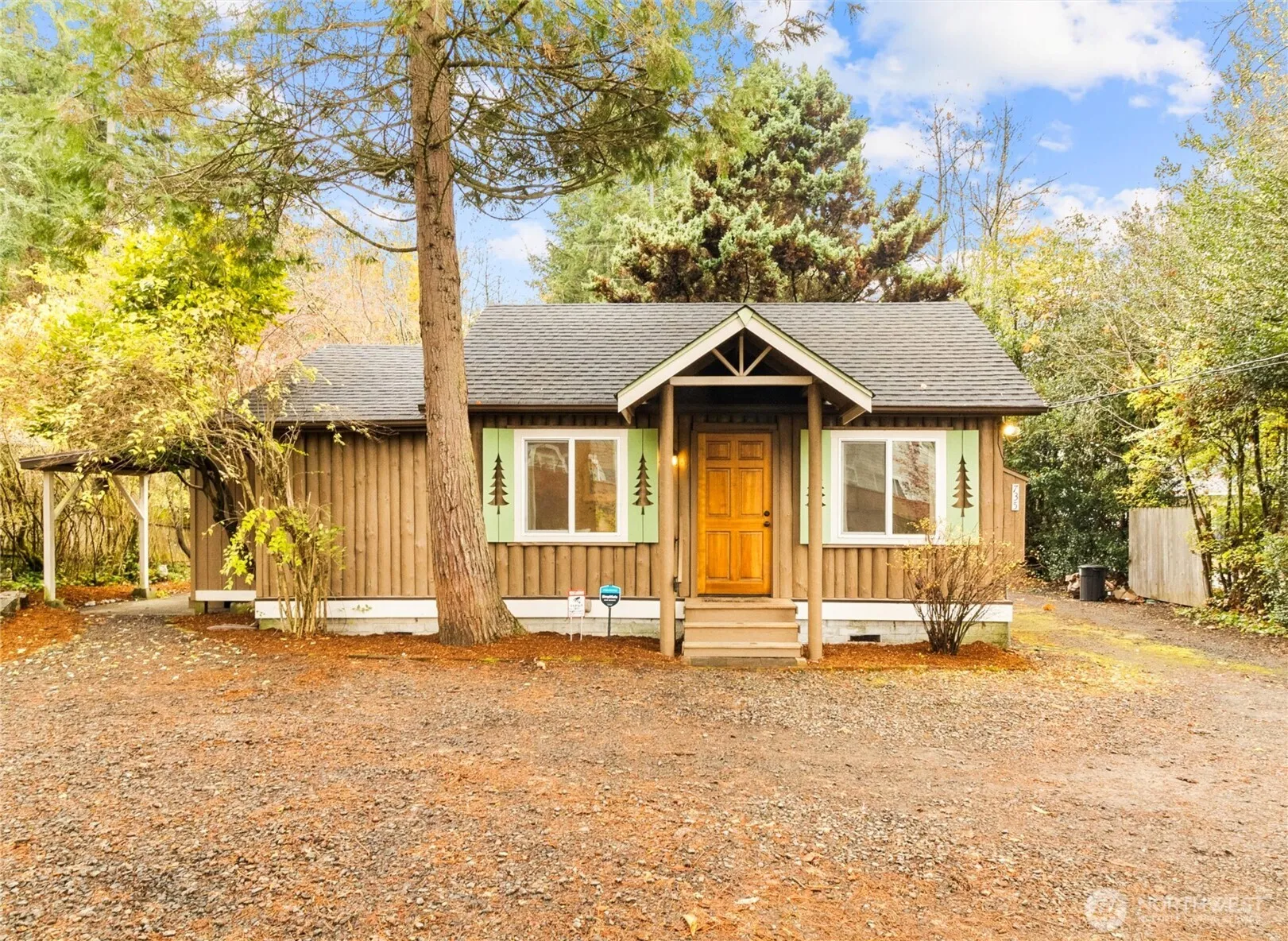Discover this affordable PNW cabin retreat surrounded by nearly an acre of land. This cozy gem has been well maintained and is move in ready. Tucked among the trees, yet just minutes to Silverdale, Naval Bases, parks, shops, Costco, hiking, boating & fishing + located in the CK school district. Step inside and enjoy beautiful original hardwood floors, an inviting living room with gas stove and a farmhouse kitchen with vintage original cast-iron sink. Featuring two bedrooms, spacious bathroom & a bonus utility room with covered patio. Relaxing & hidden private backyard sanctuary with wildlife, plum & cherry trees—even a redwood. Includes garage/shop, flat driveway with lots of parking. The sale includes 2 parcels making almost a full acre.
