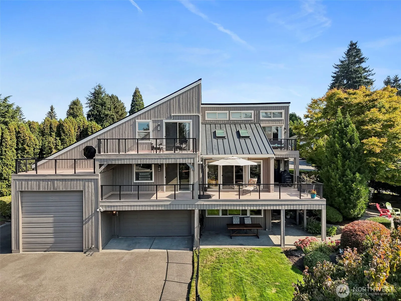 Beautiful multi-level home w/spectacular valley and mt views on a private, quiet cul-de-sac. Open floor concept w/large living room with vaulted ceilings. Updated kitchen w/coffee station and stainless steel appliances. Main floor primary suite offers private bath and walk in closet. Two bedrooms upstairs with a nice loft area for a bonus/game room. Lower level features a large family room for possible multi-generational home options. 2 car garage plus additional 42′ RV garage w/mechanics pit, as well as other ample parking outside for your boat/toys. Expansive newer decking and railing overlooking the mature landscaped yard and stunning views. Additional exercise room off garage. EV outlet and fire pit too!