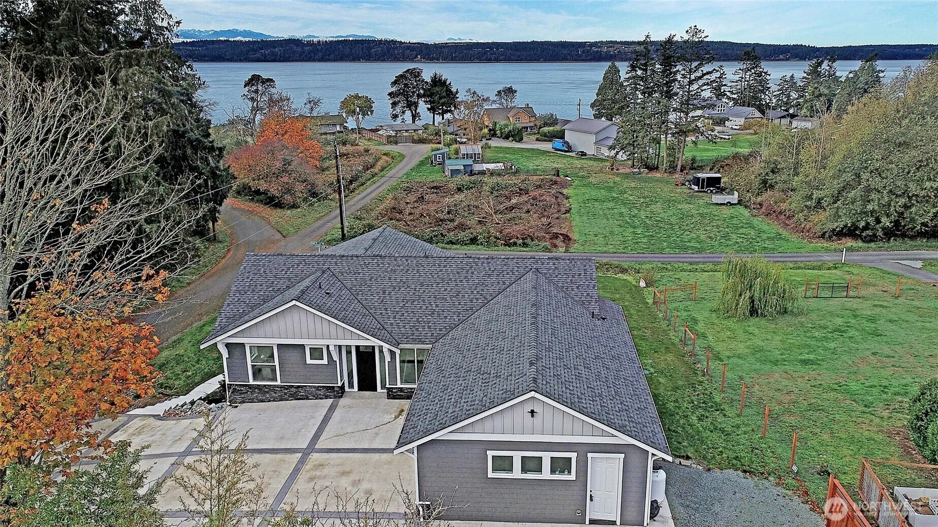 Beautiful new construction on Camano Island with 3 bedrooms, 3 baths, and spectacular west-facing sunset views. The main level offers no-step entry, a luxurious primary suite with heated tile floors, custom-tiled walk-in shower, and spacious closet. Enjoy a gourmet kitchen with Bertazzoni appliances, dedicated office, powder bath, laundry, and oversized 2-car garage. The daylight basement adds two bedrooms, a full bath, family room, and a large flex space pre-plumbed for a kitchenette and bathroom—perfect for a MIL suite, hobby room, or extra storage. Situated on a generous lot with ample parking for your RV or boat, this home combines comfort, craftsmanship, and the best of island living.