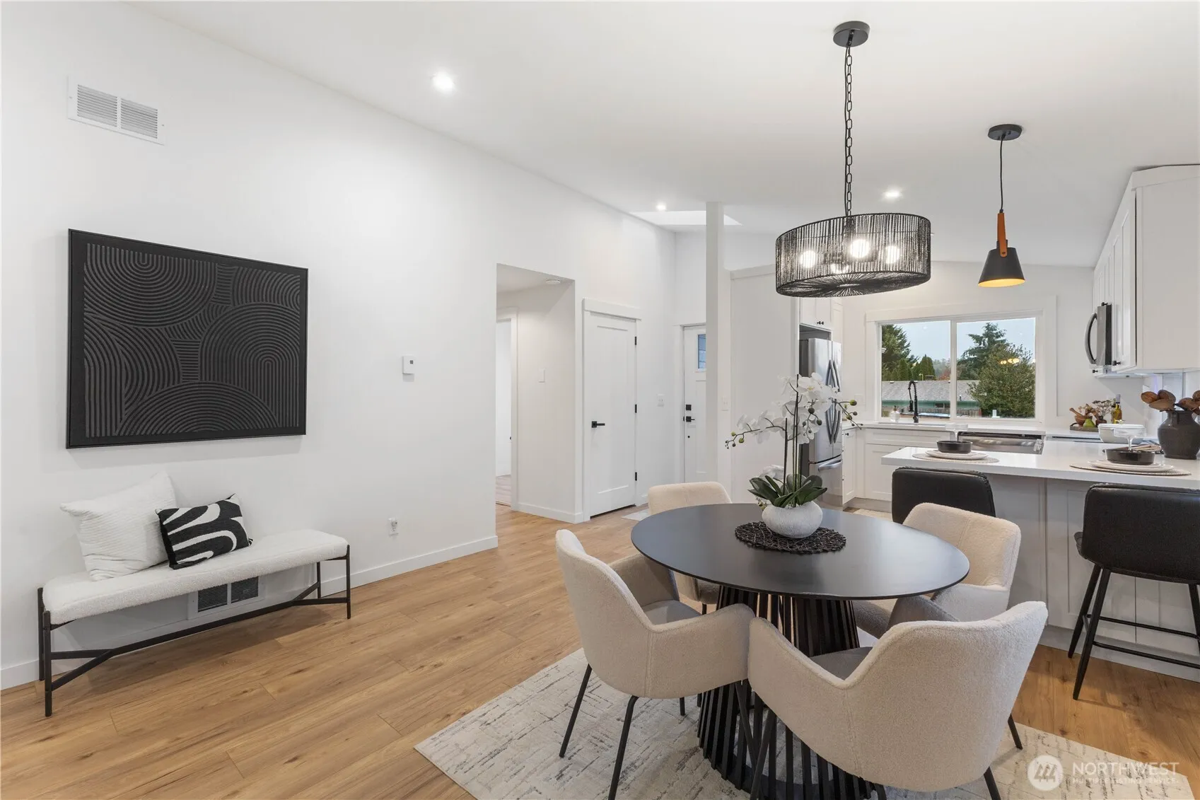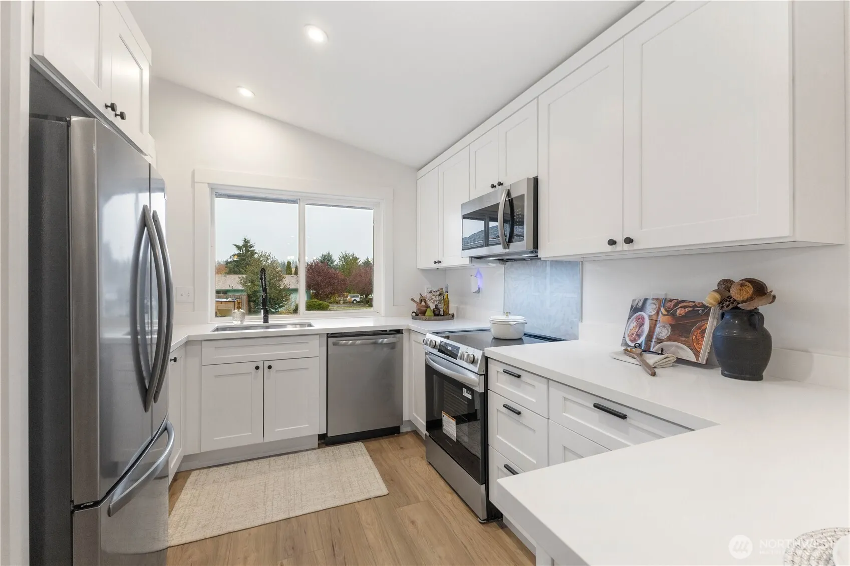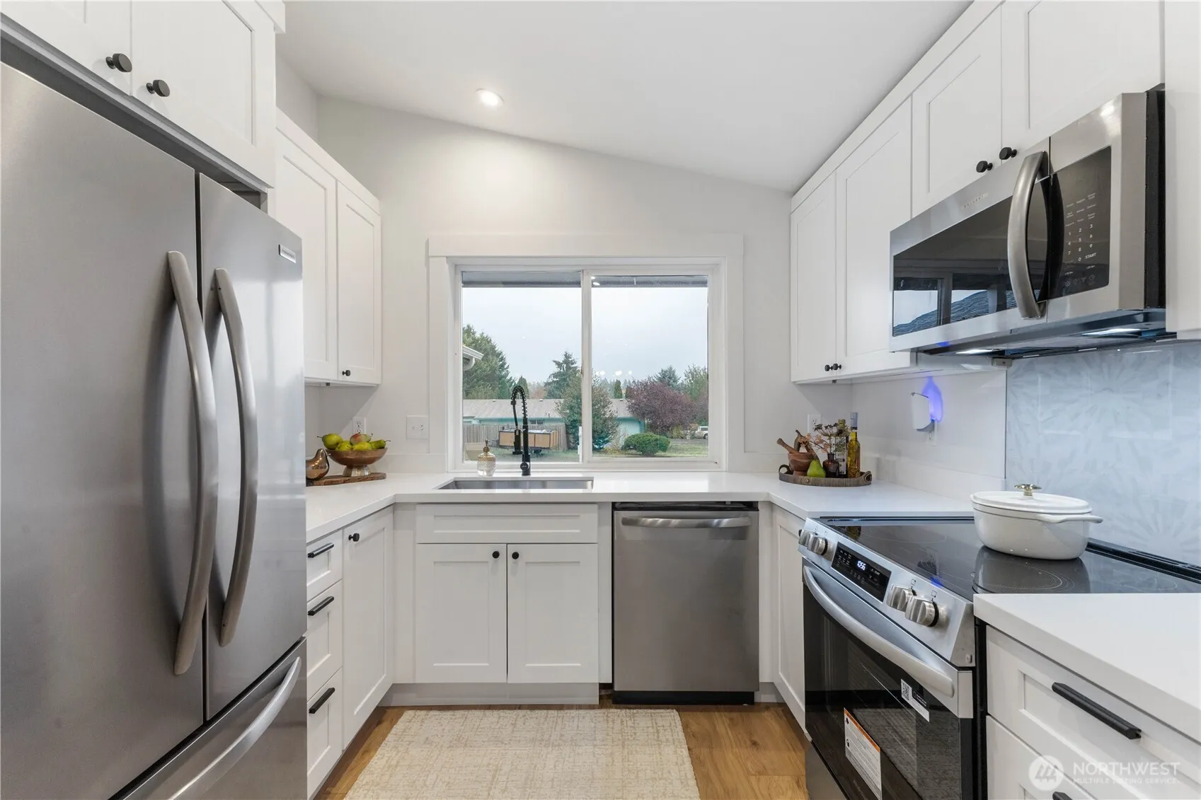 Move-in ready rambler on a spacious corner lot with views of Mt. Rainier! This 3-bed, 2-bath home features vaulted ceilings, an open floor plan, and a cozy electric fireplace. Enjoy a brand-new kitchen with shaker cabinets, quartz countertops, stainless appliances, and updated lighting throughout. Primary suite offers a large vanity plus walk-in shower and walk-in closet. Additional updates include a new composite roof, gutters, double-pane vinyl windows, doors, millwork, fresh interior/exterior paint, and new water heater. French doors open to a fully fenced yard. RV parking and an attached 2-car garage.