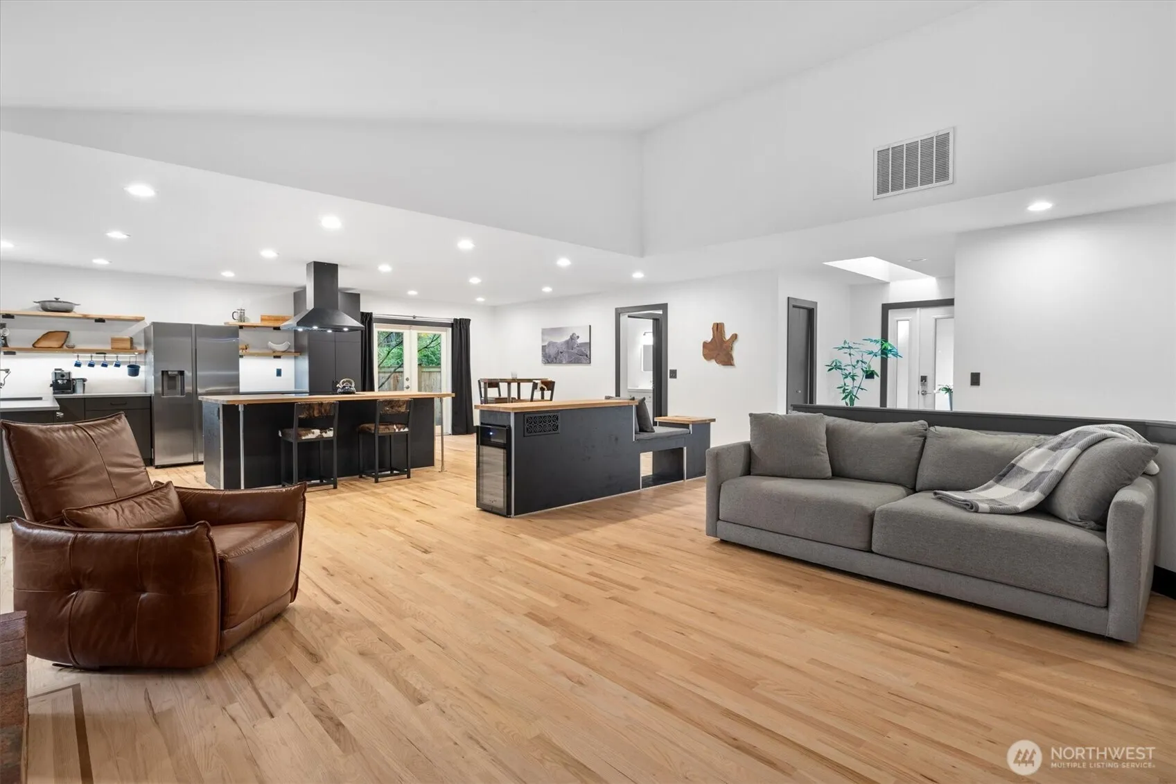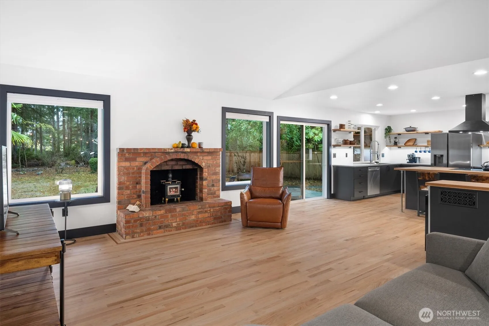 Experience modern Northwest living at its finest in this beautifully remodeled home nestled on a serene 1/3-acre lot in coveted Sunrise Trace. Recent upgrades include new windows, exterior doors, gutters, EV charger, furnace, hot water heater, and fencing. The bright, vaulted great room features skylights, recessed lighting, and a new wood-burning stove with brick surround. Enjoy refinished oak hardwoods and upgraded trim throughout. The chef’s kitchen boasts quartz counters, open shelving, island, and all-new stainless steel appliances with induction cooktop. Primary suite offers dual closets with custom built-ins and a spa-style bath. Private yard with patio, raised garden beds, water feature, and mature trees.