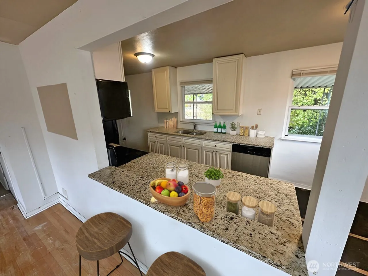 With nearly 2,000 square feet, this 4-bedroom, 2-bathroom home combines comfort and modern updates. The renovated galley kitchen boasts sleek granite countertops, newer cabinetry, and stainless steel appliances. Rest easy on the newer flooring in all bedrooms. The fully finished basement expands your living space with a large rec/gathering space, a convenient office, and an additional bathroom. Outside, the large two-car garage and private fenced backyard are perfect for hobbies, storage, or play. Recent gas forced-air furnace means peace of mind for years to come.