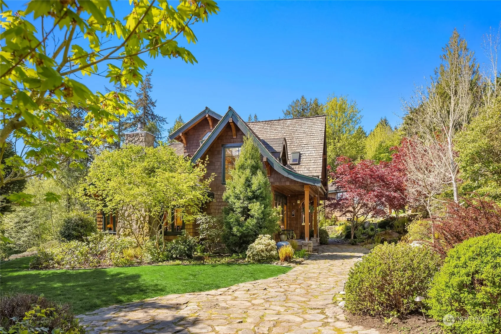 Discover this quintessential Bainbridge Island home, nestled on the sunny south slope of Baker Hill, with commanding views of Mt Rainier and the marine traffic of Rich Passage. Situated on 1.25 acres and surrounded by mature landscaping, privacy and tranquility are guaranteed, although Lynwood Center and Gazzam Lake trails are minutes away. Secluded in a quiet neighborhood on a dead-end street, this three-bedroom, 2.5-bathroom residence exudes charm and quality. Extensive wood millwork and attention to detail are evident throughout. In addition to the cook’s kitchen and stunning living room, enjoy a delightful main floor sunroom, lower level bonus room, and dedicated media room. One of a kind, this enchanting home will steal your heart!