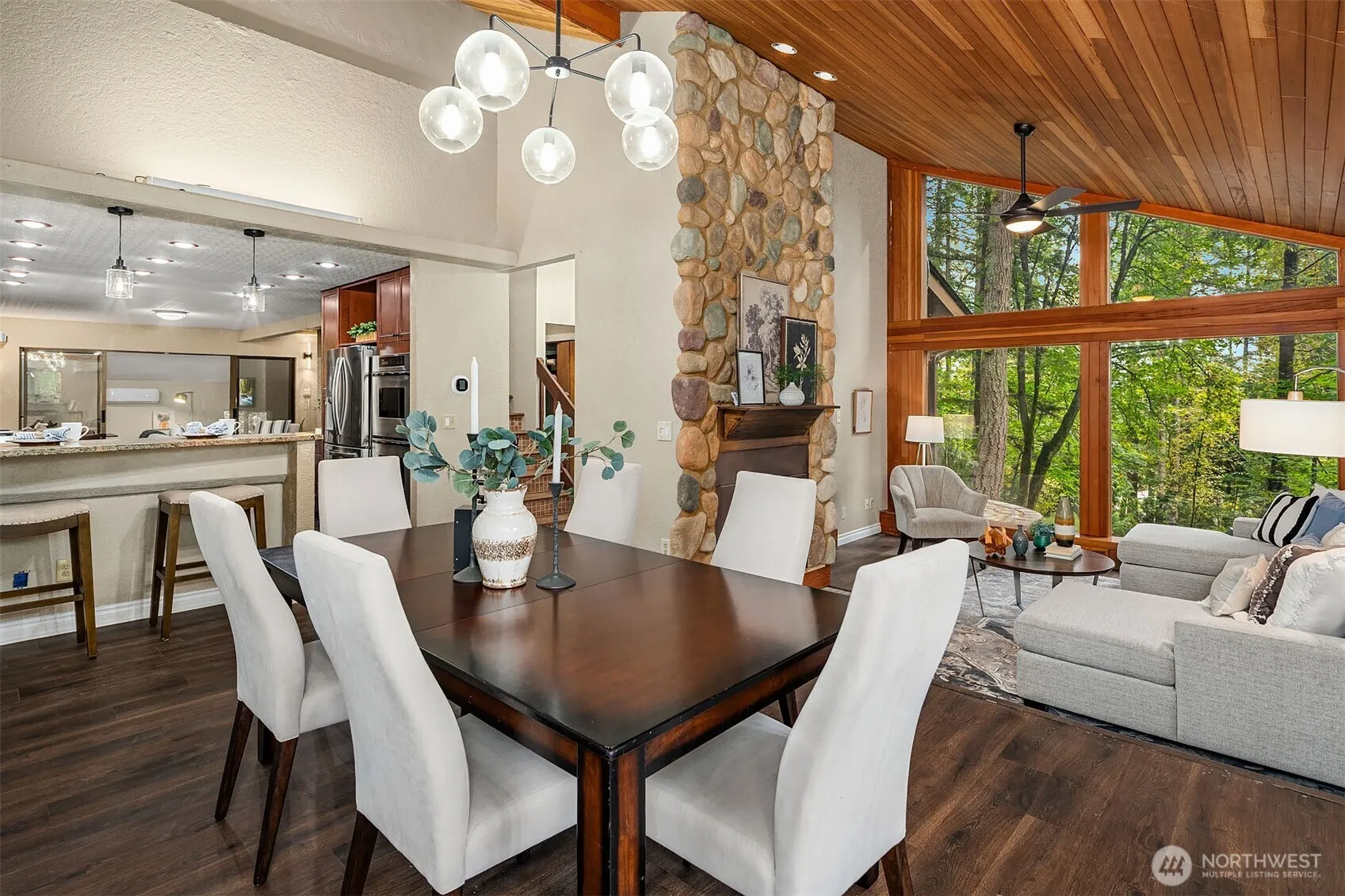 Inviting Northwest contemporary home in desirable Mirrormont. Wooded and wonderful with an expansive deck and screened porch to enjoy nature year-round. Recently updated with a new roof, fresh interior, and exterior paint in 2025, the home features a gourmet kitchen with high-end appliances, including a Wolf 6-burner range and Thermador double ovens. Spacious dining room with deck access. A charming river rock gas fireplace warms the living room with expansive windows looking out to the stunning evergreens. The primary suite offers vaulted ceiling, updated double-vanity 3/4 bath, and walk-in closet. Enjoys direct access to the upper deck and sky bridge to the upper yard with a fire pit. Highly regarded Issaquah Schools.
