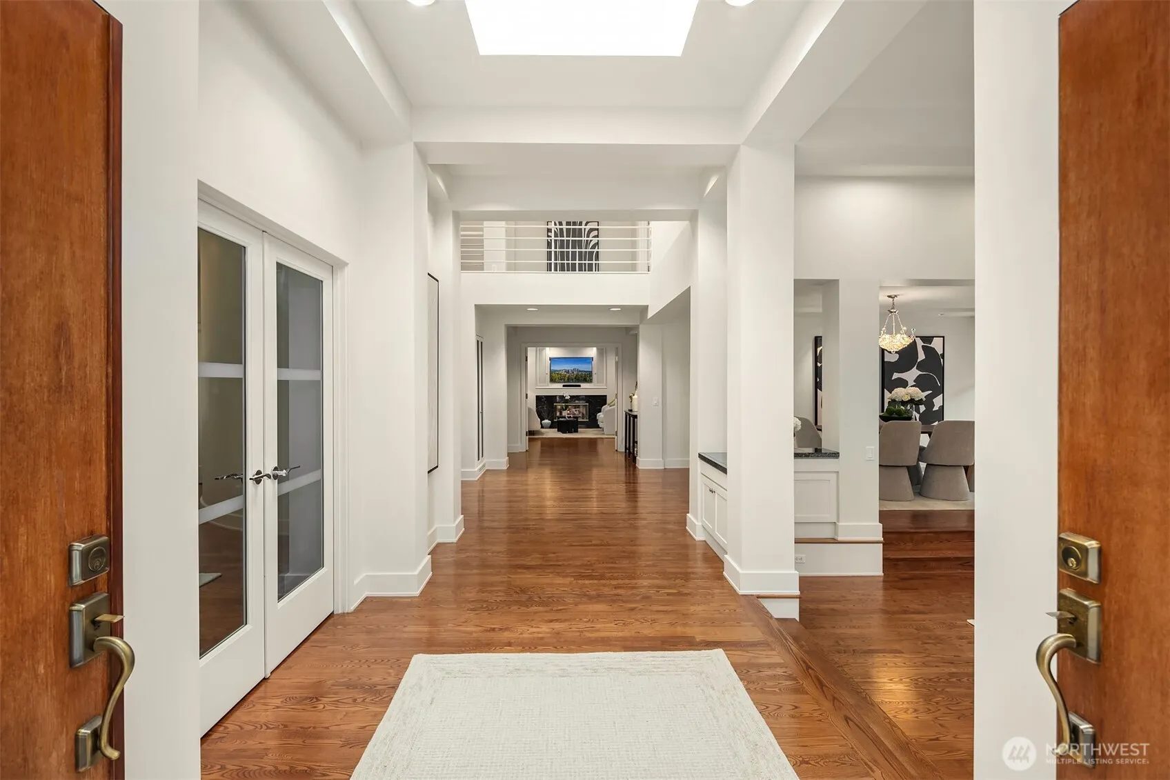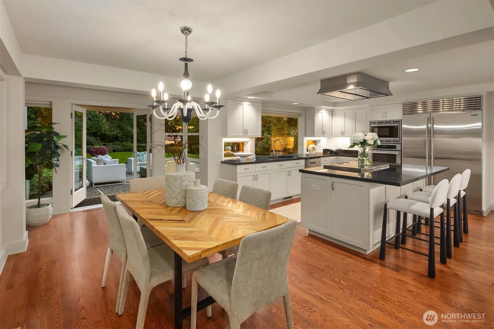 Privately nestled on Evergreen Pt Rd, this timeless Medina modern home welcomes you with a grand entrance and thoughtful architectural design. The open floor plan is designed to flow effortlessly for everyday living, while enhancing the connection to the private, tranquil setting, perfectly framing a delicate peek-a-boo view of the lake. A glass-covered atrium frames the outdoor kitchen, creating a stunning all-season space for entertaining. A versatile main-floor bedroom offers flexibility as a guest retreat, a spacious den features custom bookshelves, a cozy fireplace & rich hardwood floors. The kitchen features classic details, a spacious eating area, and top-of-the-line stainless steel appliances. Serene, refined & endlessly inviting.