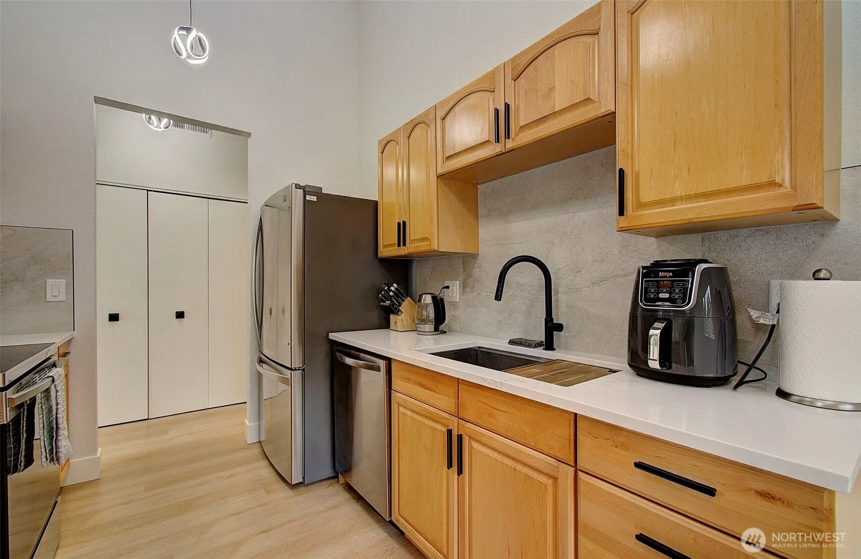 Welcome to this beautifully updated condo, where all the hard work has been done for you. The space has been refreshed with new flooring, paint, base trim, and modern tile. The kitchen and bathroom feature sleek new countertops, a stylish vanity, and added shelving. Enjoy the recently replaced toilets and the cozy fireplace in the spacious family room with vaulted ceilings, leading to a large deck perfect for relaxing. The master suite offers two closets and a bathroom with a shower and double sink. With a new electrical panel (2021), vinyl windows, a detached garage, and a convenient location off Hwy 99 near I-5, this condo is move-in ready and waiting for you.