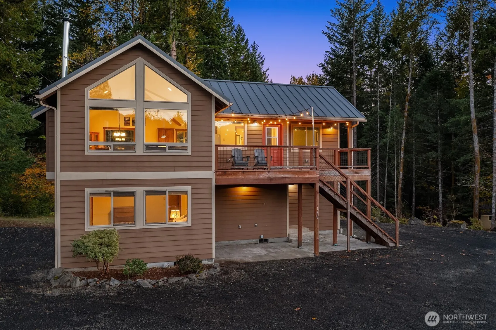 Turnkey 2011-built cabin with expansive views of Mt. Rainier, Butter Peak, and the Tatoosh Range, located in the popular Skyline neighborhood, a quarter mile from the dining and shopping of Packwood’s town center. You’ll love the open concept upper level with lofted beam ceilings. Prepare a meal with friends while the wood burning stove creates an incredibly relaxing cabin vibe. With a bed, bath, and gathering room on each floor, and a 3-bed septic, there is plenty of room for the whole crew. Built for durability with a metal roof and cement plank siding. Store gear for all seasons in the mini-garage. Follow the lighted path and gather around the outdoor firepit. Tons of firewood included in two massive fire sheds and sold mostly furnished.
