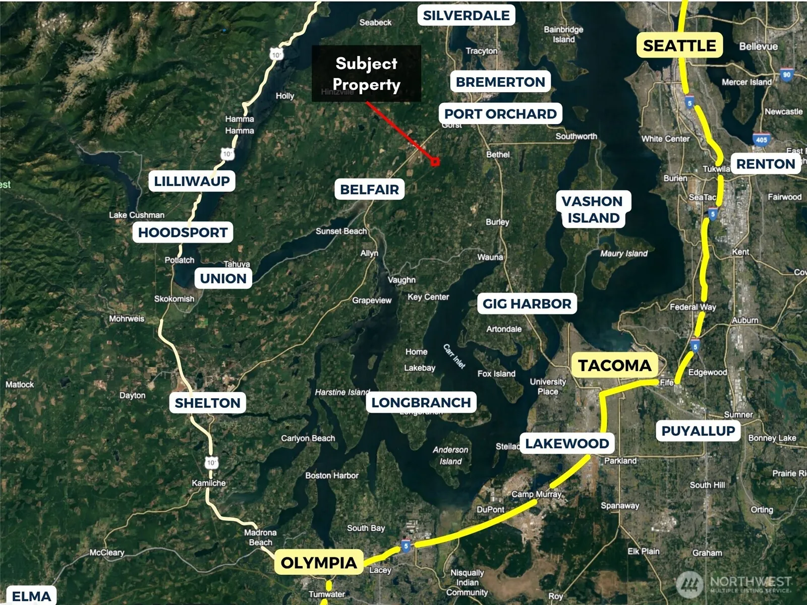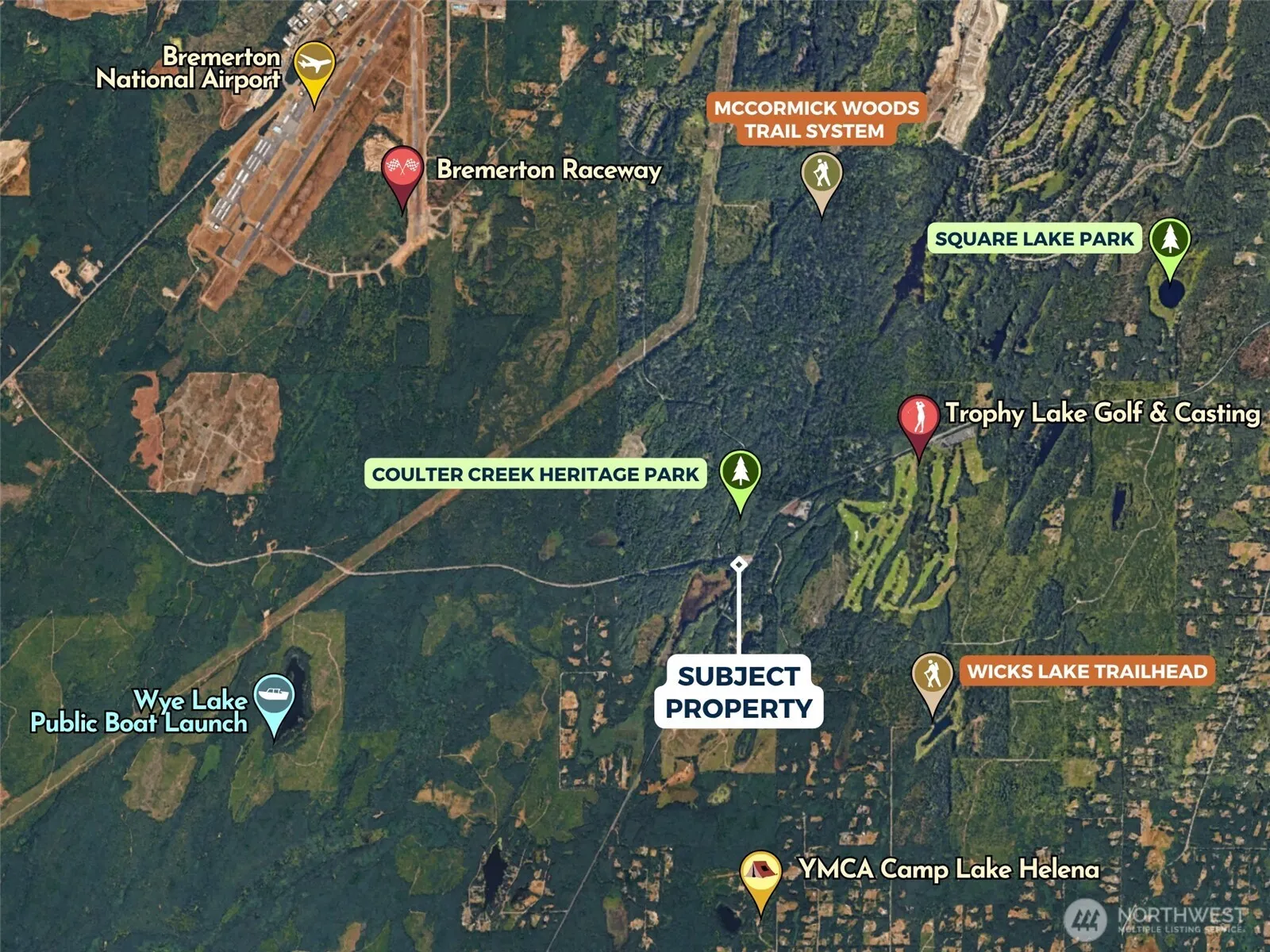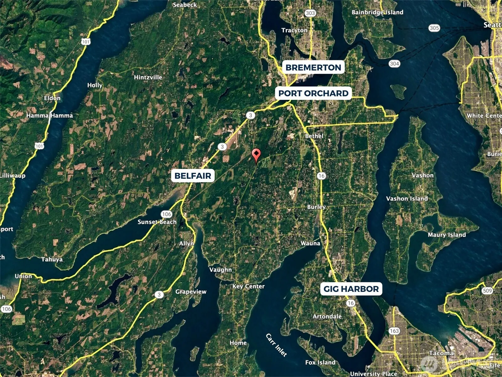2.75 acres between Port Orchard & Belfair. This parcel borders a private lake or pond that attracts waterfowl and is rumored to contain fish. Lot is forested with fir trees and offers both privacy & timber value to help offset development costs. Electric is at the street. Well depth is anticipated to be around 100 ft and the gravelly sandy loam soils are expected to percolate well for septic installation. Mostly level terrain. About 5 mins from WA-3 and 10 mins from WA-16 for easy commuting. Coulter Creek Heritage Park is right across the street & Trophy Lake Golf Course is only 2 mins away. There are several other recreation options nearby like McCormick Woods Trail System, Wye Lake Boat Launch, & Bremerton Raceway.