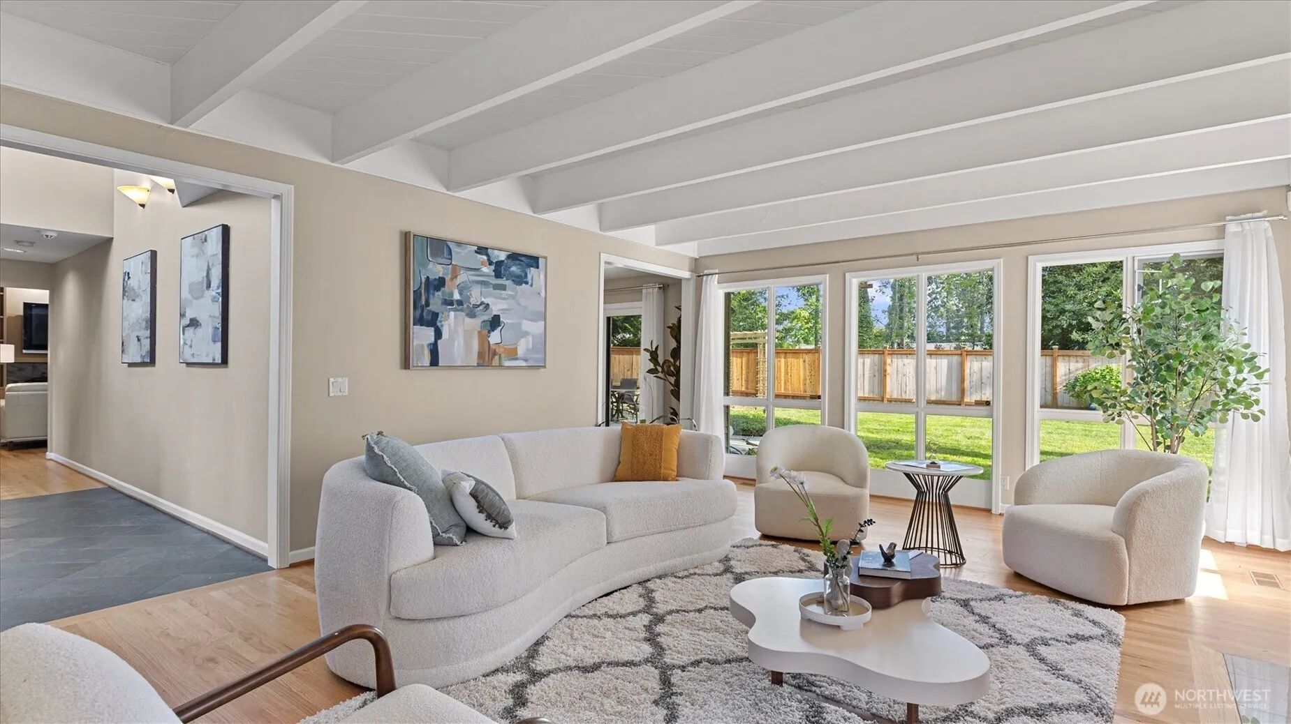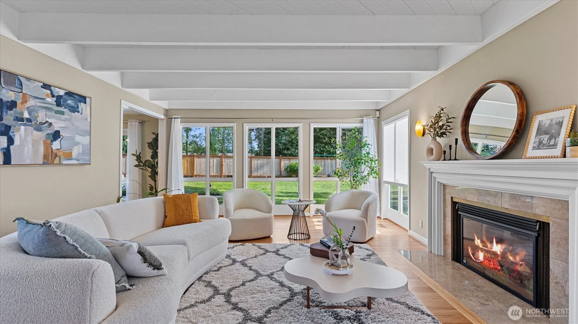 Tucked away in lush, mature landscaping, this home offers exceptional privacy with effortless access to Bellevue, Kirkland, and Seattle. A classic two-story layout features formal living and dining rooms, plus a spacious great room with a modern kitchen, family room, and casual dining area. The main floor also includes a generous bonus room and a stylish powder room. Upstairs, find four bedrooms and 1.75 baths, including a vaulted primary suite with skylights, a luxurious en-suite, and an expansive custom walk-in closet. The outdoor setting is a true retreat—peaceful, private, and perfect for everyday escape. Top rated Bellevue schools. New heat pump offers heating and cooling was just installed.