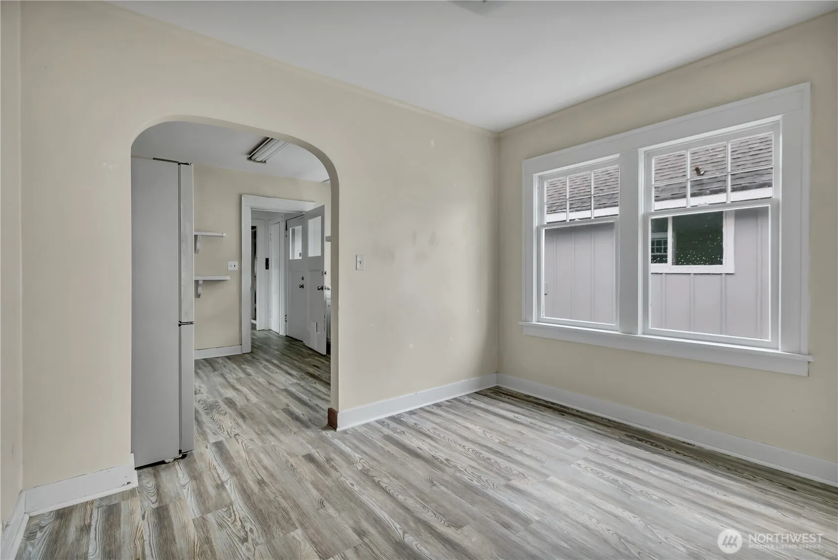 Hurry on this AFFORDABLE home w/so much space. Main level w/laminated floors thru out. 3 bedrooms with 2 on main level and upstairs has bedroom and loft type area great for books, desk area, etc. The home has a large Living room and Bonus room in rear of home which gives nice separate living spaces. Formal dining room off of kitchen. Owner has created rustic feel w/the unique wood patters on some walls. Easy to Sheetrock & make traditional or whatever one might want..The garage door is too small for car. Might be possible to put in door to create Garage parking.Buyer may need to verify for sure, but offers LG SHOP area as is. There is lots of off street parking in long driveway as well as street parking. The fenced yard has garden beds.