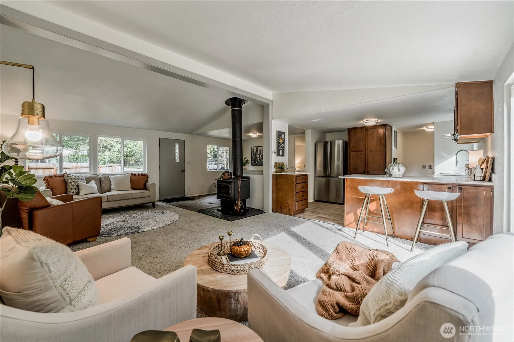 Bright & Cozy Updated 3 BD 1.75 BA Home on Secluded 1/3 acre lot. Large Living Room W/ Vaulted Ceilings, Stand Alone Wood Stove. Primary Bedroom W/ Dual Vanity Under-mount Sinks & Quartz Counters & New Shower Surround. Updated Kitchen includes New soft Close Cabinets, SS Refrigerator, Electric Range, Dishwasher, Quartz Counters & Eating Bar. New Vinyl Windows, New Int. & Ext. Paint, Some New Doors & Trim, New LVP Flooring and Carpets. Updated Front & Back Decks. Large Flat Back Yard. Circular Driveway. RV Parking. 400+ sq ft Garage W/ New Roof. New Hot Water Tank and Electric Furnace. New Insulation & Vapor Barrier in Crawl. New Roof on the House. New PEX Plumbing in the Entire House. Fully Permitted Updates.