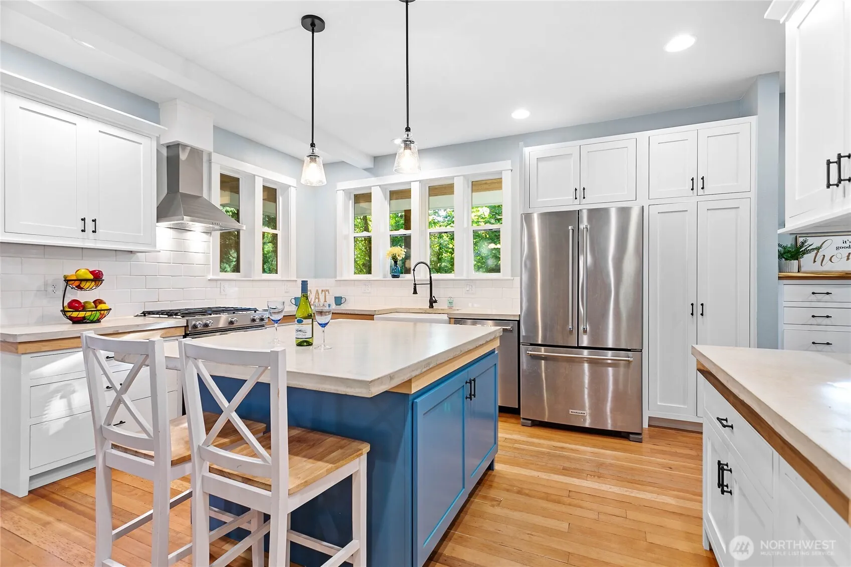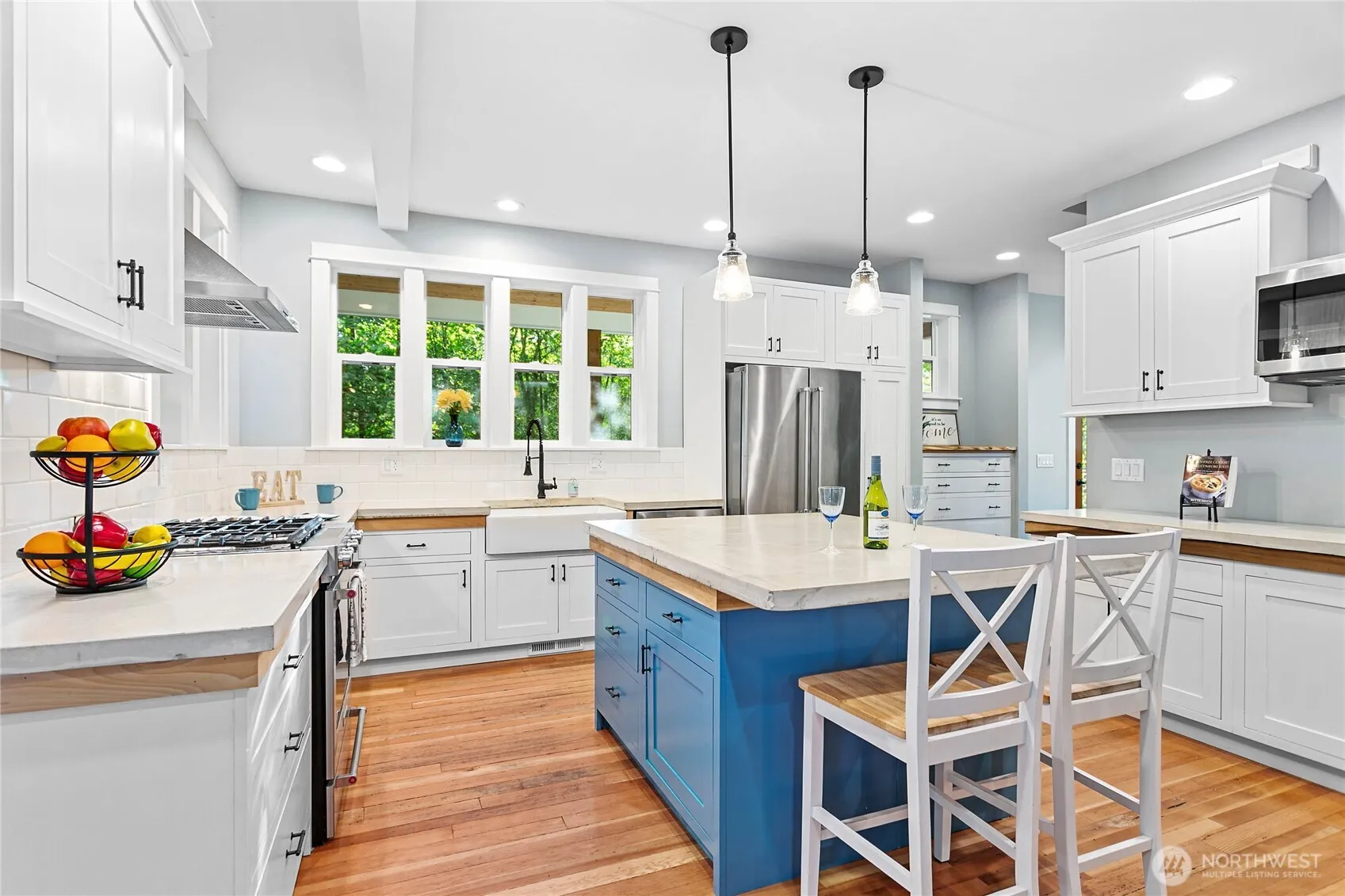 Welcome to your peaceful oasis! This custom-built home boasts a covered wrap-around deck to enjoy! Walk into the large entryway w/closet. Enjoy the beautiful kitchen w/tons of natural light, stainless steel appliances, cabinetry w/inset doors, massive island w/concrete countertops & seating! The dining room is open to the kitchen & living room for easy entertaining. Gorgeously refurbished 100 yr-old fir floors throughout most of the main level! The primary bdrm is quite large w/walk-in closet & primary bath w/walk-in tile shower! All of the main level has 9′ ceilings. Upstairs you’ll find 2 large bdrms w/walk-in closets, fun family room & full bathroom. The 32’x26′ garage has 10′ ceilings – shelving and workbenches. Rv Space & room to roam!